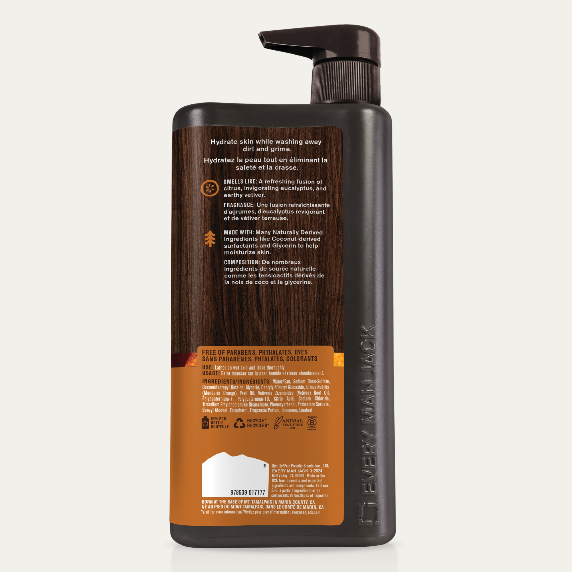 | Ingredients Statement | Water/Eau, Sodium Coco-Sulfate, Cocamidopropyl Betaine, Glycerin, Caprylyl/Capryl Glucoside, Citrus Nobilis (Mandarin Orange) Peel Oil, Vetiveria Zizanioides (Vetiver) Root Oil, Polyquaternium-7, Polyquaternium-10, Citric Acid, Sodium Chloride, Trisodium Ethylenediamine Disuccinate, Phenoxyethanol, Potassium Sorbate, Benzyl Alcohol, Tocopherol, Fragrance/Parfum, Limonene, Linalool |