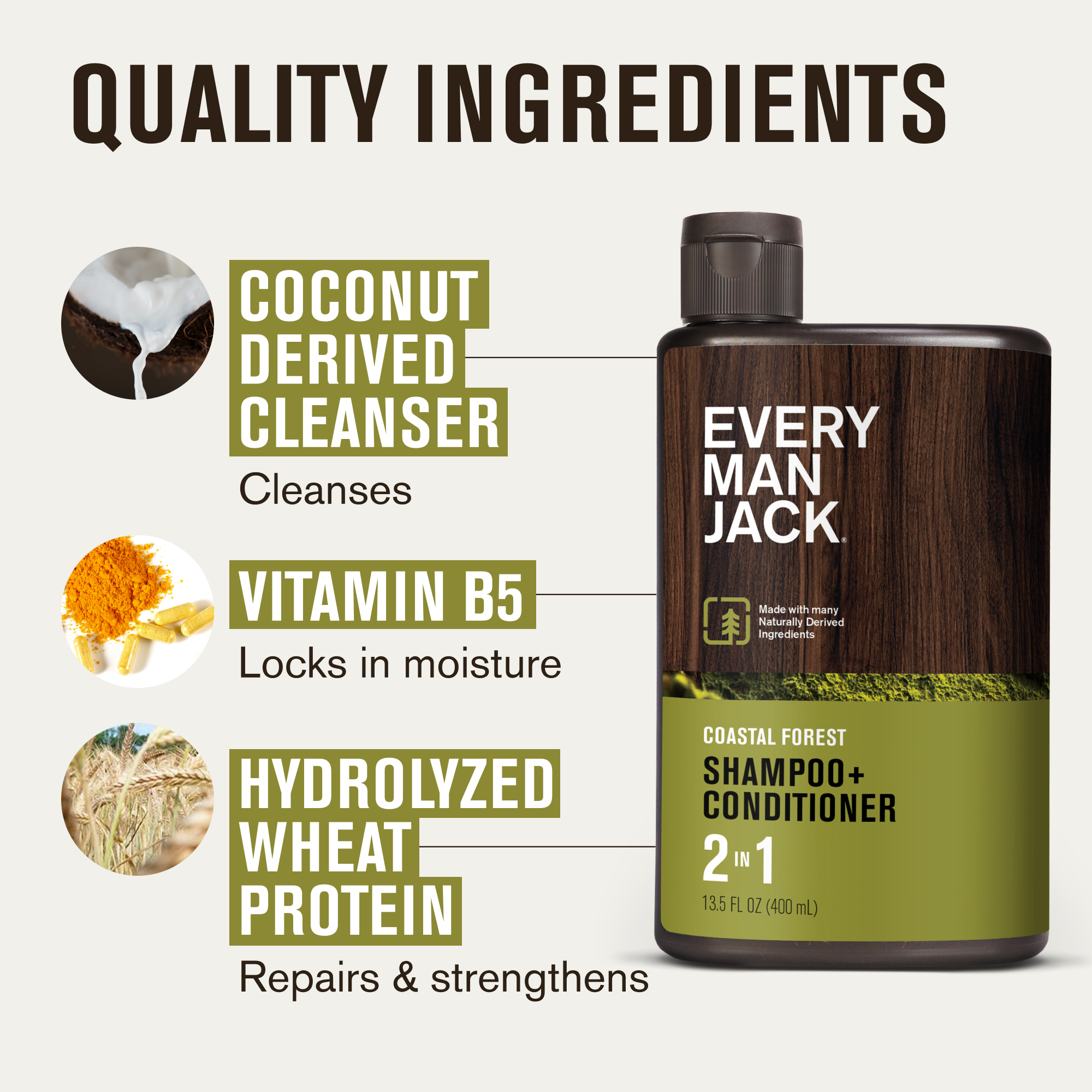 | Ingredients Statement | Water/Eau, Sodium Coco-Sulfate, Cocamidopropyl Betaine, Caprylyl/Capryl Glucoside, Cetrimonium Chloride, Glycol Stearate, Glycerin, Hydrolyzed Wheat Protein, Panthenol (Vitamin B5), Vetiveria Zizanoides (Vetiver) Root Oil, Juniperus Virginiana (Cedarwood) Oil, Polyquaternium-7, Polyquaternium-10, Guar Hydroxypropyltrimonium Chloride, Trisodium Ethylenediamine Disuccinate, Citric Acid, Sodium Chloride, Phenoxyethanol, Benzyl Alcohol, Tocopherol, Potassium Sorbate, Fragrance/Parfum, Coumarin, Limonene, Linalool |