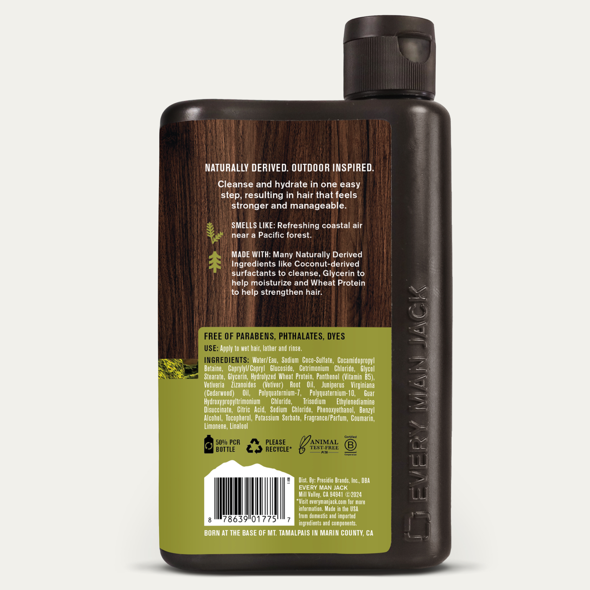 | Product Description | Naturally derived clean and conditioning. Give your hair and scalp a daily refresh with Coconut-Derived Surfactants, moisturizing Glycerin, and strengthening Wheat Protein. We packed all that into one simple product to make your morning routine as simple as possible. Bring the smell of an early morning hike with you wherever you go. Earthy Vetiver dominates this scent with a refreshing coastal Citrus finish. |