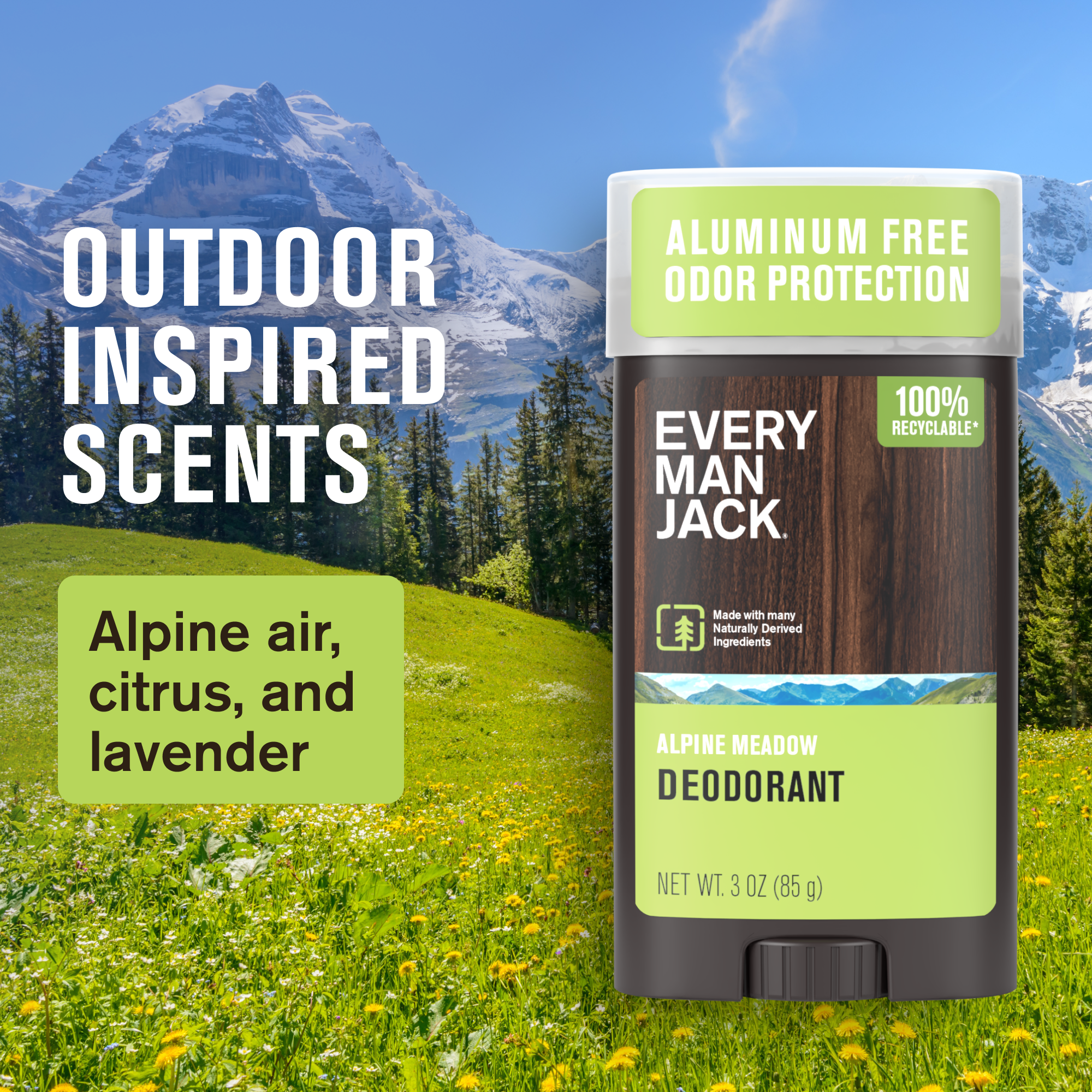 Every Man Jack Alpine Meadow Men’s Deodorant - Stay Fresh with Aluminum Free Deodorant For all Skin Types - Odor Crushing, Long Lasting, with Naturally Derived Ingredients - 3 oz