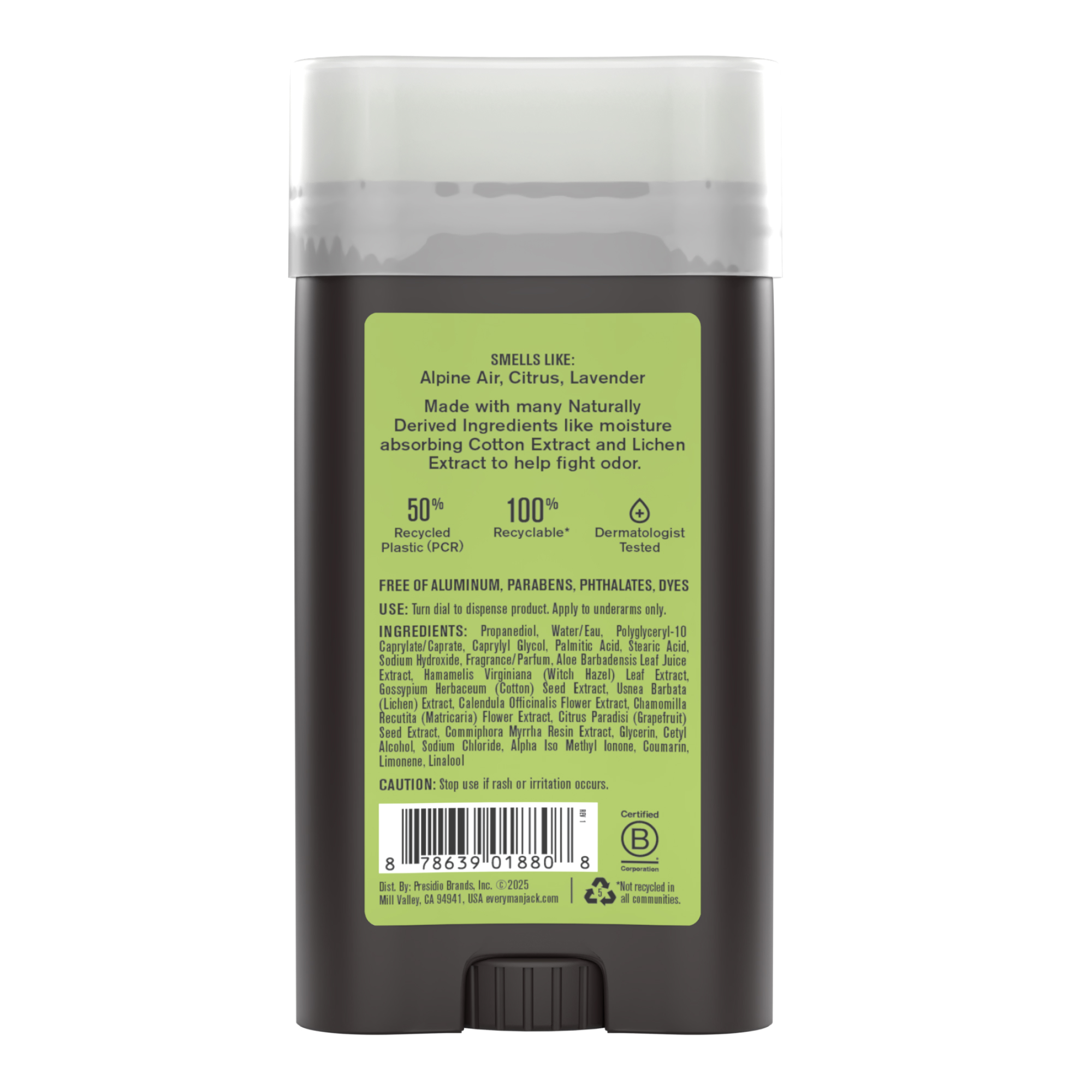 | Product Description | Long-lasting odor protection for every skin type. Each stick is packed with moisture absorbing Cotton Extract and Lichen Extract to help fight odor while corn-derived propanediol instead of aluminum conditions the skin. |