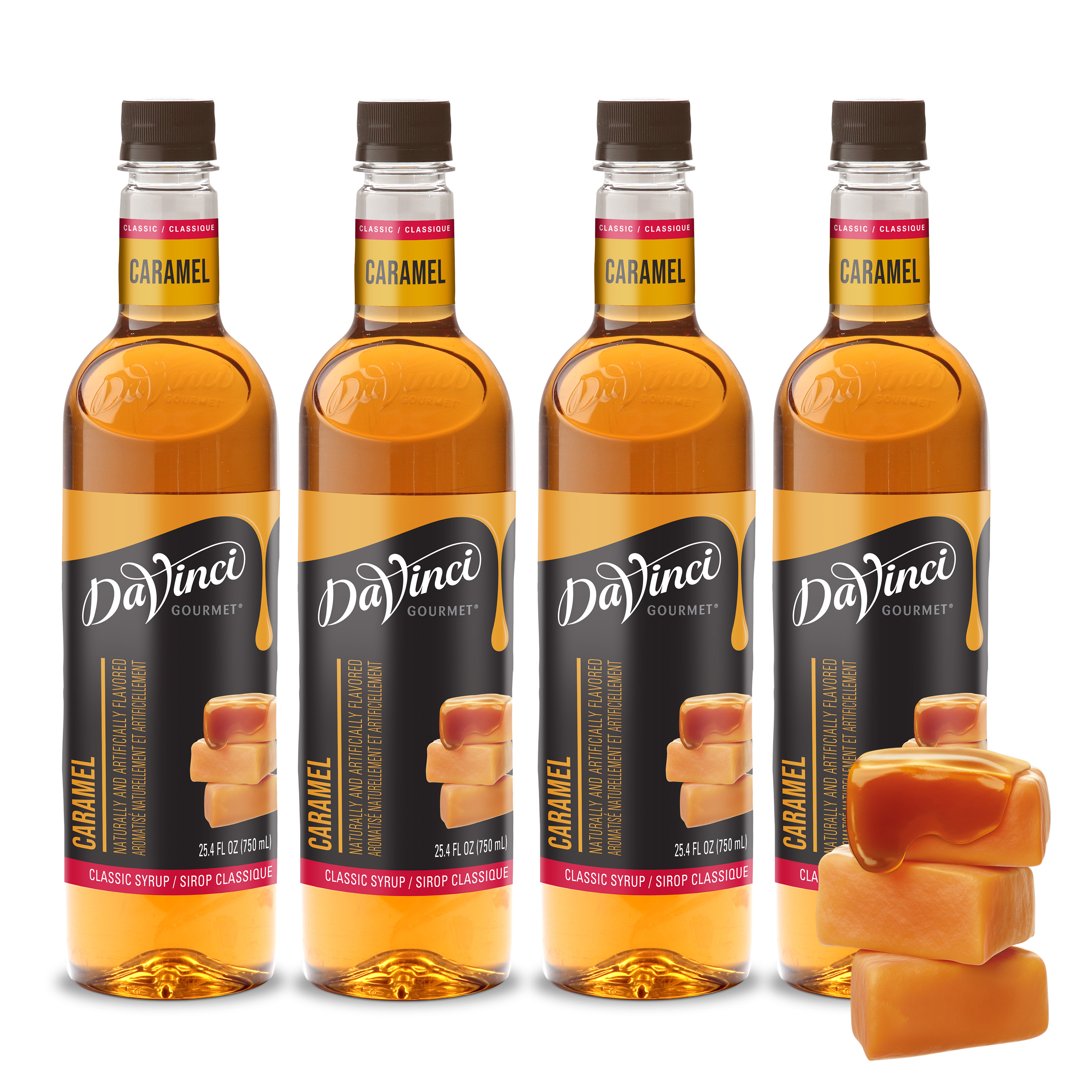 - DaVinci Gourmet Classic Caramel Syrup is crafted in small batches and contains the taste of slightly burnt sugar for authentic flavor inspired by classic candy caramels. DaVinci Gourmet syrup is made with the finest ingredients like pure cane sugar and natural flavors to ensure incomparable flavor and quality with every sip. Create classic pairings with chocolate, vanilla or nuts when you add a drizzle of our caramel syrup to coffee, cocktails or desserts. DaVinci Gourmet’s lineup of classic and seasonal coffee syrups are made to easily add flavor to a variety of beverage and culinary applications.. DaVinci Gourmet Classic Caramel Syrup resists curdling in dairy products, perfectly holds its flavor in hot and cold beverages and is Kosher-Pareve certified.