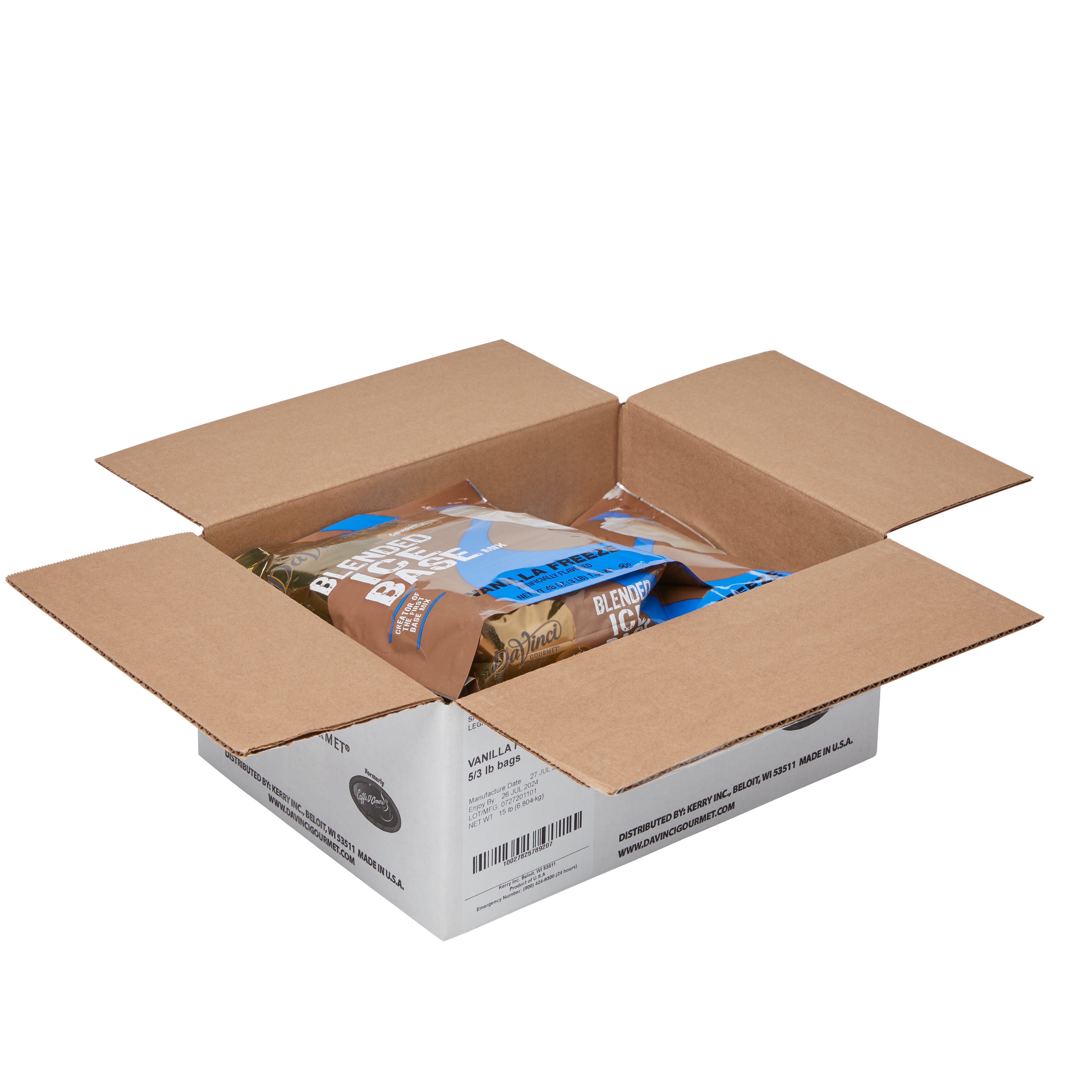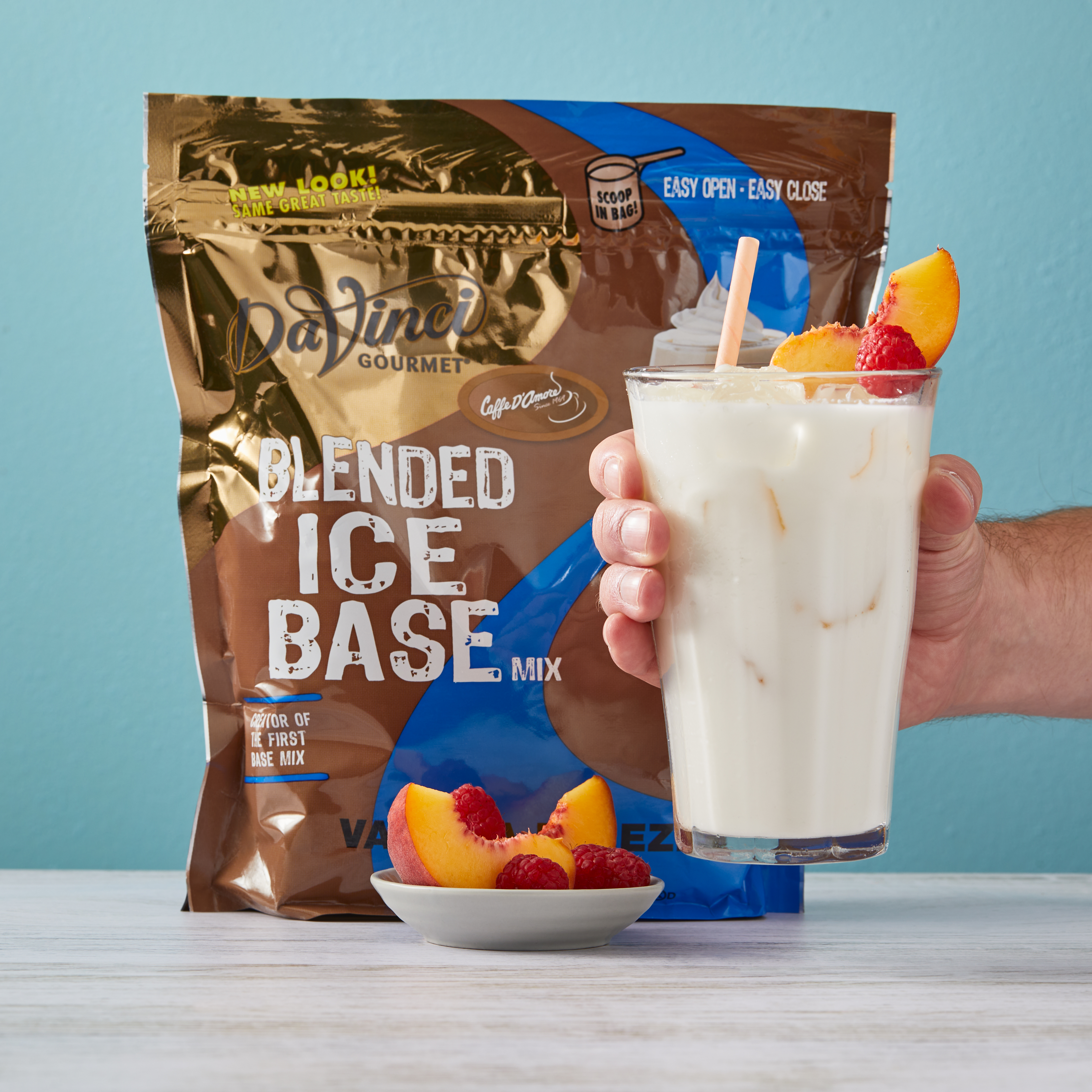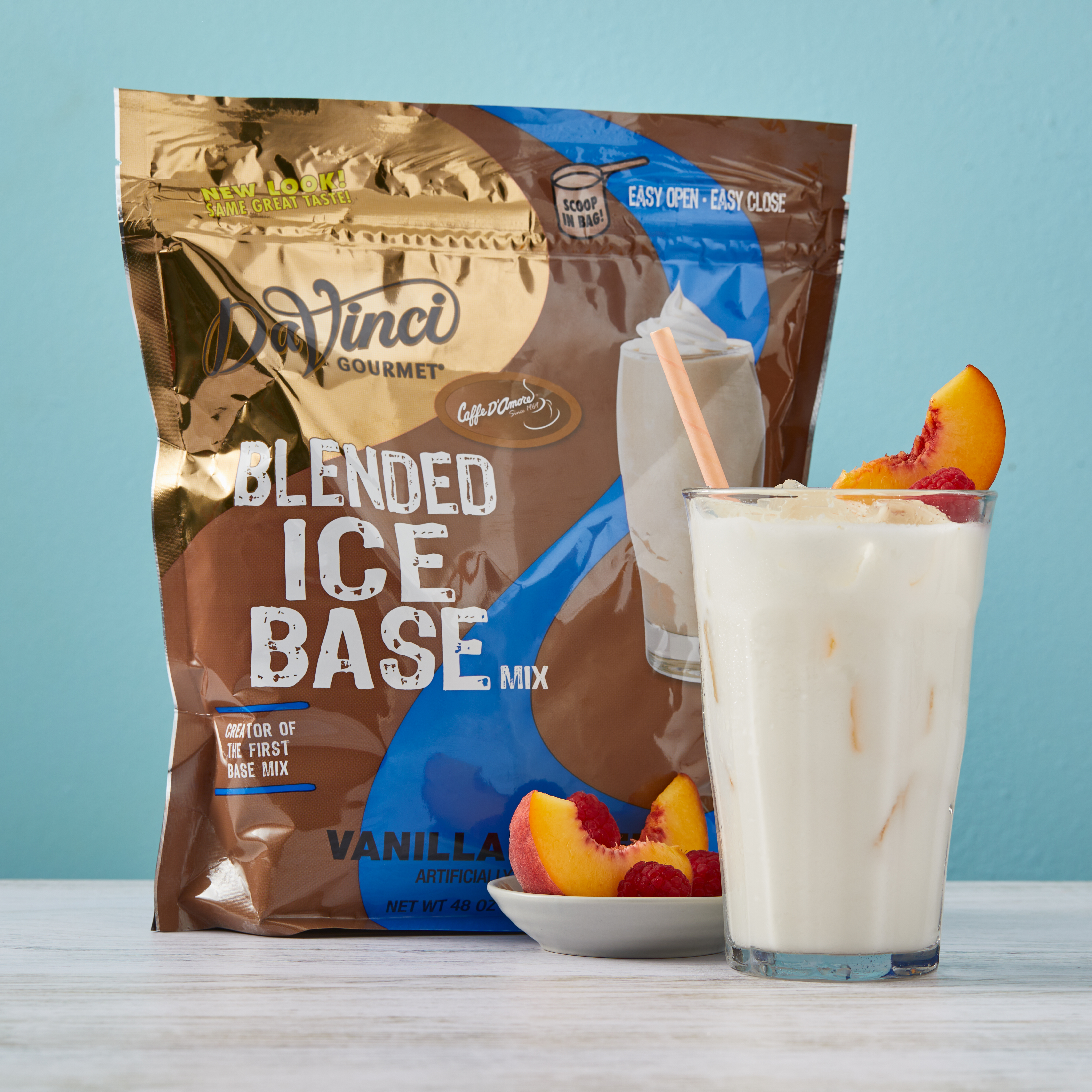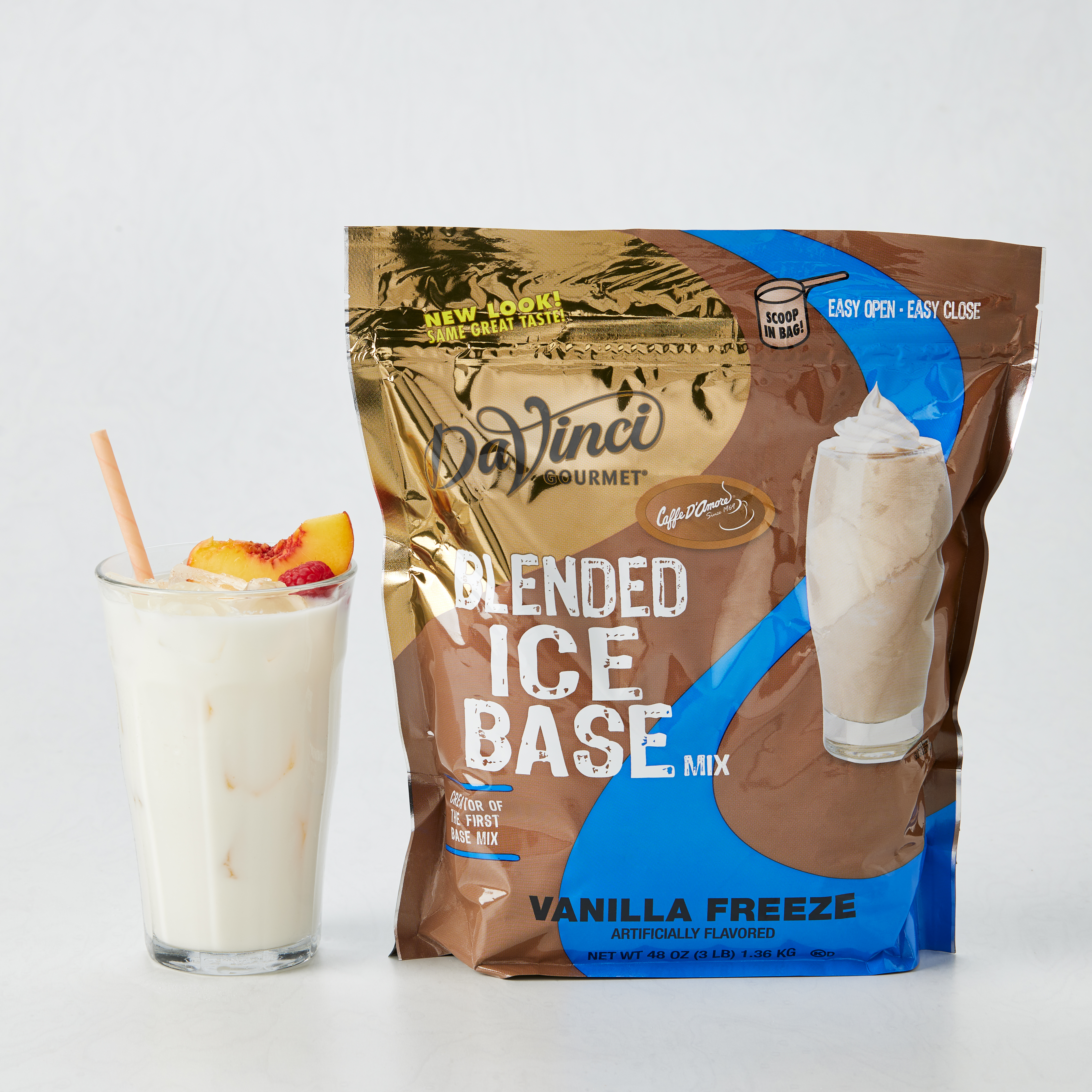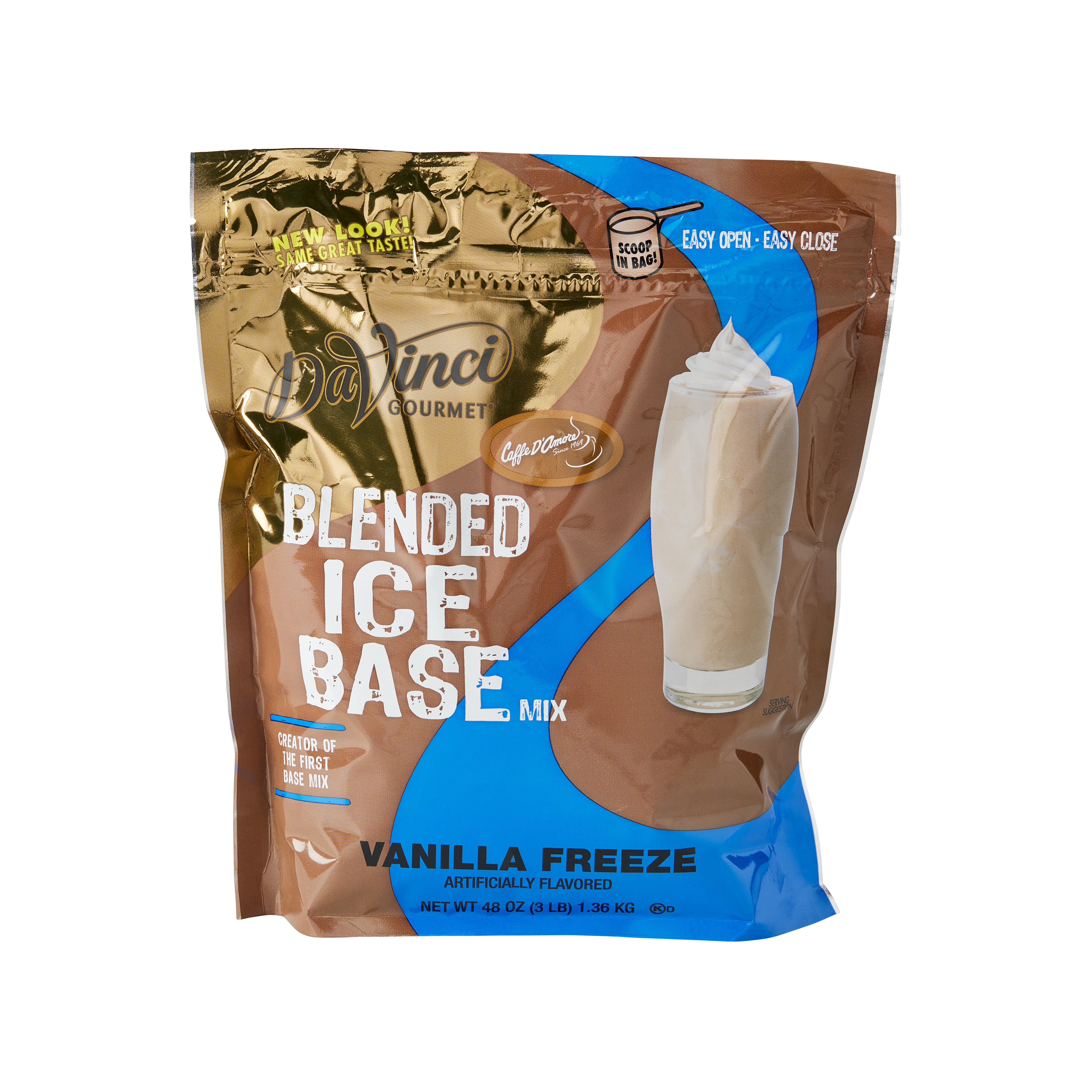 - Aromatic, versatile sweet vanilla flavor is the focus of our extra-creamy Vanilla Freeze Blended Ice Base mix. Our coffee-free, caffeine-free vanilla mix delivers mellow sweetness and smooth, velvety texture to a variety of beverages. At DaVinci Gourmet, we source the highest-quality ingredients and carefully blend them for incredible flavor and incomparable texture. Traditional but never plain, our versatile Vanilla Freeze Blended Ice Base Mix can be enjoyed alone as a delicious anytime treat. Or pair with other flavors for a custom beverage that's perfectly suited to any taste.Customize and get creative with one of our many flavored syrups, or top with whipped cream.Our Vanilla Blended Ice Base Mix is caffeine-free, coffee-free and contains 0 grams trans fats per serving.