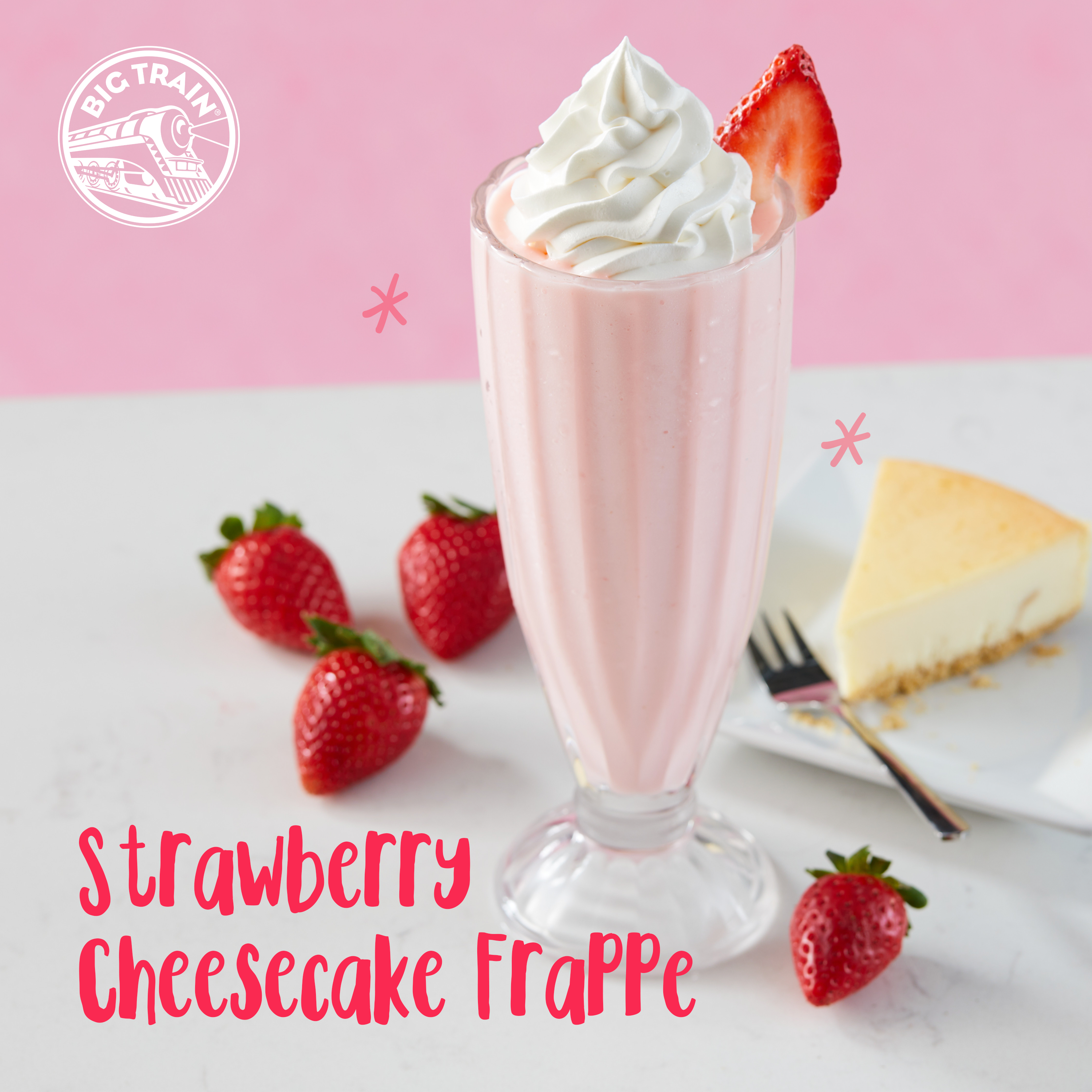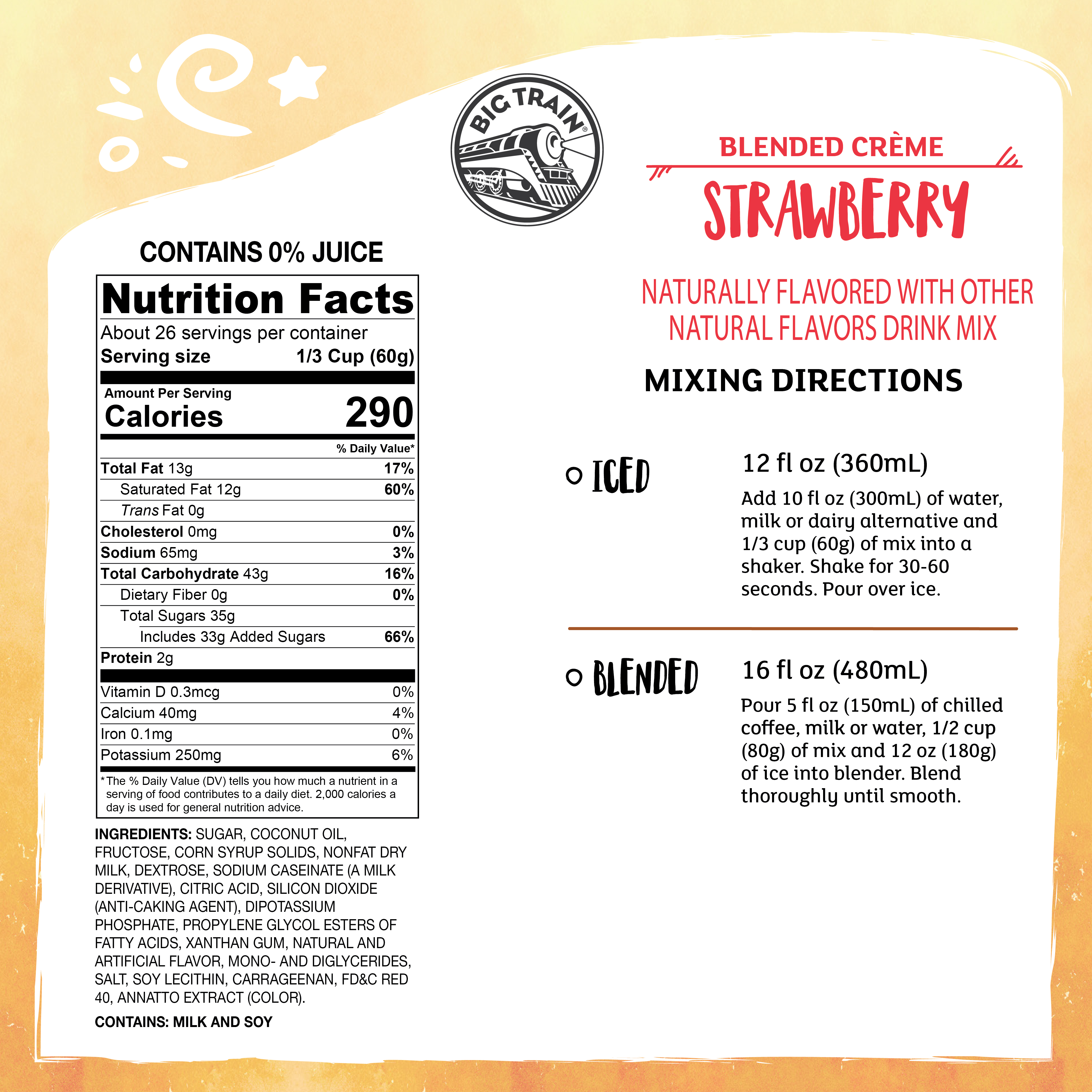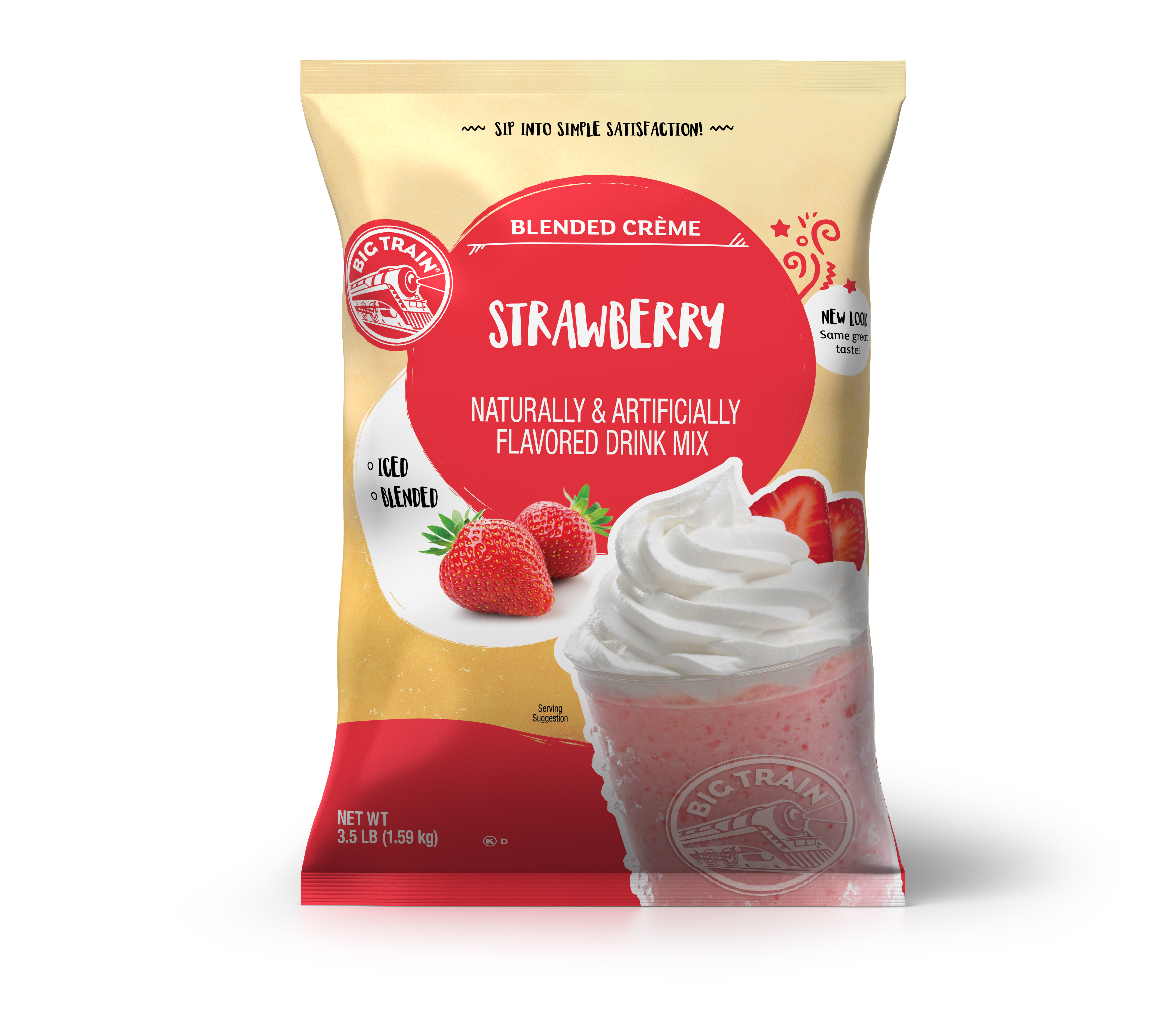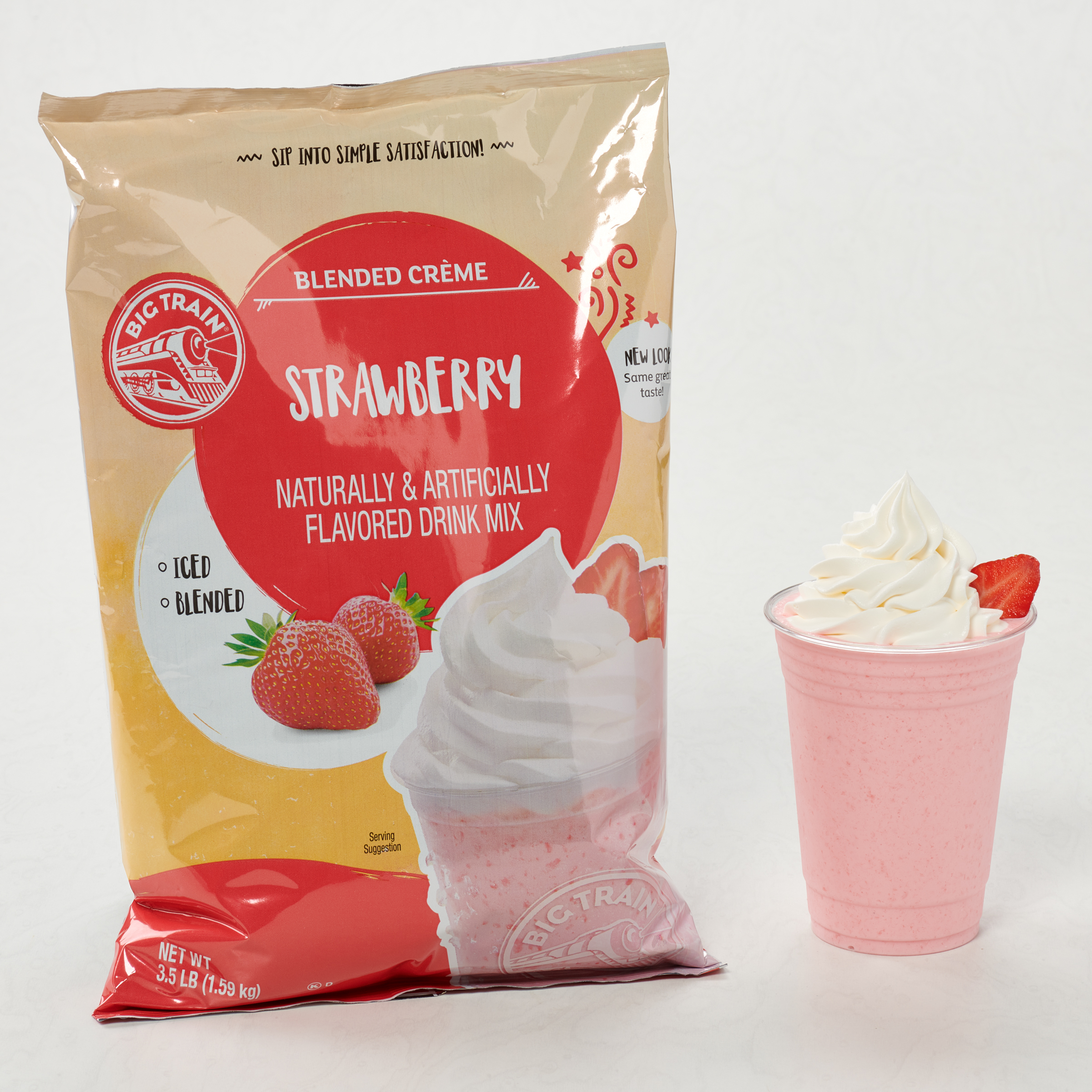 - We mix our Big Train Strawberry Blended Crème Frappe Mix’s ripe, fresh-picked strawberry flavor with a creamy base, delivering a delicious, smooth and consistent drink everyone will love. Our strawberry mix is delicious alone, or guests can indulge even more and try it topped with whipped cream for a sweeter finish. Serve hot, pour over ice or blend the frappe mix with ice for a delicious Big Train frappe that will keep guests coming back for more.