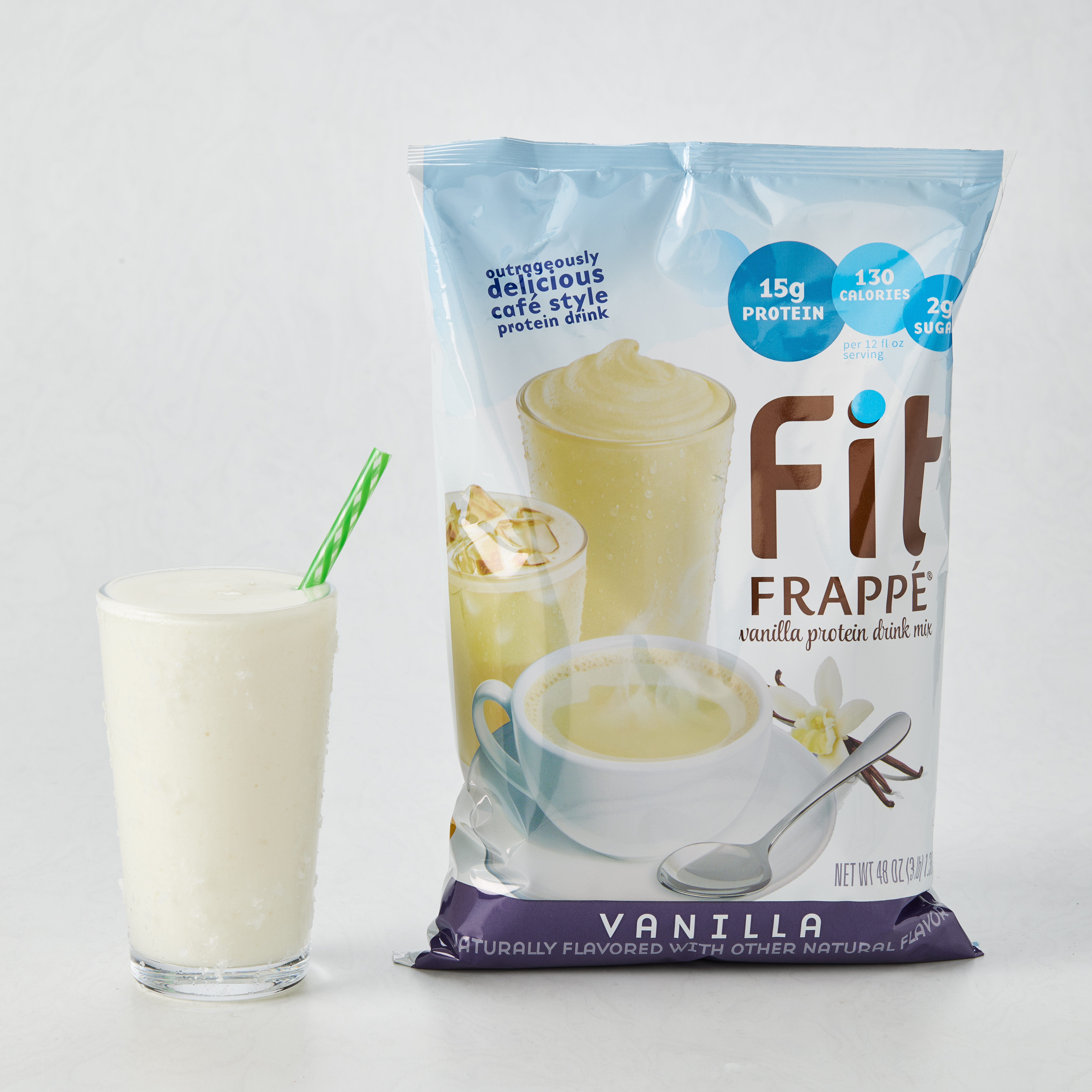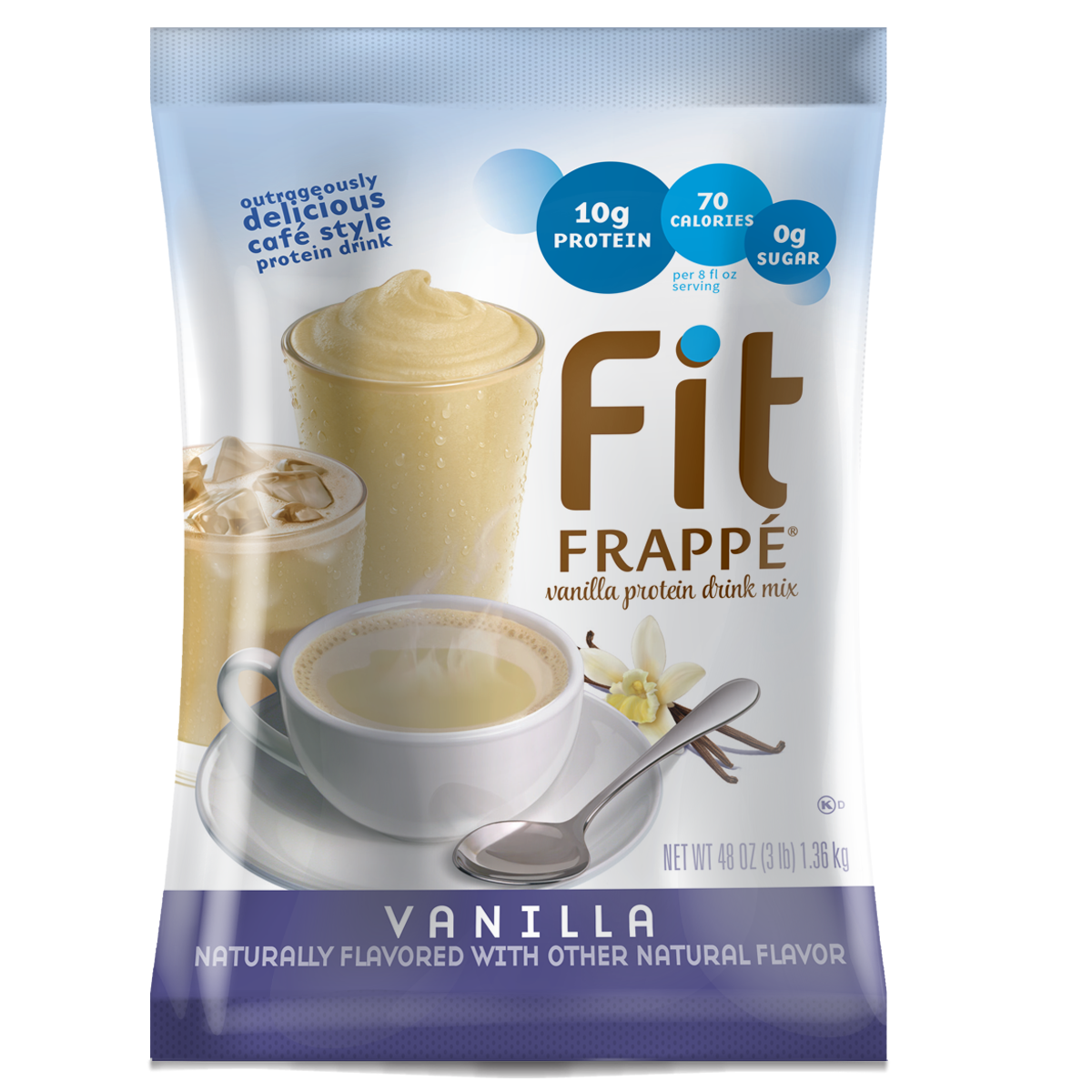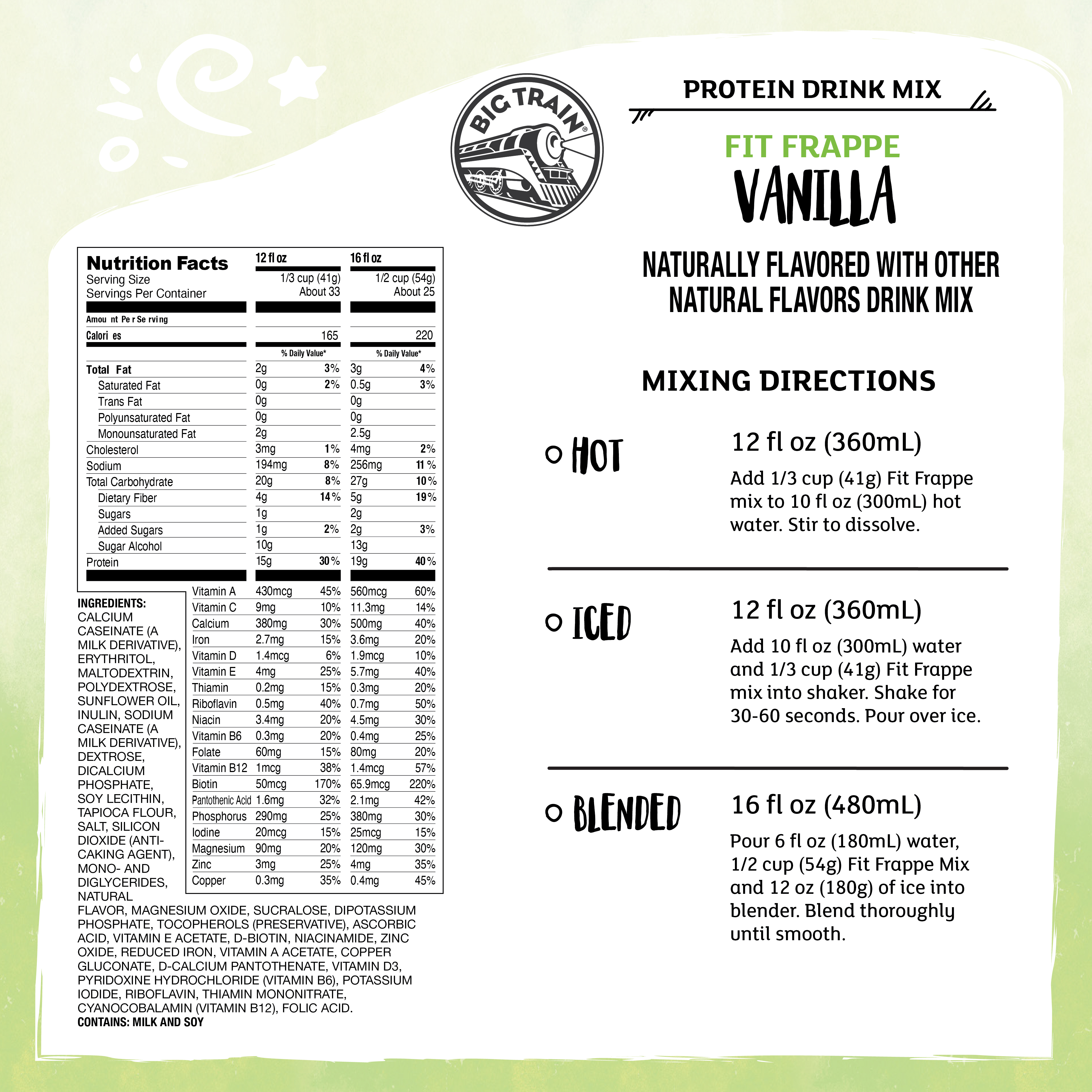 - Big Train Fit Frappe Vanilla Protein Frappe Mix combines sweet vanilla taste, vital nutrients and protein to satisfy for hours. We've carefully blended Fit Frappe with calcium caseinate, a slow-releasing protein your body can use throughout the day. Fit Frappe is loaded with 20 grams of protein, and contains only 130 calories and less than 1 gram of sugar per 16 oz. serving. Whether you drink it as an on-the-go meal replacement, filling snack or use as a base for your favorite smoothie recipe, with Fit Frappe, you can feel good about what you put in your body. Our powerhouse Fit Frappe Vanilla Protein Drink Mix is packed with vitamins, minerals and protein. It's also gluten-free and contains no added sugars. Serve hot, iced, or blended.