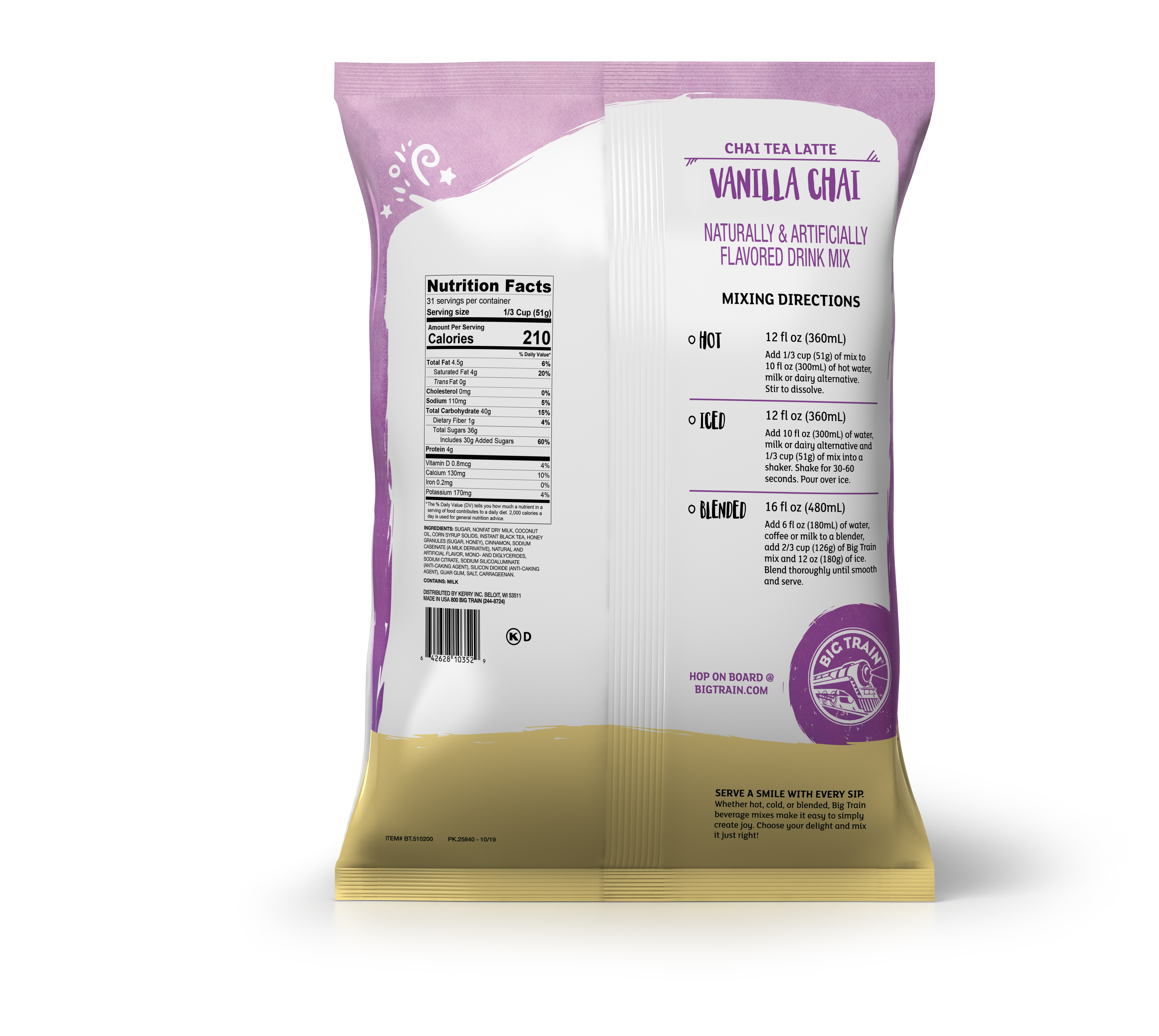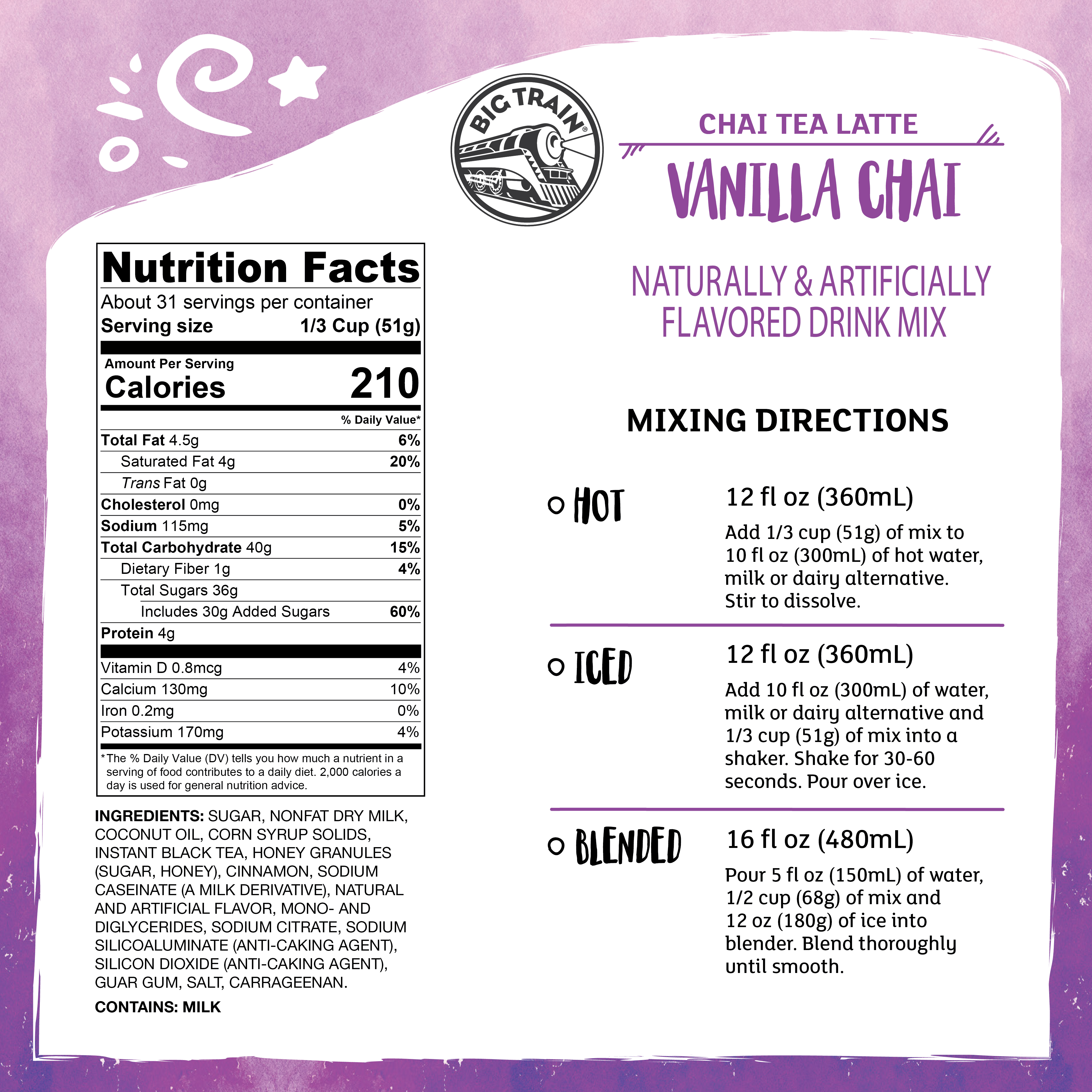 - Our Big Train Vanilla Chai Tea Latte Mix brings together just the right amount of sweet and spicy black tea, honey, vanilla and spices, creating the perfect cup of chai. This Big Train chai tea latte mix can be used to create hot, cold and blended beverages. Just add water, ice and blend to create the perfect iced vanilla chai tea latte, or simply mix with hot water for the perfect cup of chai tea. Craft your next chai beverage with Big Train Vanilla Chai Tea Latte Mix.