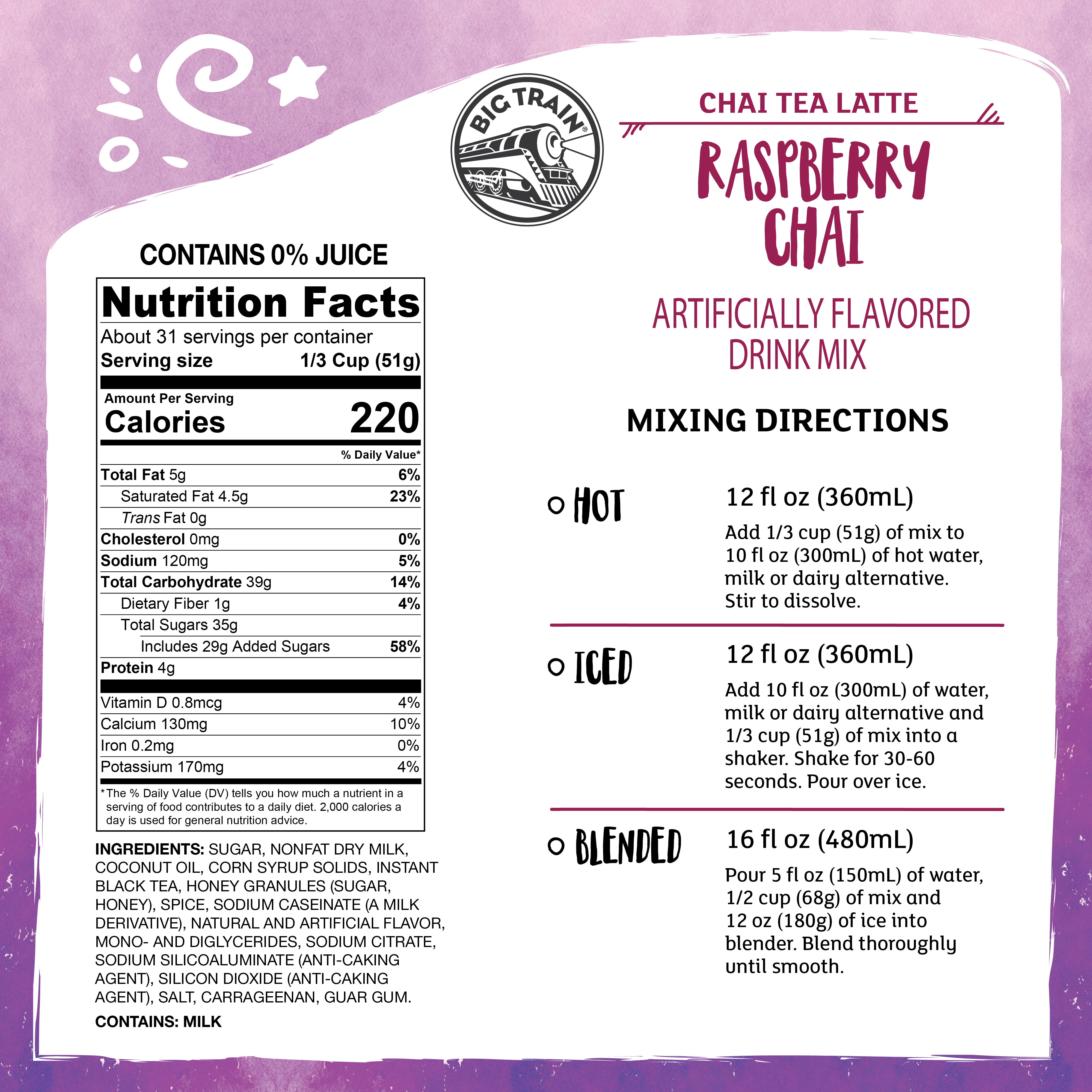 - Our Big Train Raspberry Chai Tea Latte Frappe Mix is made with a blend of raspberry, honey, black tea, and exotic spices so you can make the perfect raspberry chai tea latte in an instant. All that is needed to serve is water, ice and a blender! No refrigeration needed. Serve the Big Train Raspberry Chai Tea Latte hot, over ice or blended for a classic frappe. Customers will keep coming back for drinks made with this authentic, delicious Big Train mix.
