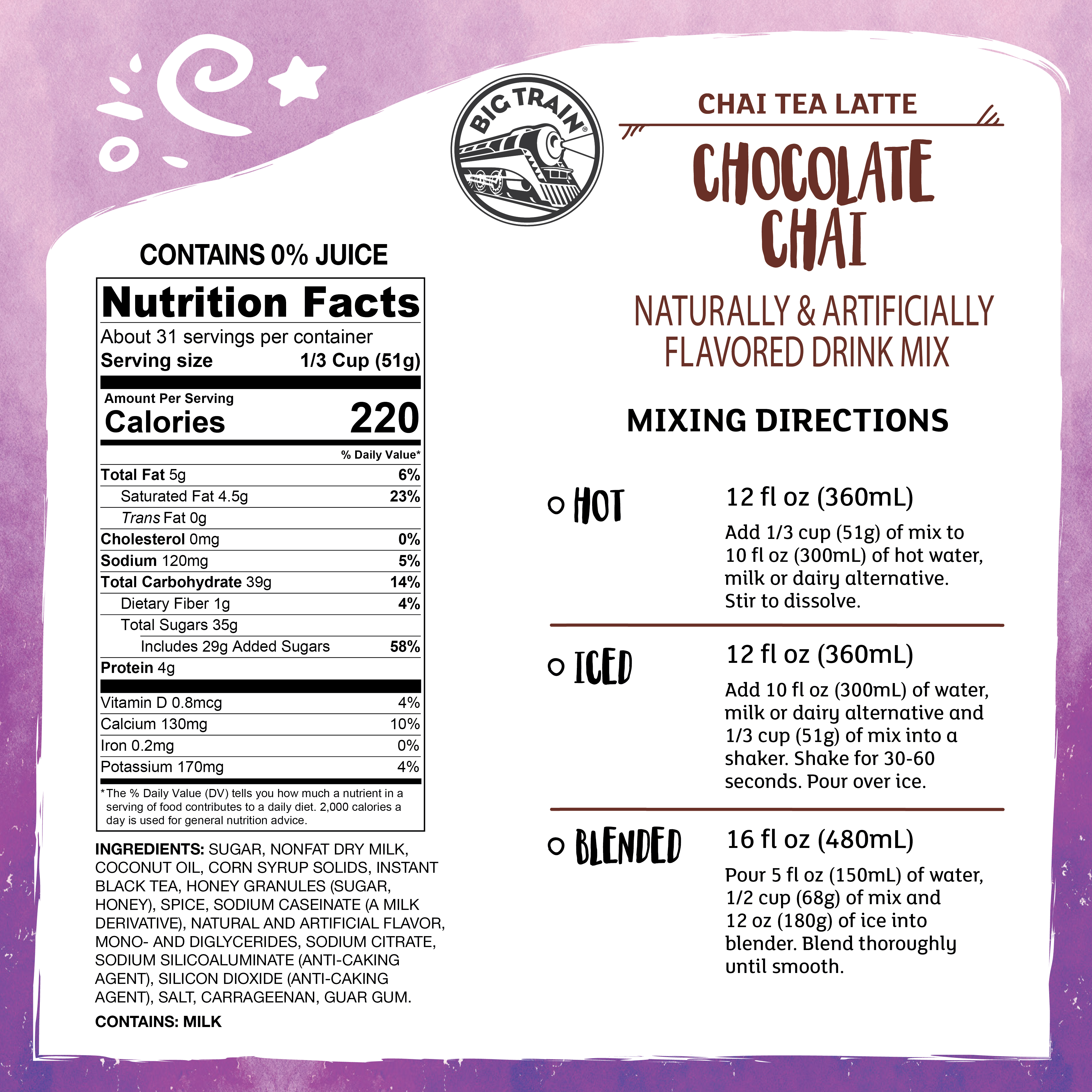 - Big Train Chocolate Chai Tea Latte Mix is made with a blend of honey, Dutch chocolate, black tea and exotic spices making the perfect chai tea latte in an instant. Breathe deep, take a sip, and let our Chocolate Chai Tea Latte Mix transport your taste buds to unforgettable adventure! Enjoy our chocolate chai tea latte mix on its own, or add whipped cream for an indulgent finish. Serve it hot, iced, or blended.