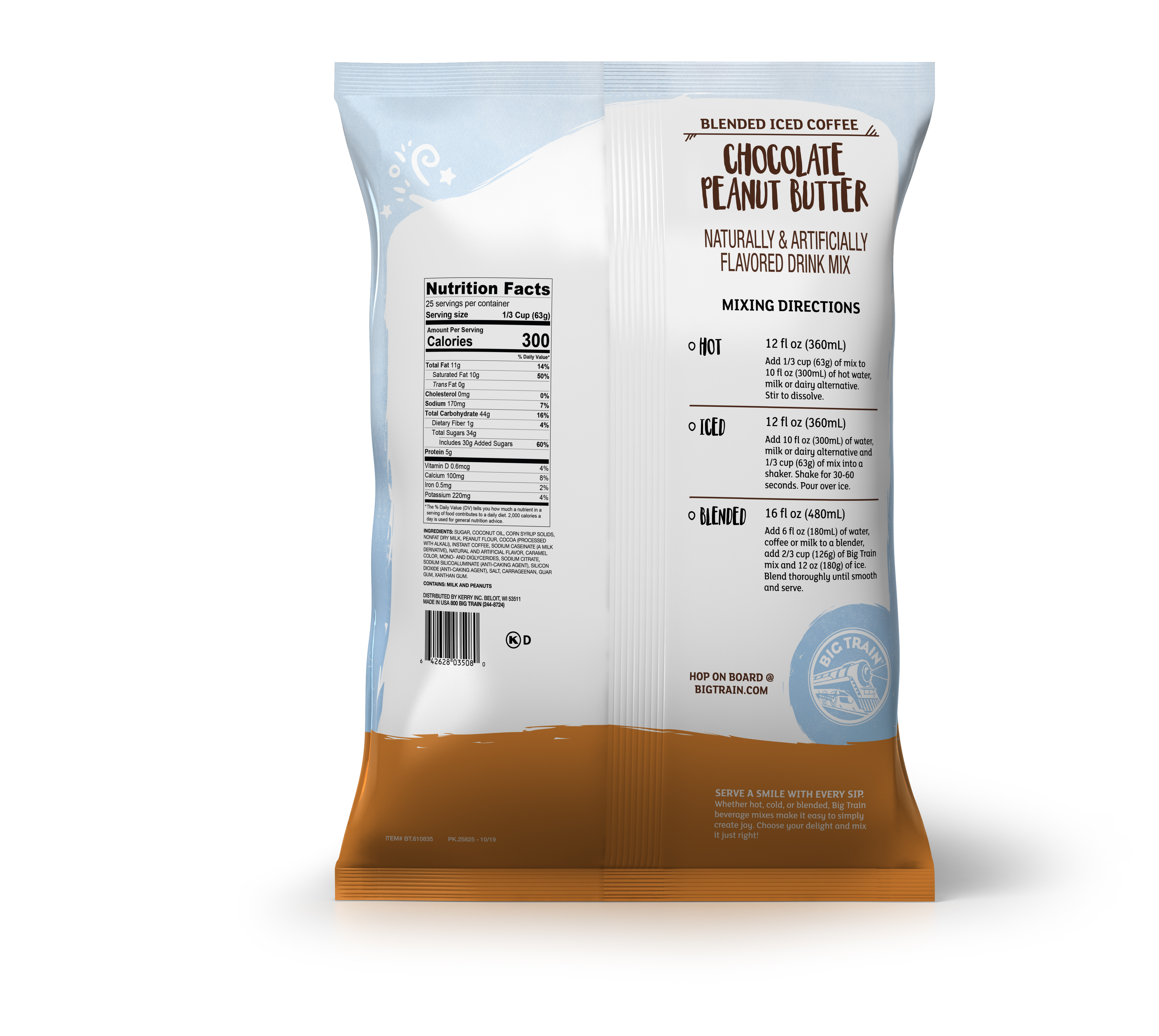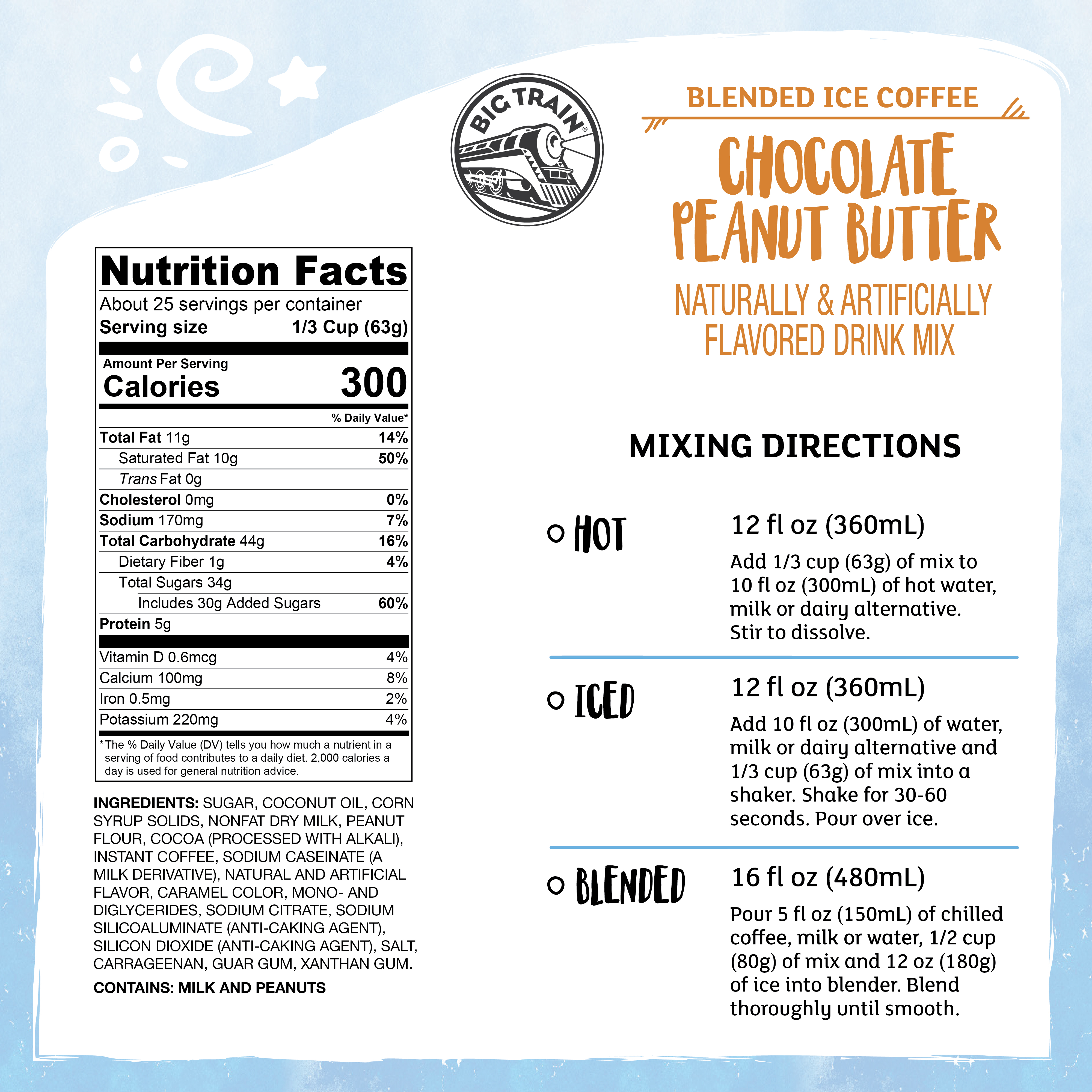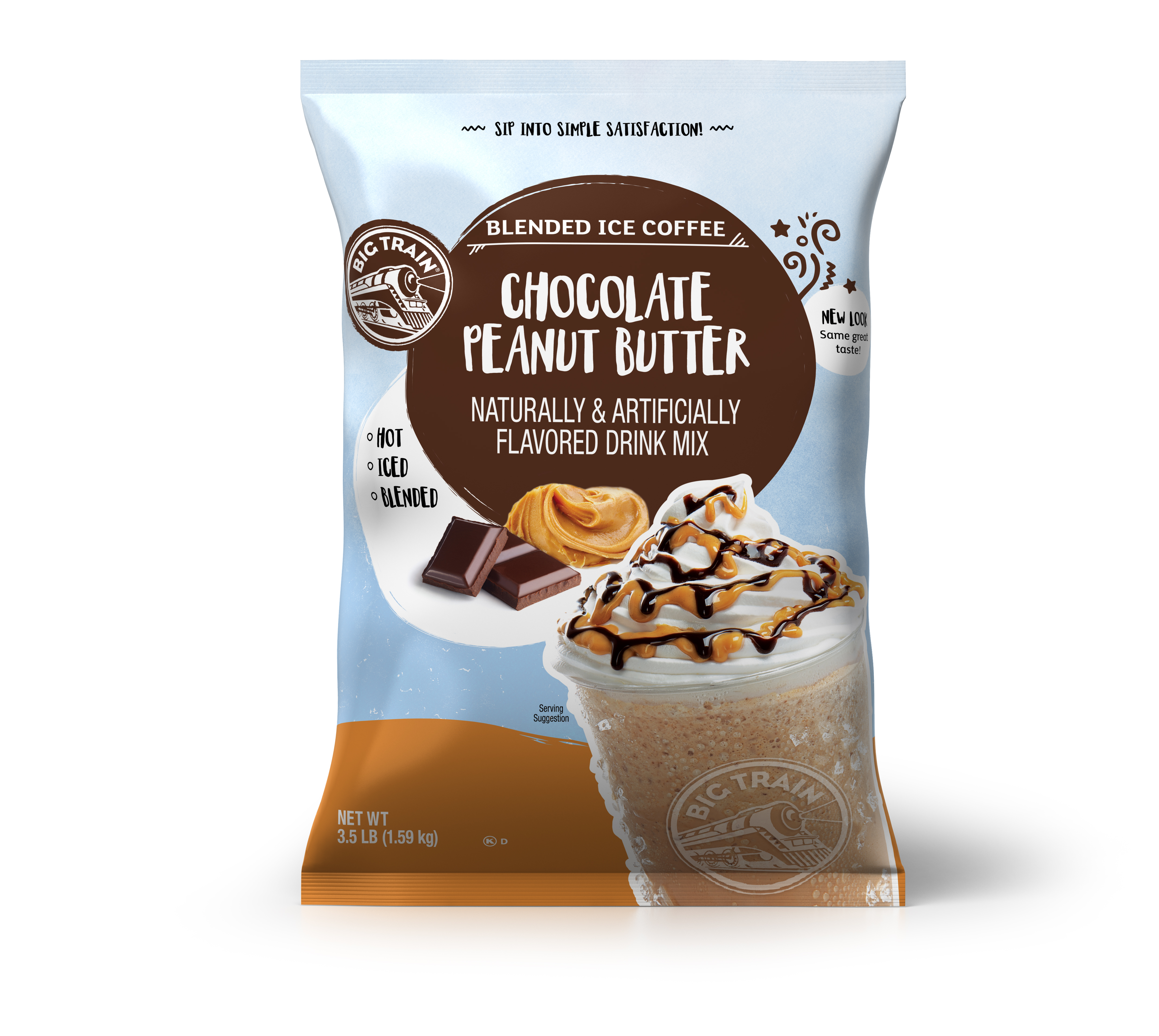 | Bullet 1 | Big Train Blended Ice Coffee In Chocolate Peanut Butter: A sweet, creamy peanut butter cup latte you can mix up instantly. Just add water! Drink hot, cold or blended with ice for a frozen frappe treat that rivals expensive drinks at chains like Starbucks. |
