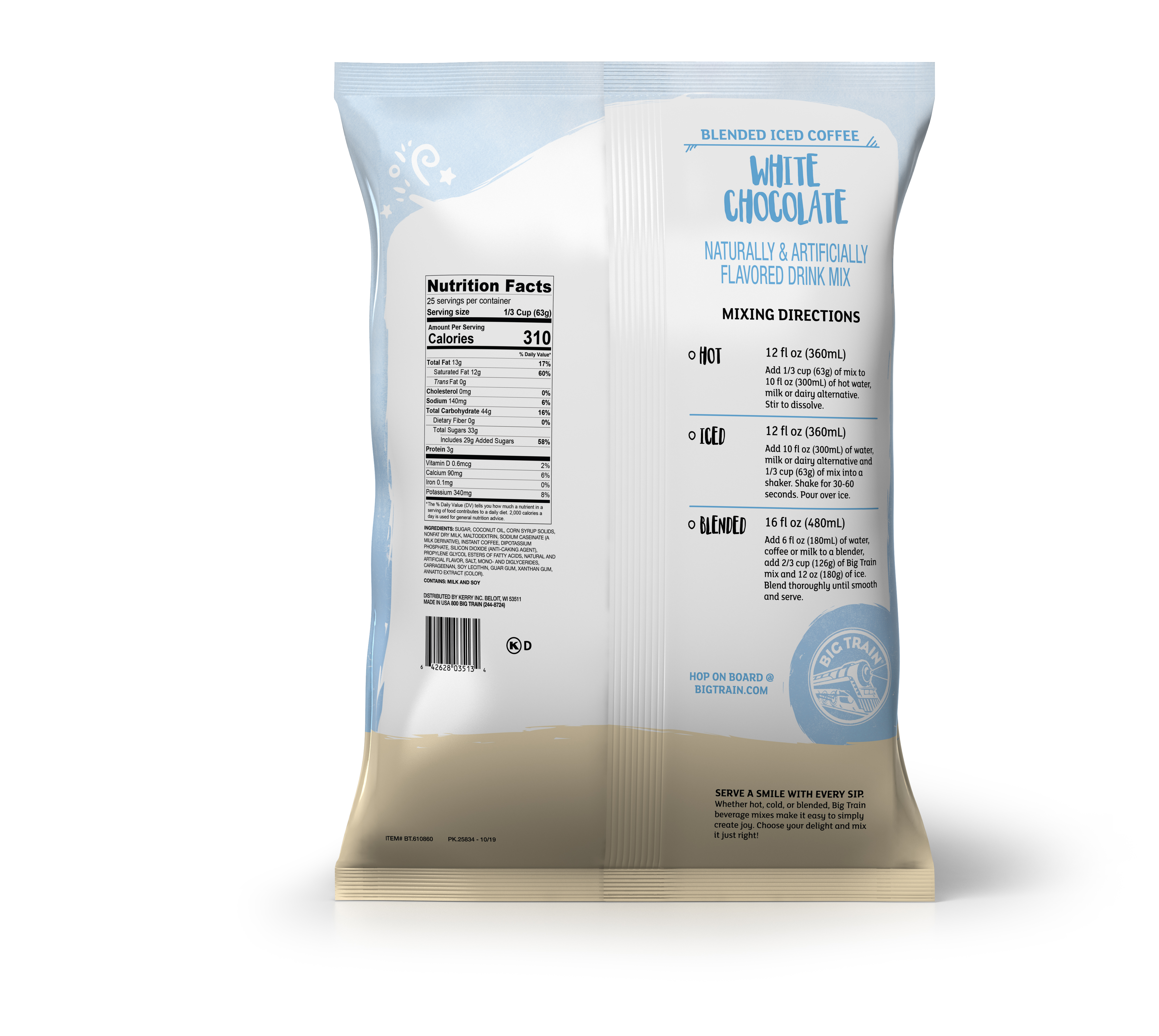 - Fans of silky white chocolate will love Big Train's White Chocolate Latte Blended Ice Coffee Frappe Mix. We source the highest-quality ingredients, including Arabica coffee, and carefully blend them to create our irresistible caffeinated mix. Our sweet, creamy blend is sure to refresh with aromatic, full-bodied coffee and the mellow flavor of sweet white chocolate. And our silky base delivers smooth, consistent texture with every cup. Serve hot, iced or blended with ice for a delicious Big Train frappe.
