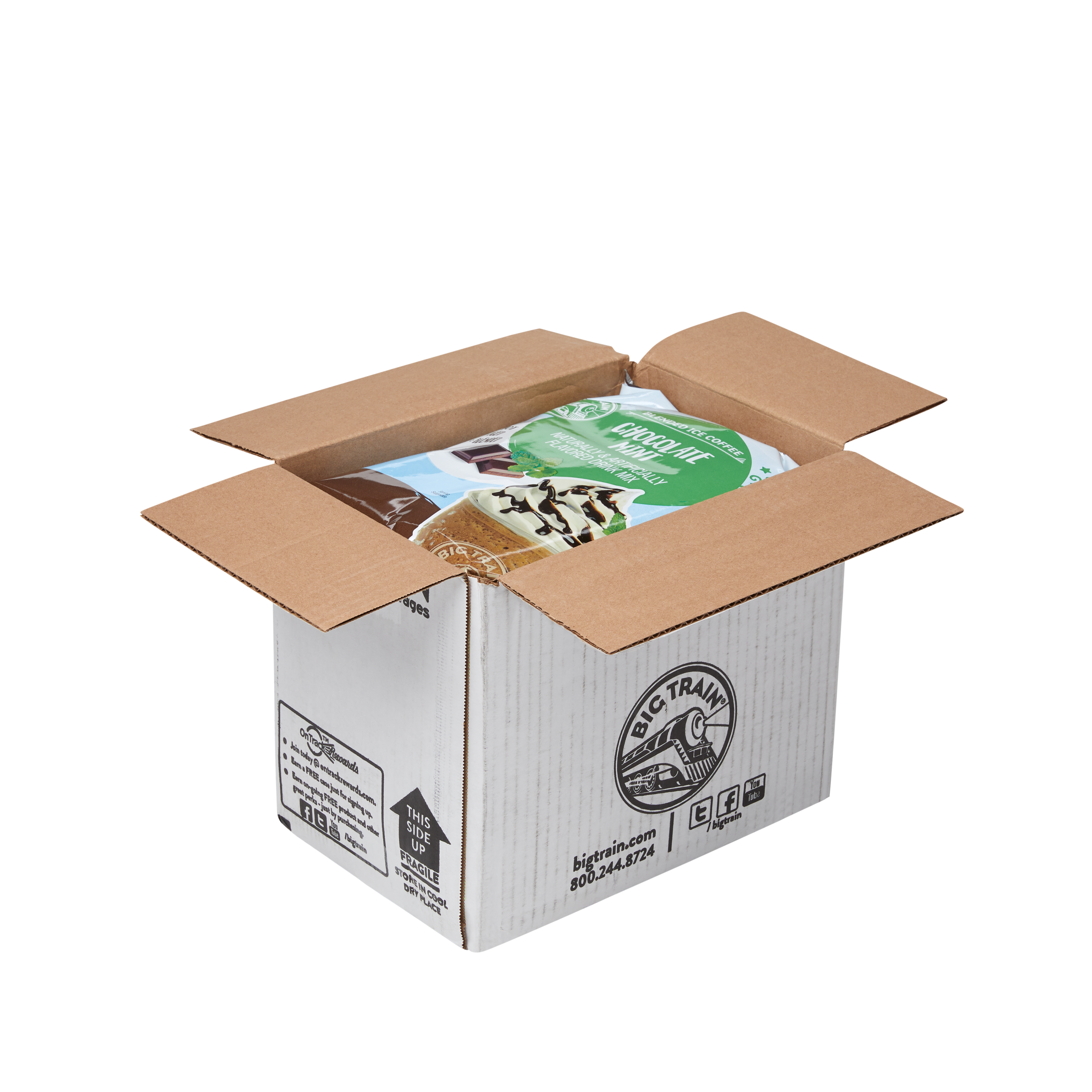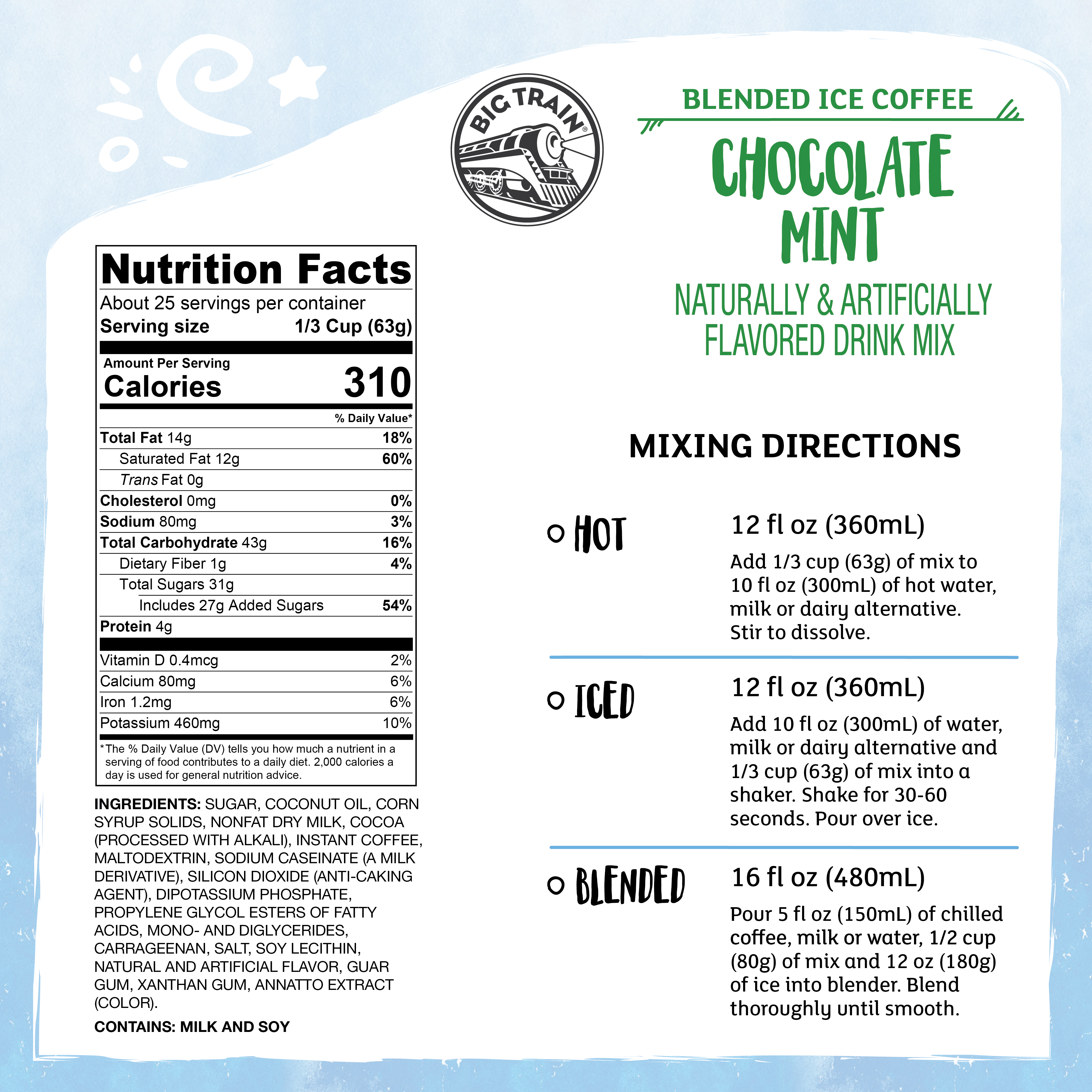 | Bullet 1 | Big Train Blended Ice Coffee In Mint: Rich, dark chocolate & refreshing mint get a caffeinated boost in Chocolate Mint Blended Ice Coffee Mix. Just add water! Drink hot, cold or blended with ice for a frozen treat rivaling drinks at chains like Starbucks. |