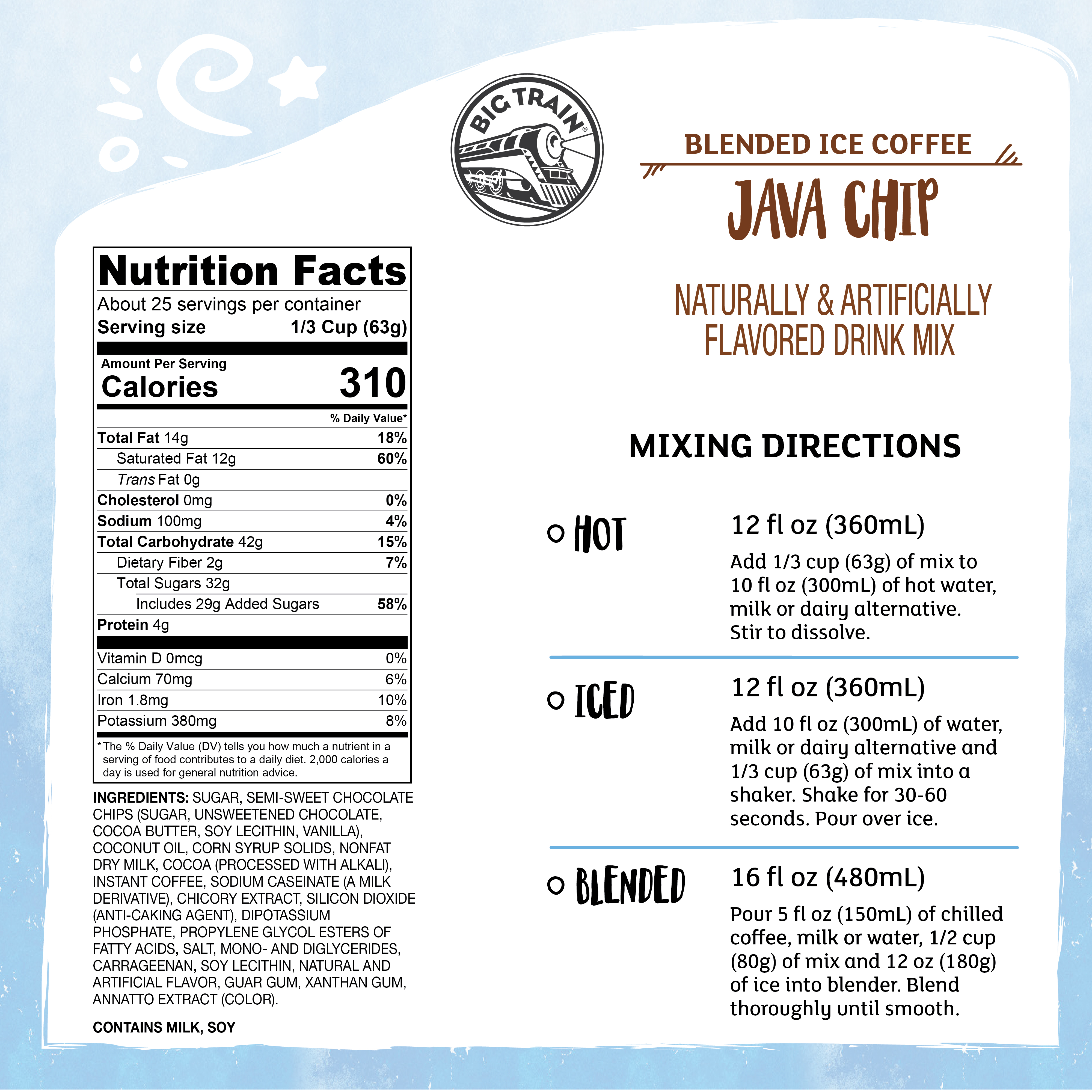 - Big Train Java Chip Blended Ice Coffee Frappe Mix is one of the easiest ways to satisfy your craving for a caffeinated iced coffee frappe with a hint of real chocolate chunks. All that’s needed is water, ice and a blender! This Big Train blended coffee beverage mix is a blend of the finest ingredients like Arabica coffee and a signature creamy base. It's the perfect morning or afternoon pick-me-up. Serve hot, iced or blended with ice for a delicious Big Train frappe.