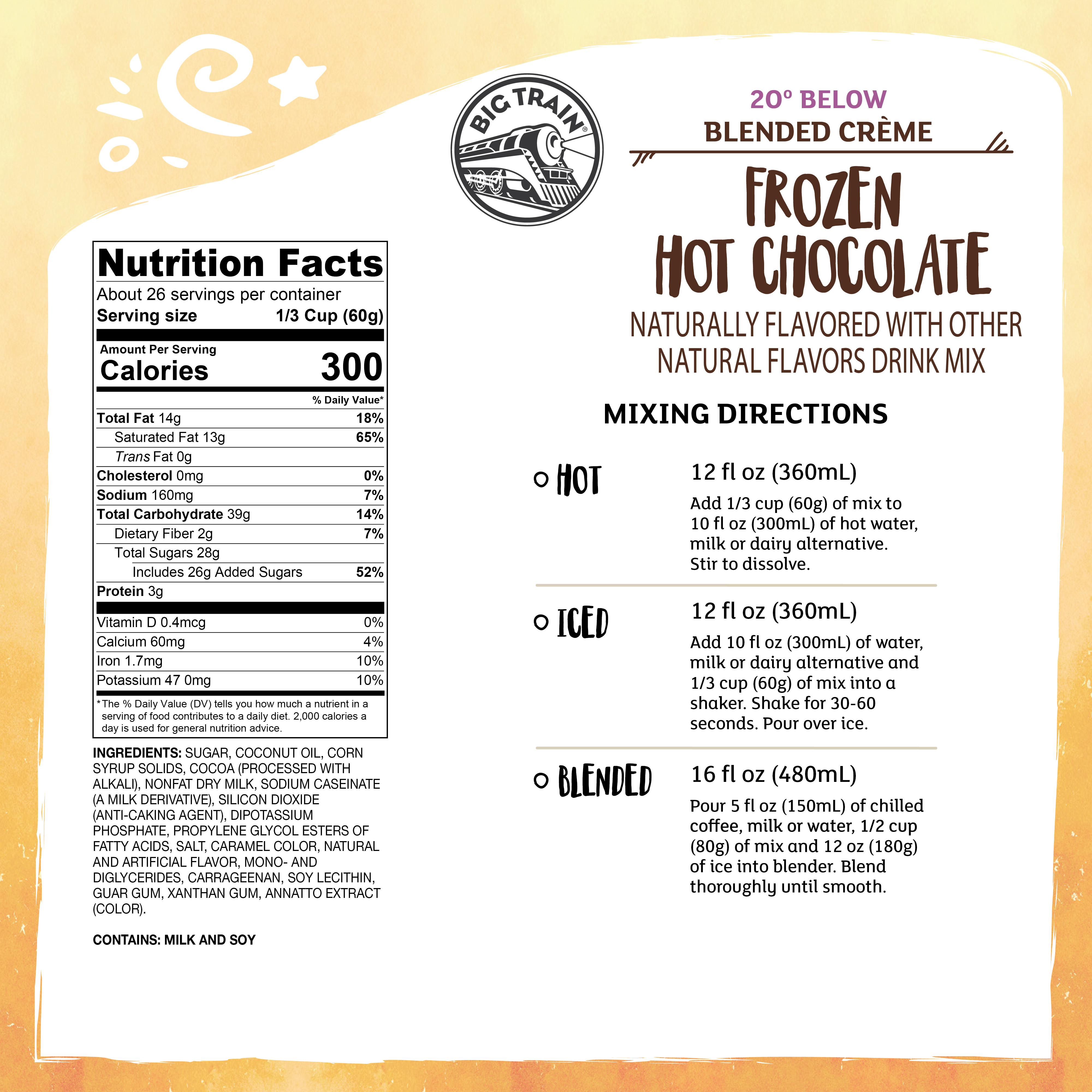 - Big Train 20 Below Frozen Hot Chocolate Drink Mix is one of the easiest ways to create the delectable taste of hot chocolate in a velvety frozen dessert frappe. All you need is water, ice and a blender! This Big Train hot cocoa beverage mix is a blend of rich cocoa, indulgent chocolate flavors and a creamy base for delicious texture and flavor in every drink. It's the perfect drink to satisfy chocolate cravings at any time of the day, for any customer.