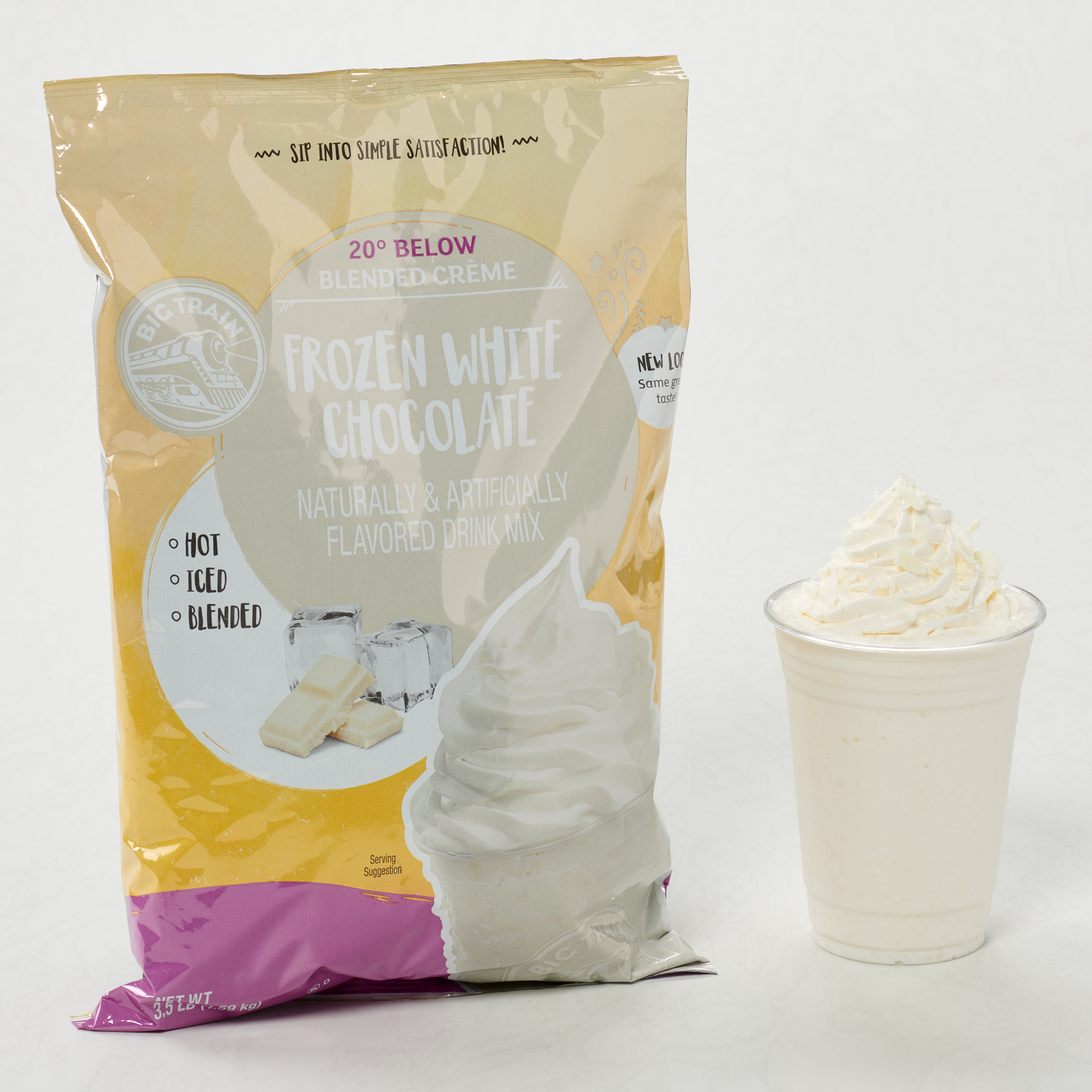 - Big Train 20 Below White Chocolate Frappe Mix, Frozen is one of the easiest ways to create the delectable taste of white chocolate in a delicious frozen dessert frappe. All you need is water, ice and a blender! This Big Train beverage mix is a blend of the finest ingredients. Blend it, pour over ice, or simply add hot water to satisfy your craving for white chocolate!