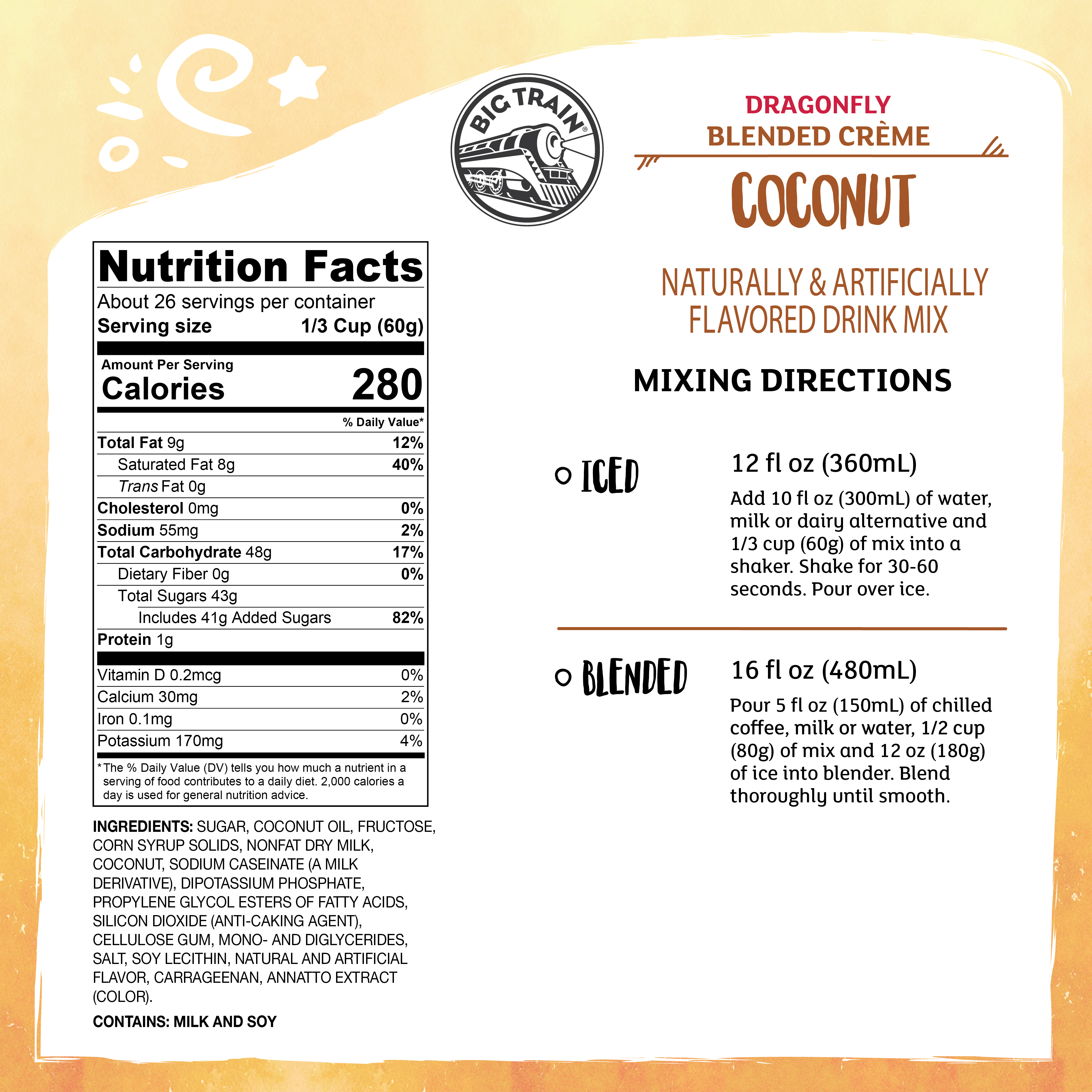 - Sail off to the tropics with Big Train’s Dragonfly Coconut Blended Crème Frappe Mix. This Big Train beverage mix uses the fresh taste of sweet coconut in a creamy base that ensures smooth, consistent texture. If you crave coconut, you will love this on its own, or try it with banana, berries, or chocolate for a twist on one of nature's most popular fruits. For an indulgent creamy finish, top with a dollop of whipped cream. You will want to make drinks using this blended mix from Big Train over and over again!