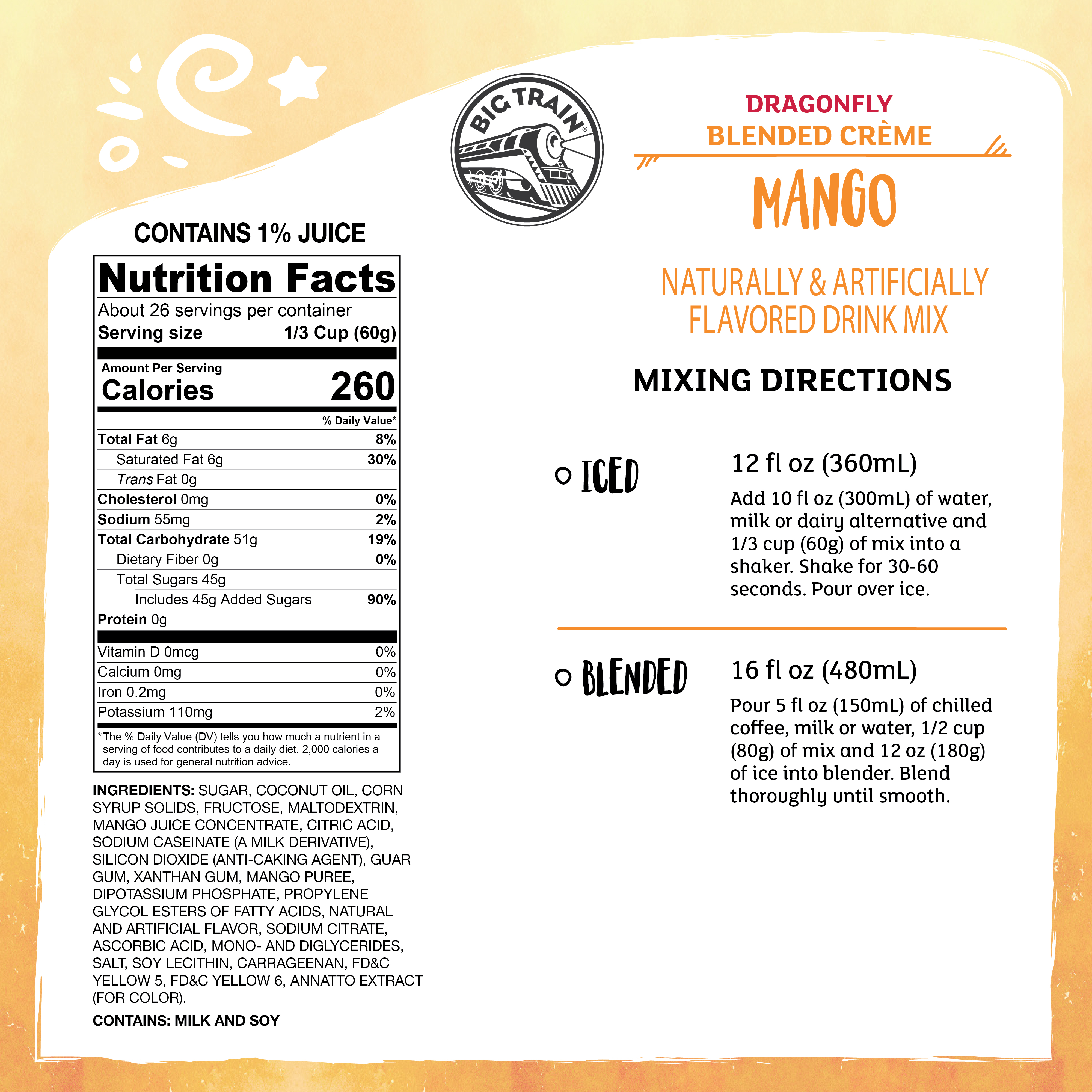 - Taste fruity tropical flavor with Big Train's Dragonfly Mango Blended Creme Frappe Mix! We source the finest ingredients and carefully blend them forgourmet flavor that will transport you with every sultry sip! Sweet mango juice and mango puree take center stage in our creamy base that delivers smooth, consistent texture. Pair it with banana, berries or chocolate for a twist on one of nature's most popular fruits. For an indulgent creamy finish, top with a dollop of whipped cream. Serve hot, iced, or blended