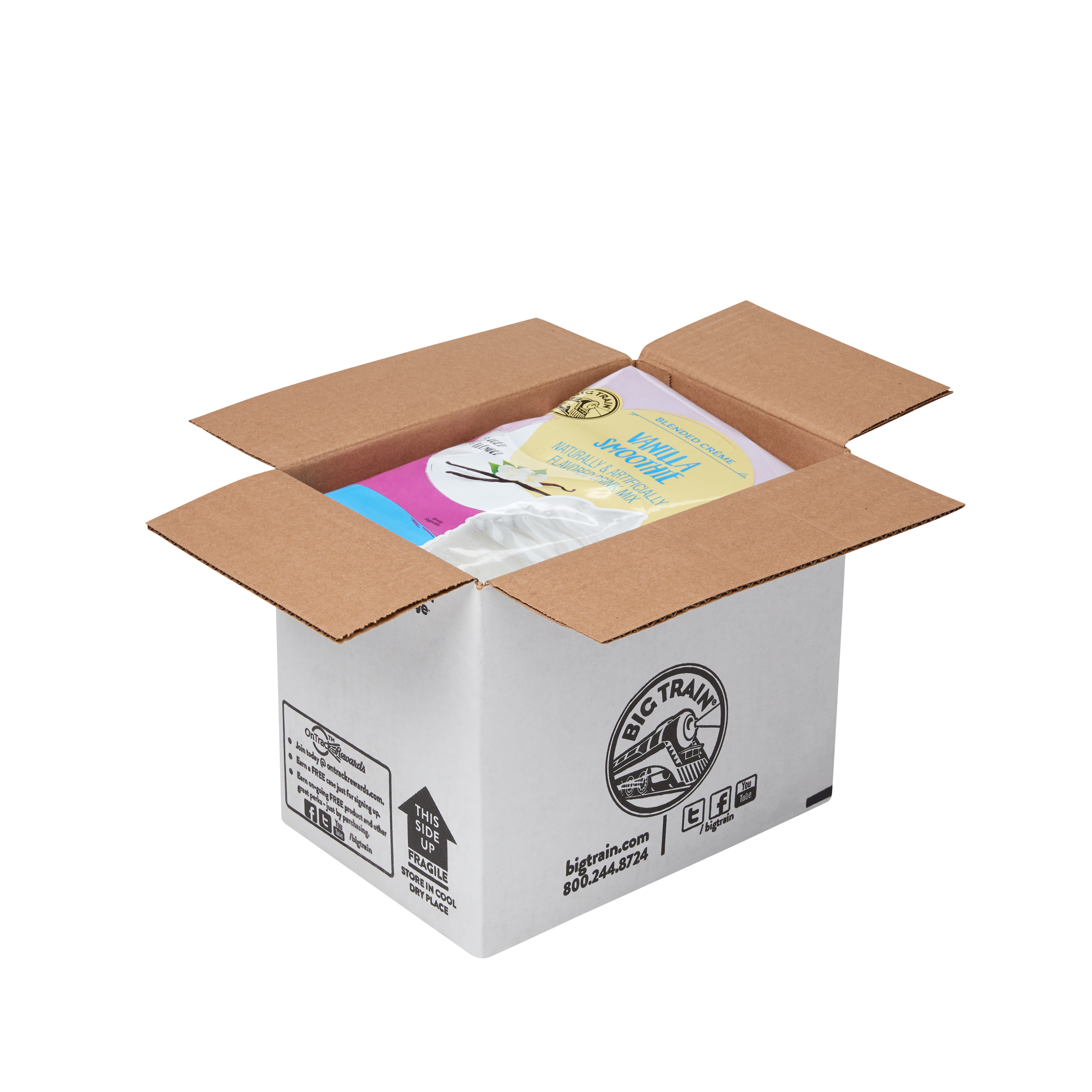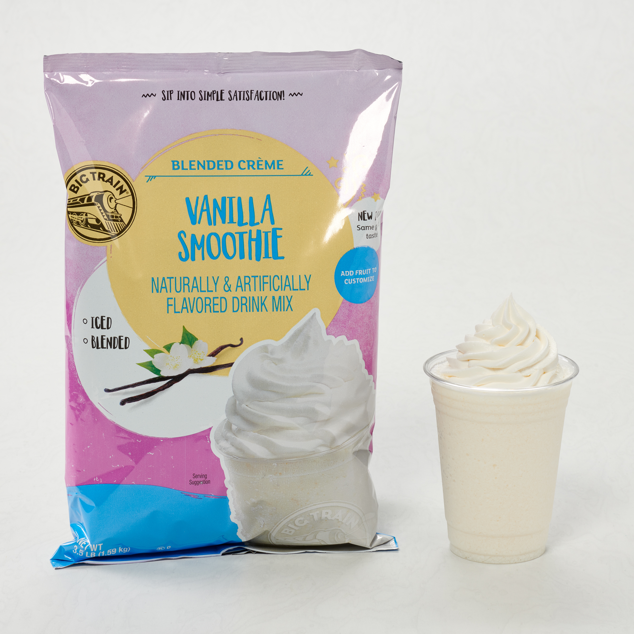 - You are going to love the classic taste of Big Train’s Blended Cream Vanilla Smoothie Mix. This smoothie mix is full of creamy vanilla flavor. Versatile vanilla goes with everything! Our rich-tasting smoothie base includes a high-quality blend of ingredients to deliver creamy, consistent texture every time. Pair our smoothie mix with tart berries, tropical fruits, crunchy nuts or rich chocolate. All you need is water, ice, and a blender! No refrigeration needed.
