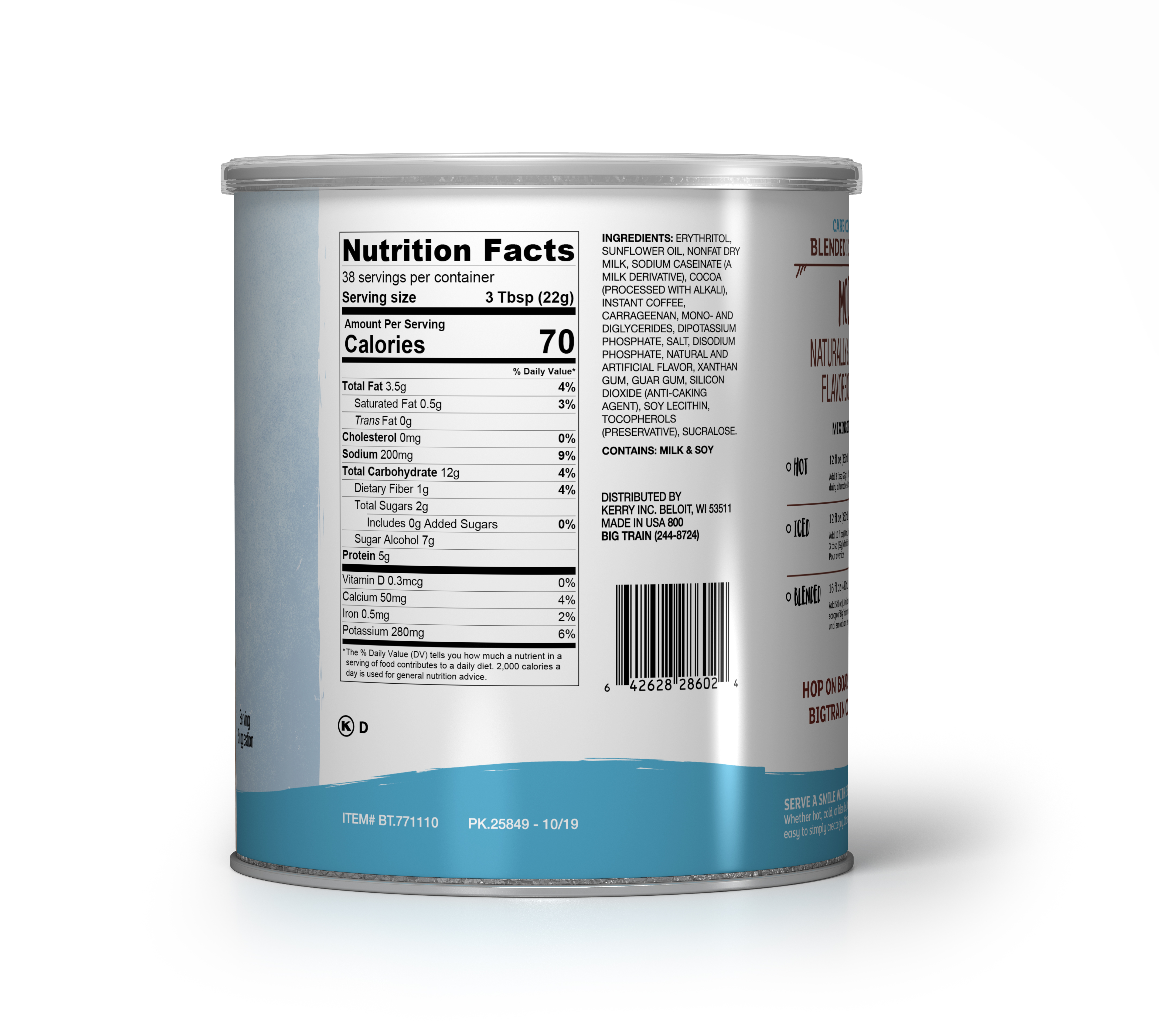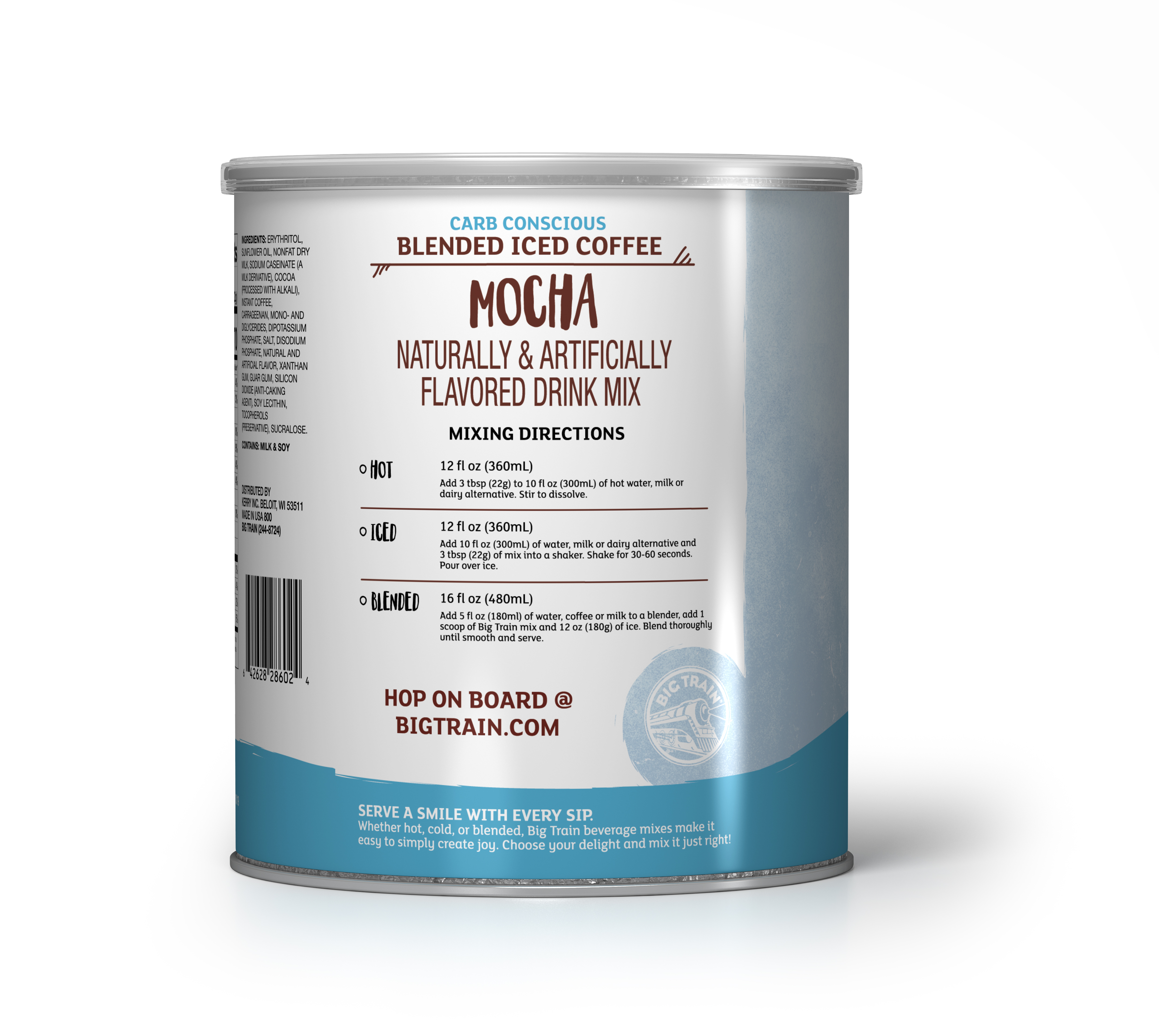 - Big Train Mocha Blended Ice Coffee Low Carb Mocha Frappe Mix is one of the easiest ways to satisfy any chocolate-obsession while being carb-friendly. Enjoy a chocolaty, iced coffee frappe made with the finest Arabica coffee and the same great taste as a regular mocha frappe. All that’s needed is water, ice and a blender! Big Train Low Carb Mocha Blended Ice Coffee Mix is full of rich chocolate flavor, contains no added sugars and is not a significant source of trans fats.