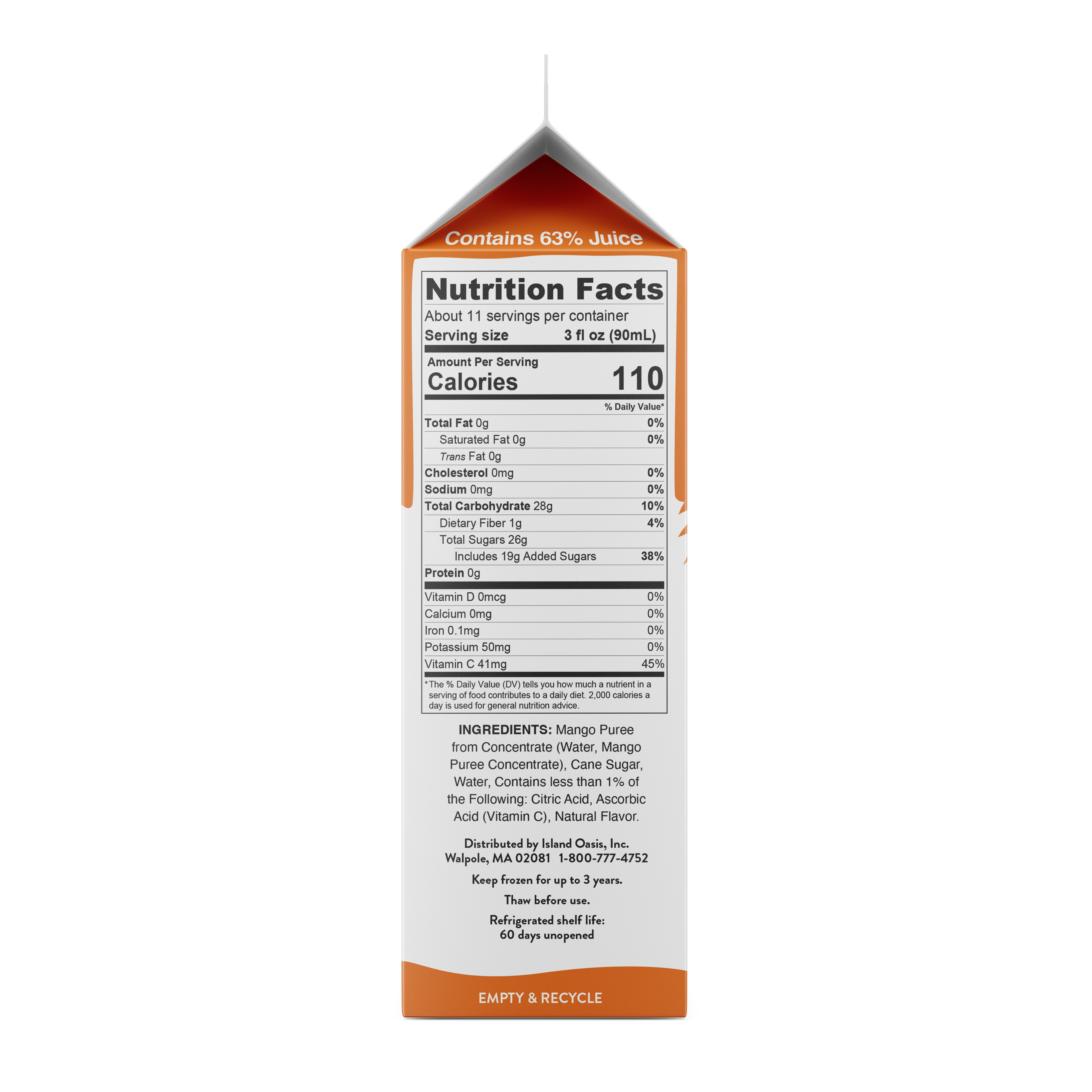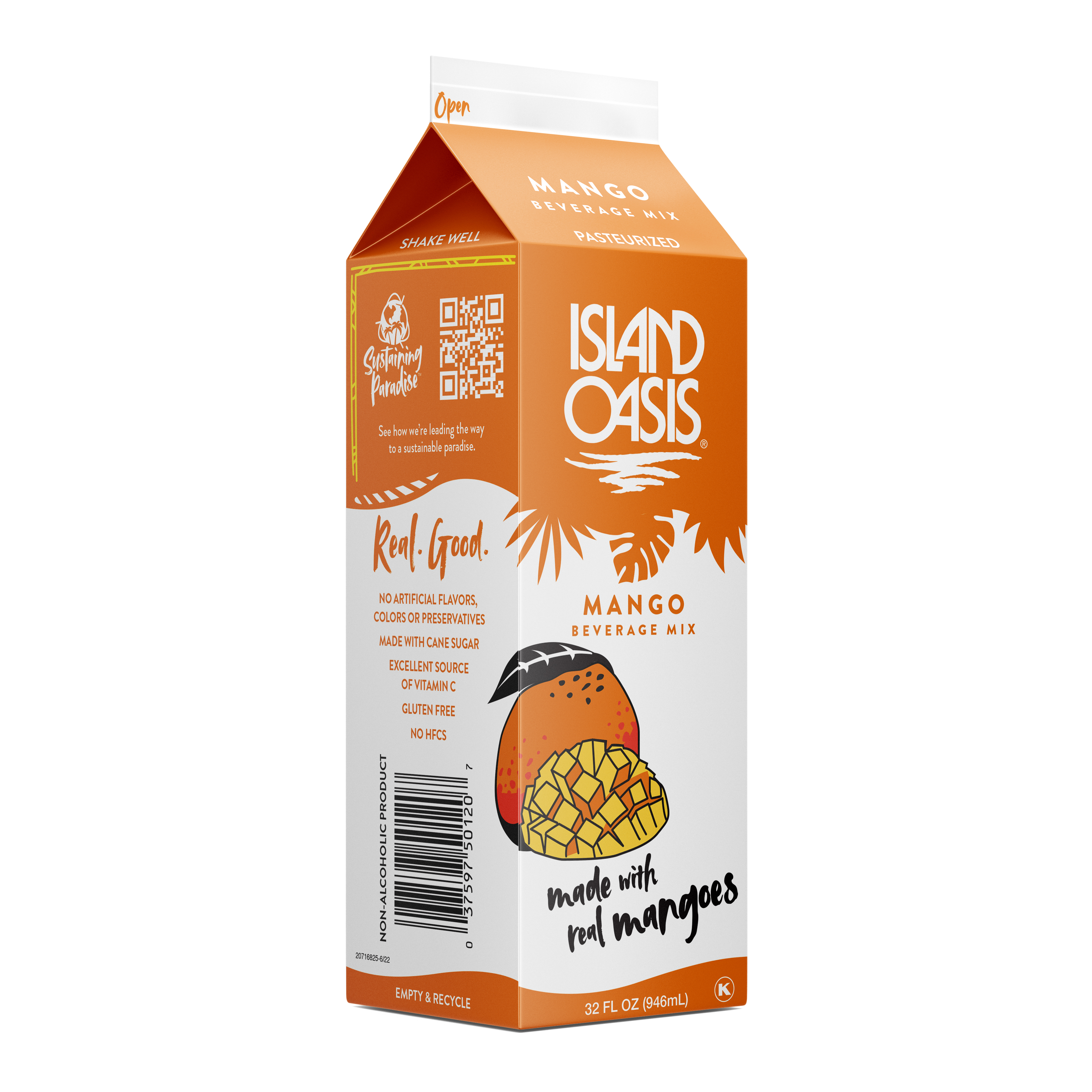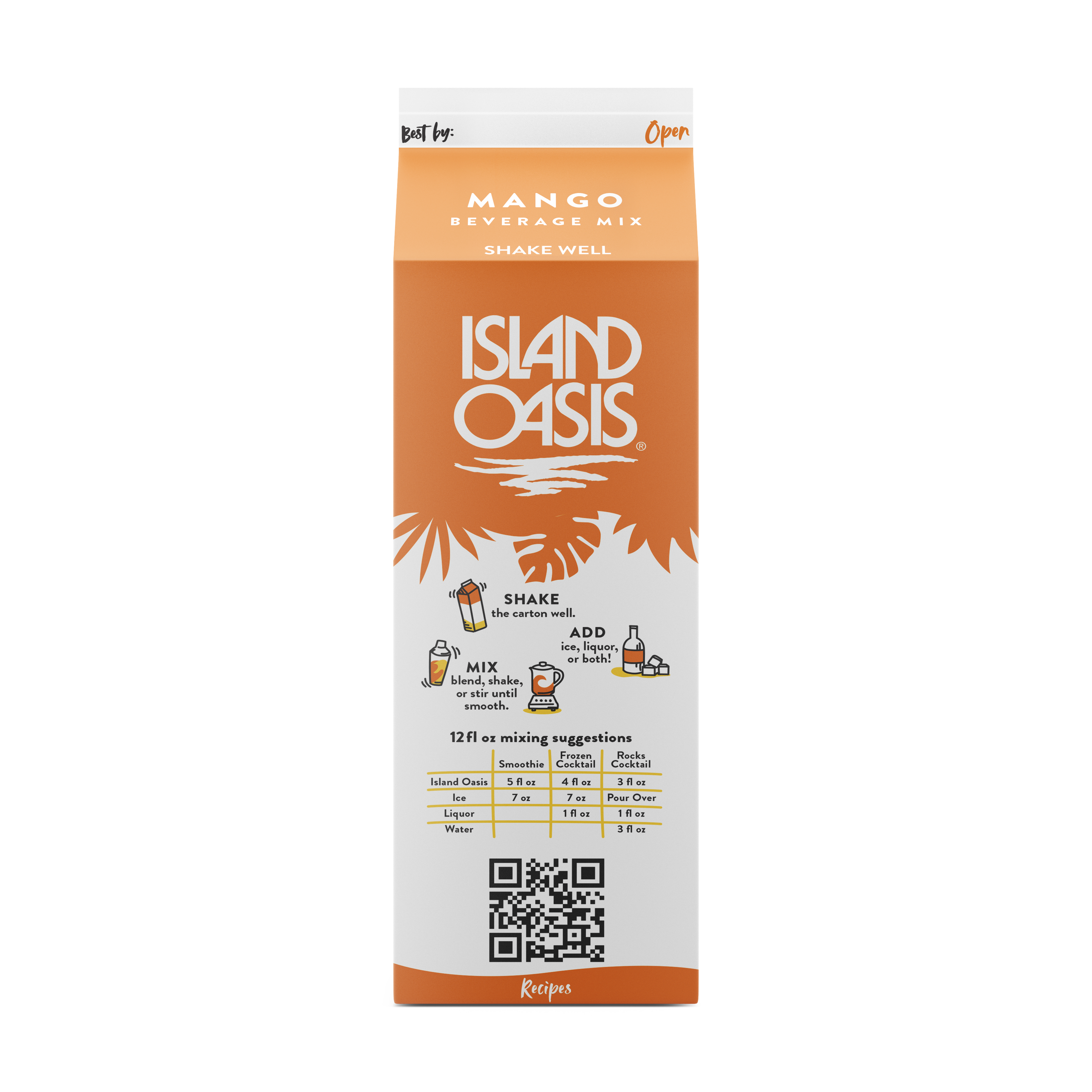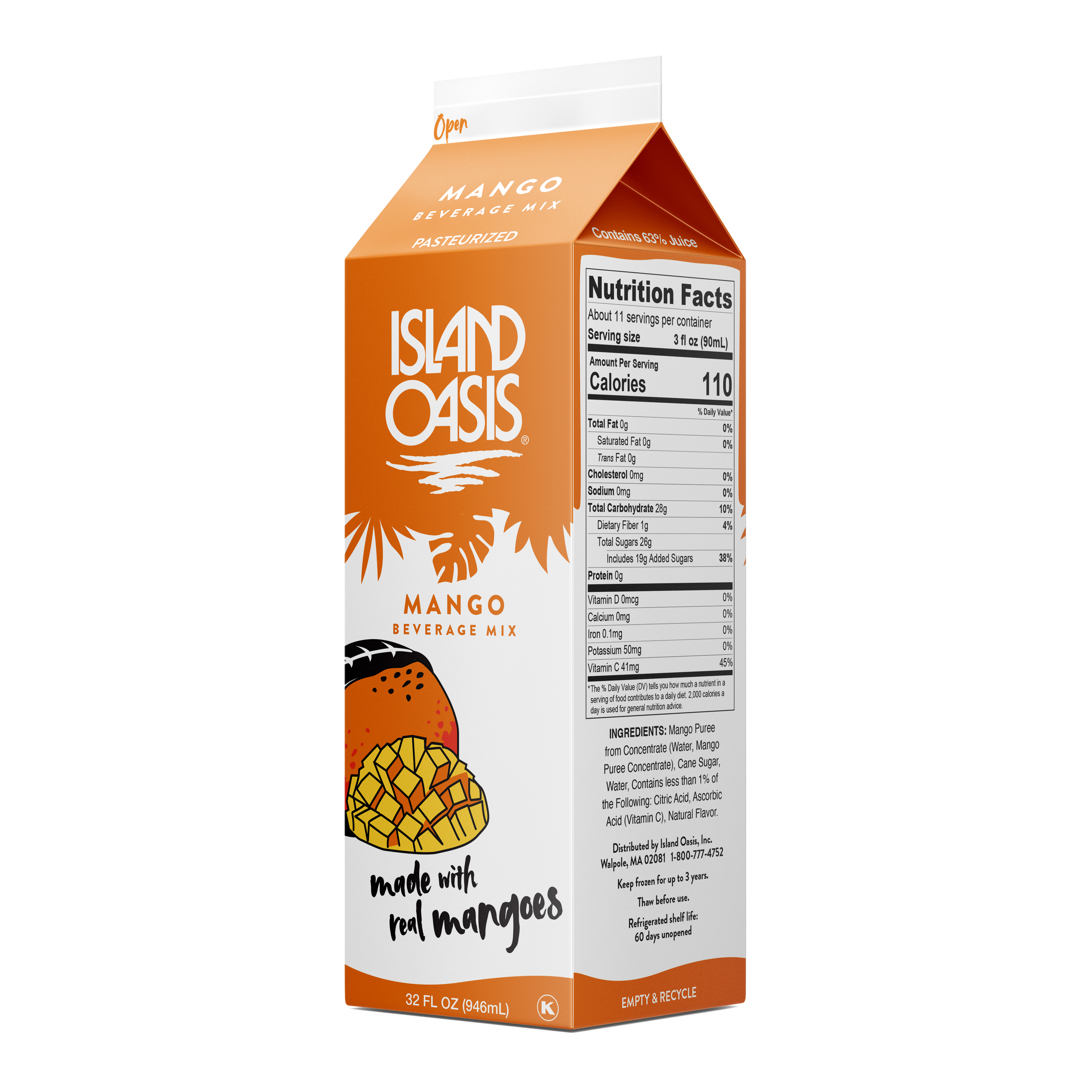 - Get a taste of the tropics with Island Oasis Mango Mix. To create our mango mix, we use our passion for flavor to blend up sweet, sun-ripened mangos for a velvety smooth texture and we add a touch of real sugar fo rbalanced sweetness. Our frozen Mango Mix captures the ultimate freshness in the convenience of a liquid mix. Just thaw in the fridge and enjoy the fresh taste and health benefits of fresh fruit without the hassle. For extra nutrition, we fortify it with vitamin C to meet 100% of the recommended daily value in a 3 oz. serving. No matter how you blend it, our mango mix keeps sweet, smooth mango flavor at your fingertips. This gluten-free, natural Island Oasis Mango Mix contains no artificial flavors, colors or preservatives, high fructose corn syrup, or trans fats. Kosher certified. Island Oasis Mango Mix ships frozen and is available in 1 quart cartons. Each carton makes 5 16 oz. smoothie servings or 8 12 oz. cocktail servings.