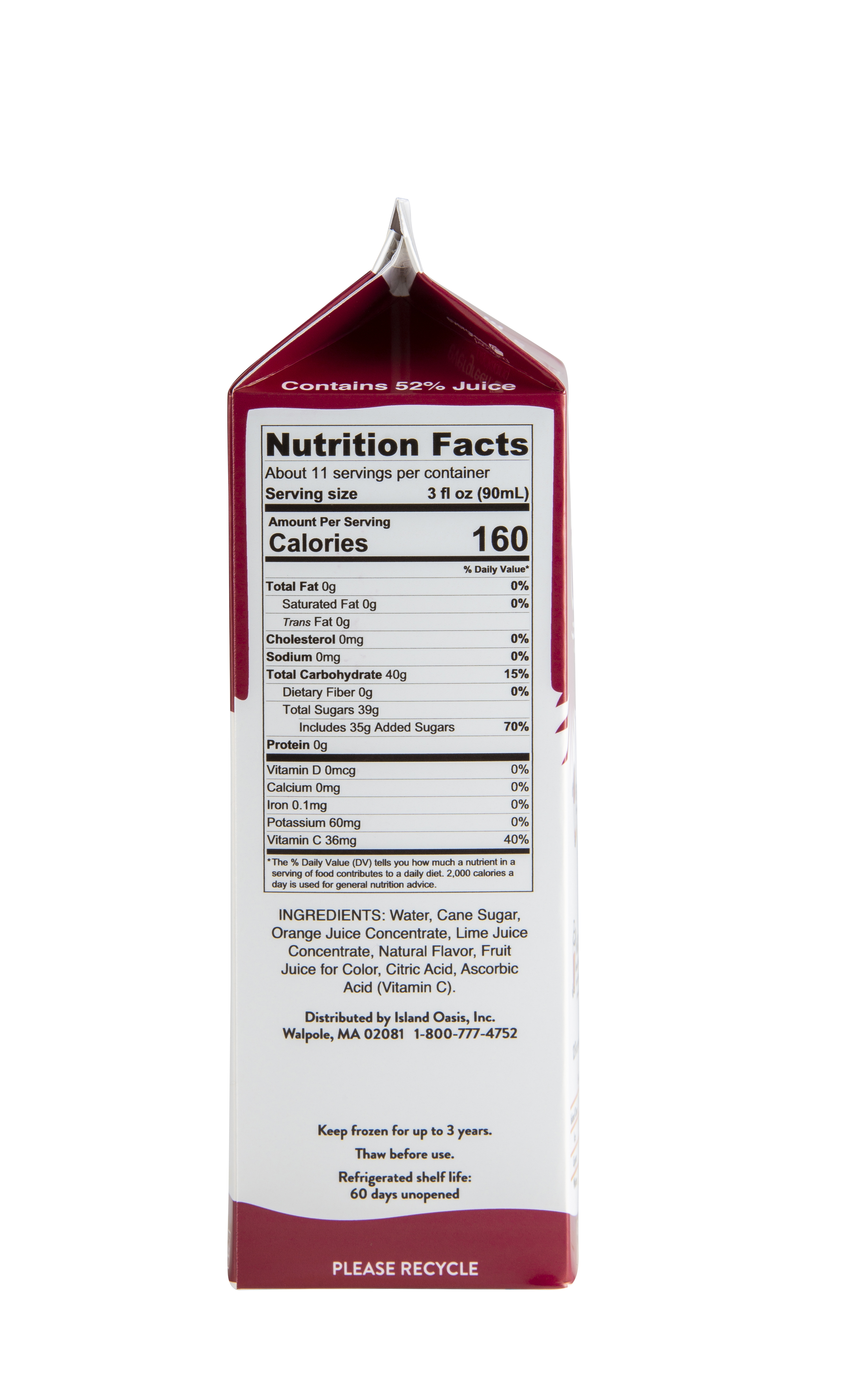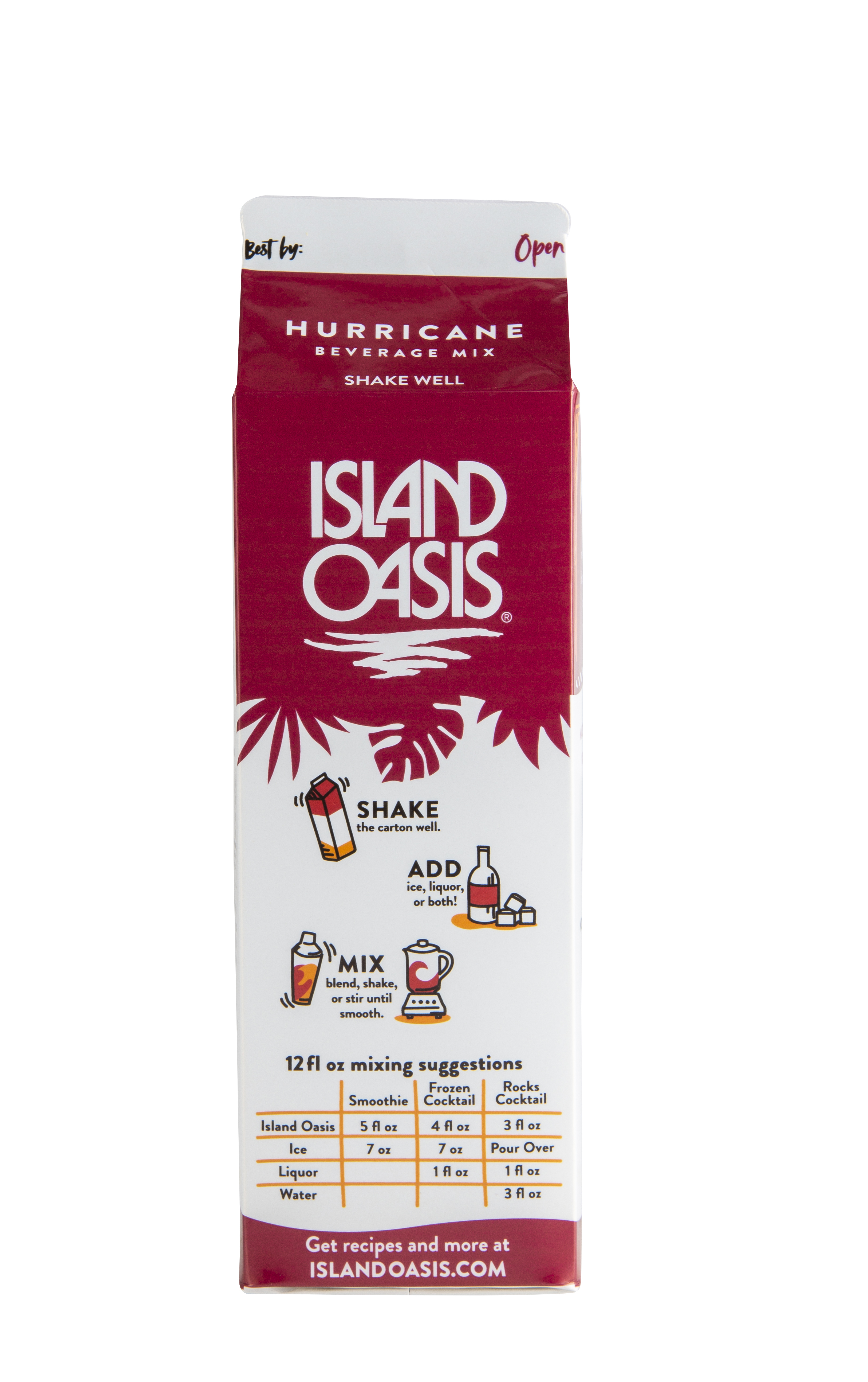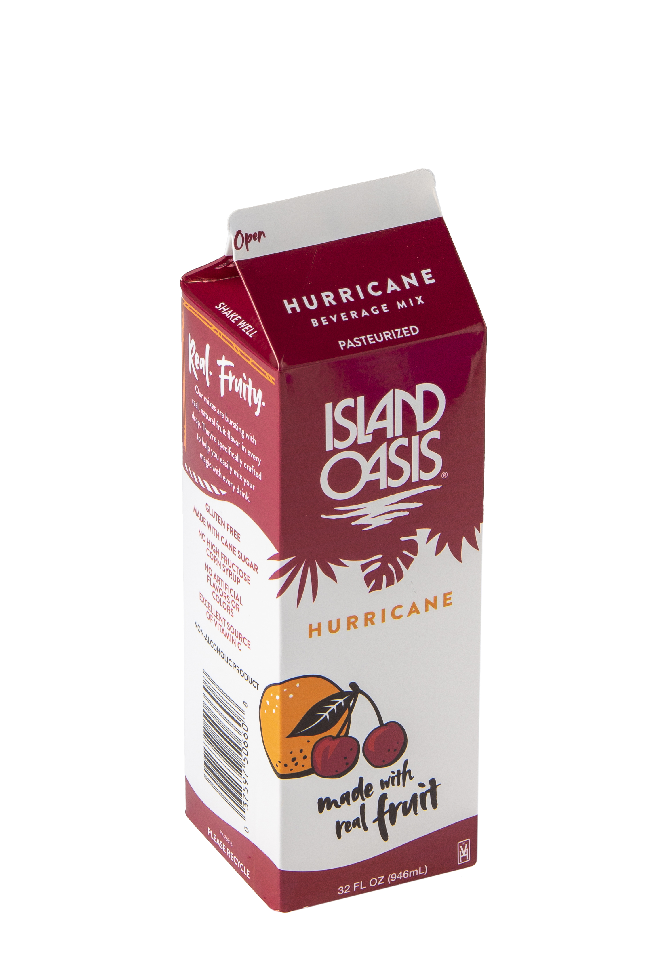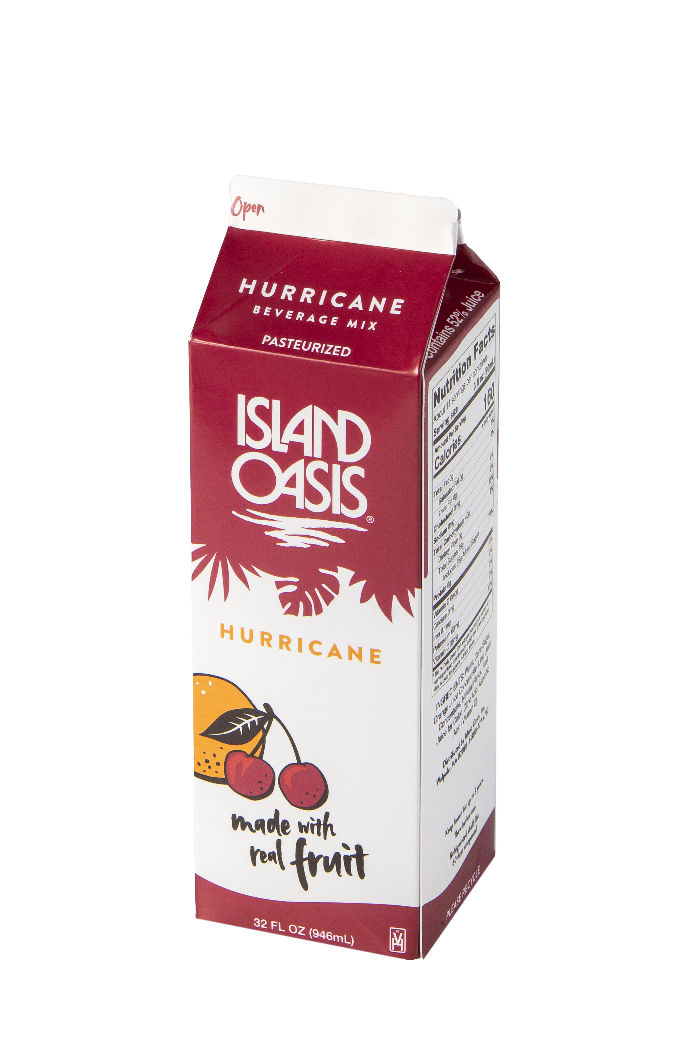 - Take a trip to the Big Easy with our Island Oasis Hurricane Beverage Mix. Recreate the New Orleans classic using our hurricane mix, which is made with tropical notes, and a generous dose of orange and cherry flavors. All you have to do is thaw and pour! Since our ingredients are fresh and juicy, you'll get a premium flavor experience every time. With our delicious mix on hand, you can create tantalizing Hurricane cocktails or mocktails anytime! Add optional rum, and pour over ice in a hurricane glass with an orange slice and cherry garnish. Or blend the hurricane mix with ice for a refreshing frozen beverage. This gluten-free, natural Island Oasis frozen Hurricane Mix contains no artificial flavors, colors or preservatives, high fructose corn syrup, or trans fats. Kosher certified. Island Oasis Hurricane Mix ships frozen and is available in 1 quart cartons. Each carton makes 8 12 oz. cocktail servings.