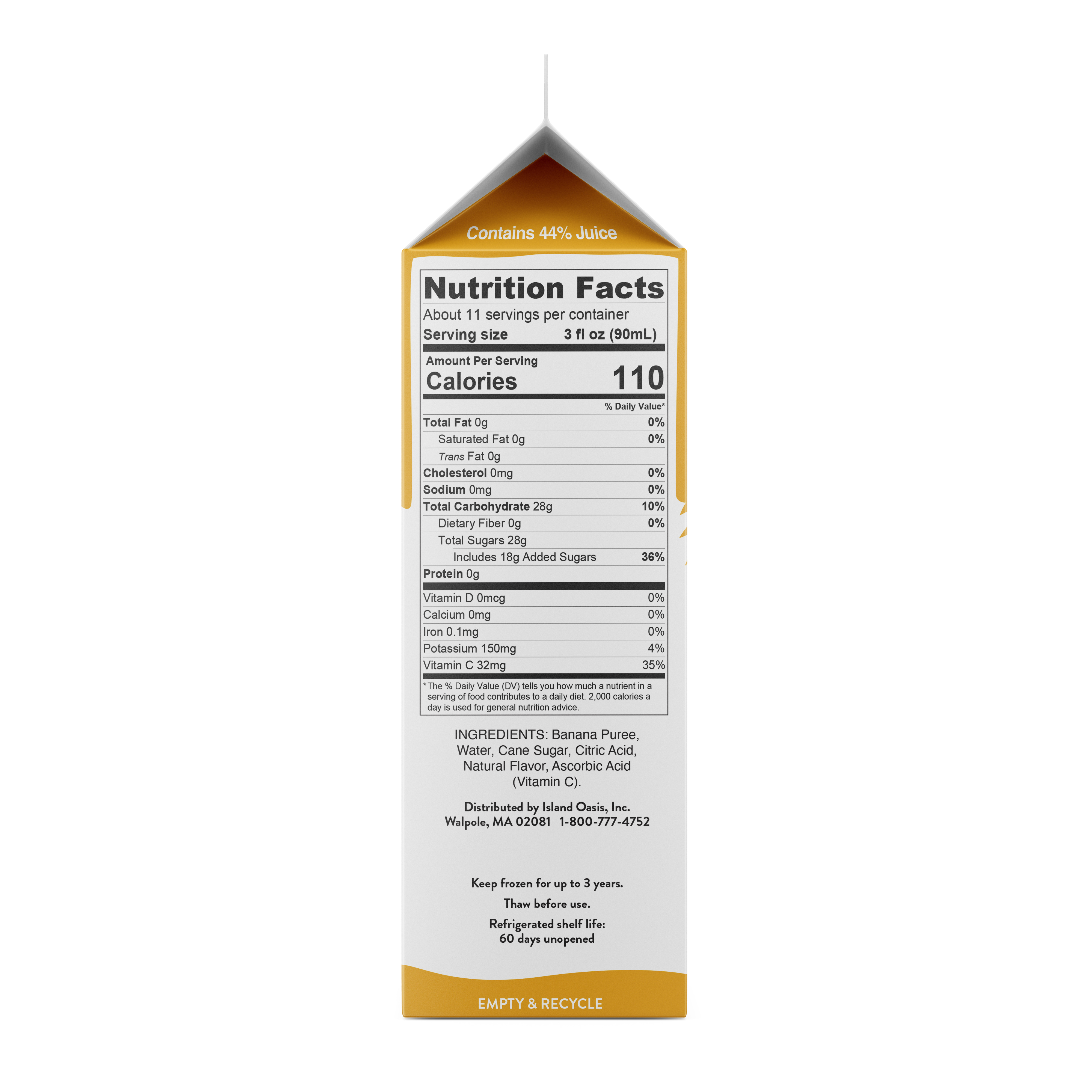 - Never worry about overripe or under ripe bananas again with this thick and creamy natural Banana Mix from Island Oasis! Instead, keep our deliciously smooth Banana Mix on hand and add perfectly ripe bananas to your beverages anytime. No more storing delicate fruit or dealing with messy peels. Just pour and blend! We make our smooth mix with ripe bananas and enhance their sweetness with a hint of real sugar. Our frozen banana mix captures the taste of fresh fruit with the convenience of a liquid mix. Just thaw the mix in the fridge, and you can enjoy the fresh taste and health benefits of fresh fruit without the hassle. For extra nutrition, we fortify our Banana Mix with vitamin C to meet 100% of the daily recommended value in a 3 oz. serving. At Island Oasis, we work hard to make fresh fruit easy to enjoy. From fruity smoothies to cocktails and mocktails, make them all quickly and easily with our frozen Banana Mix. For a banana-based smoothie, blend with ice and add optional fruit for a custom flavor combination. Use as a base or add just a splash to create signature cocktails and mocktails with smooth banana flavor. No matter how you blend it, our mix delivers sweet, creamy banana flavor at your fingertips. This gluten-free, natural Island Oasis Banana Mix contains no artificial flavors, colors or preservatives, high fructose corn syrup, or trans fats. Kosher certified.