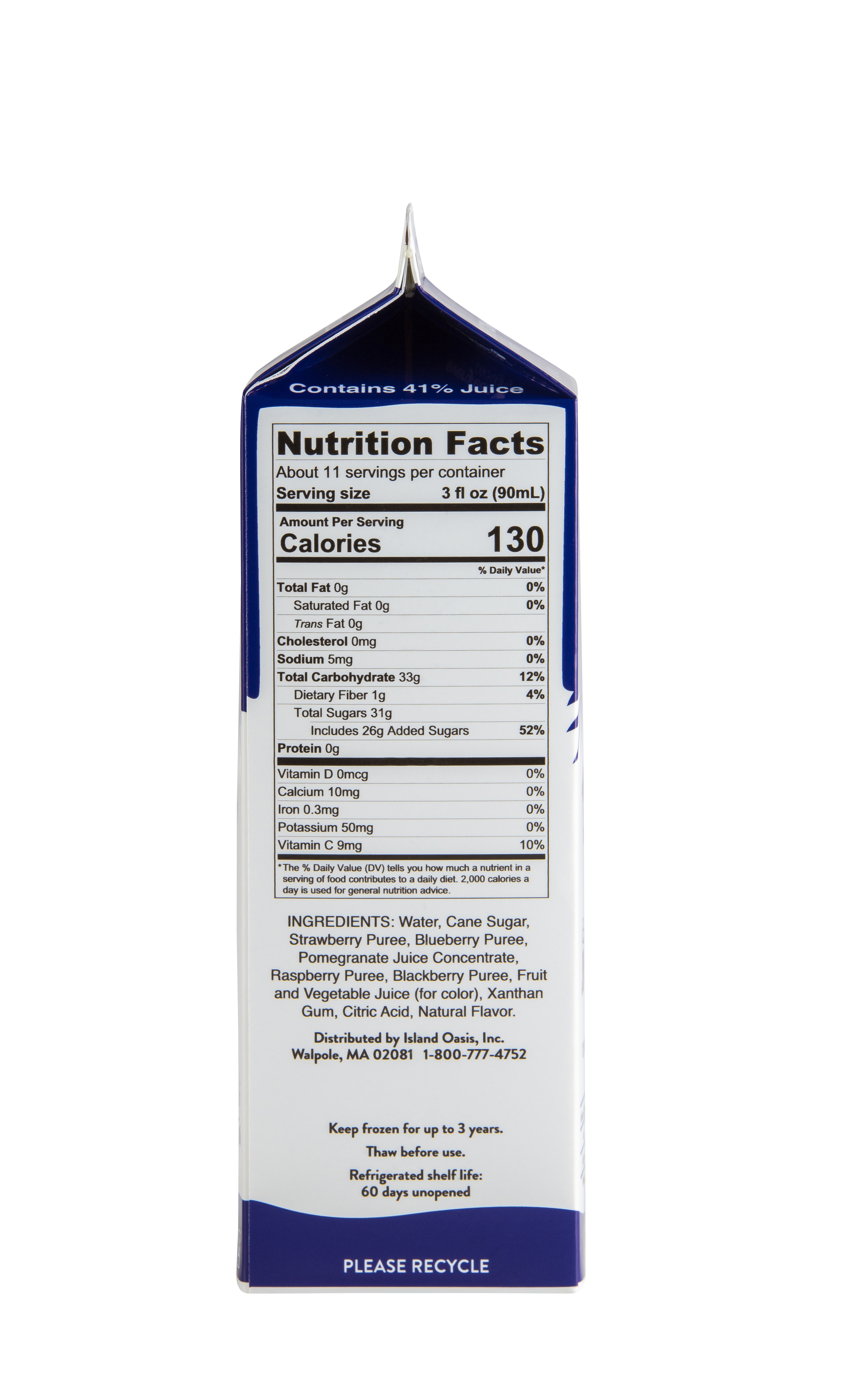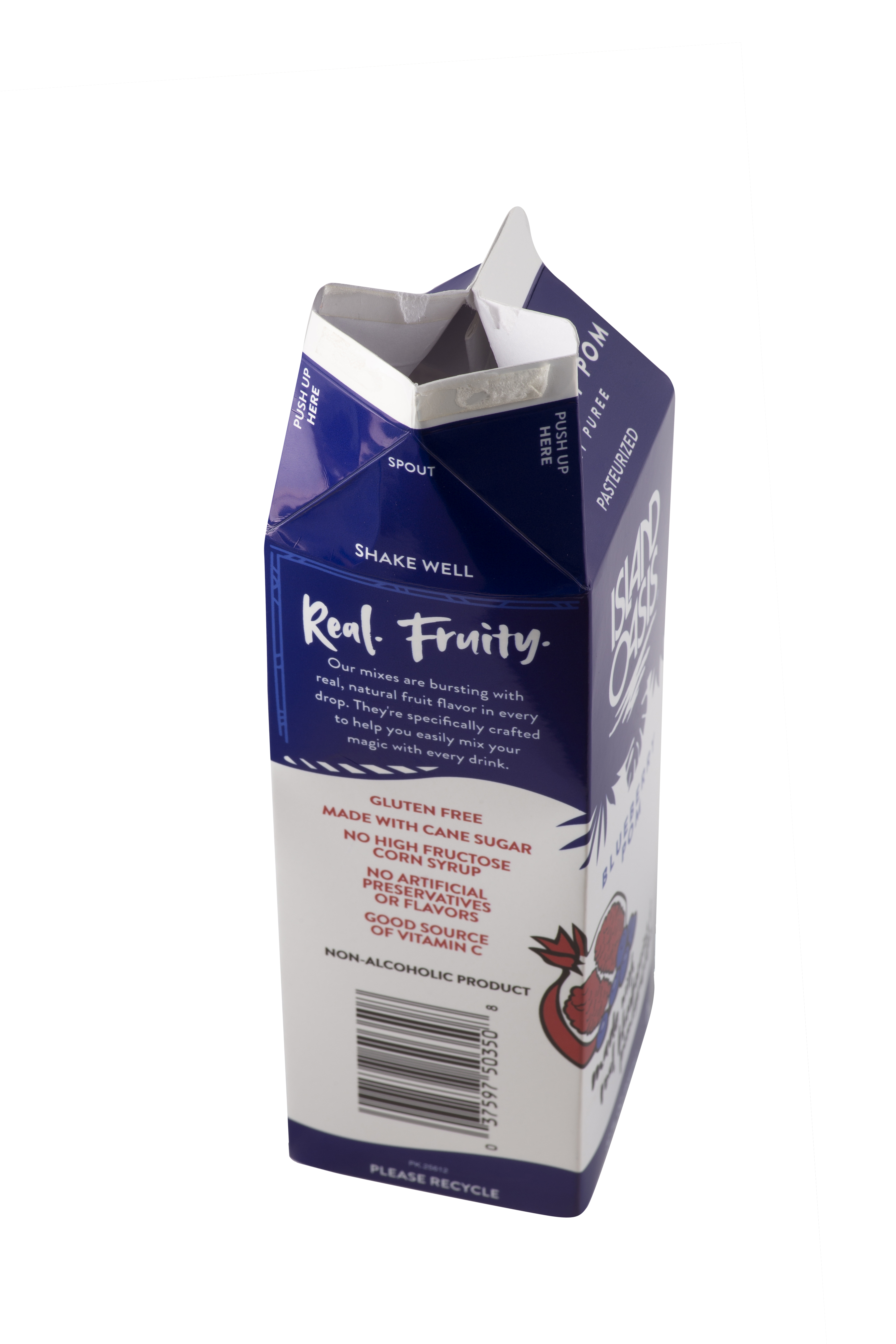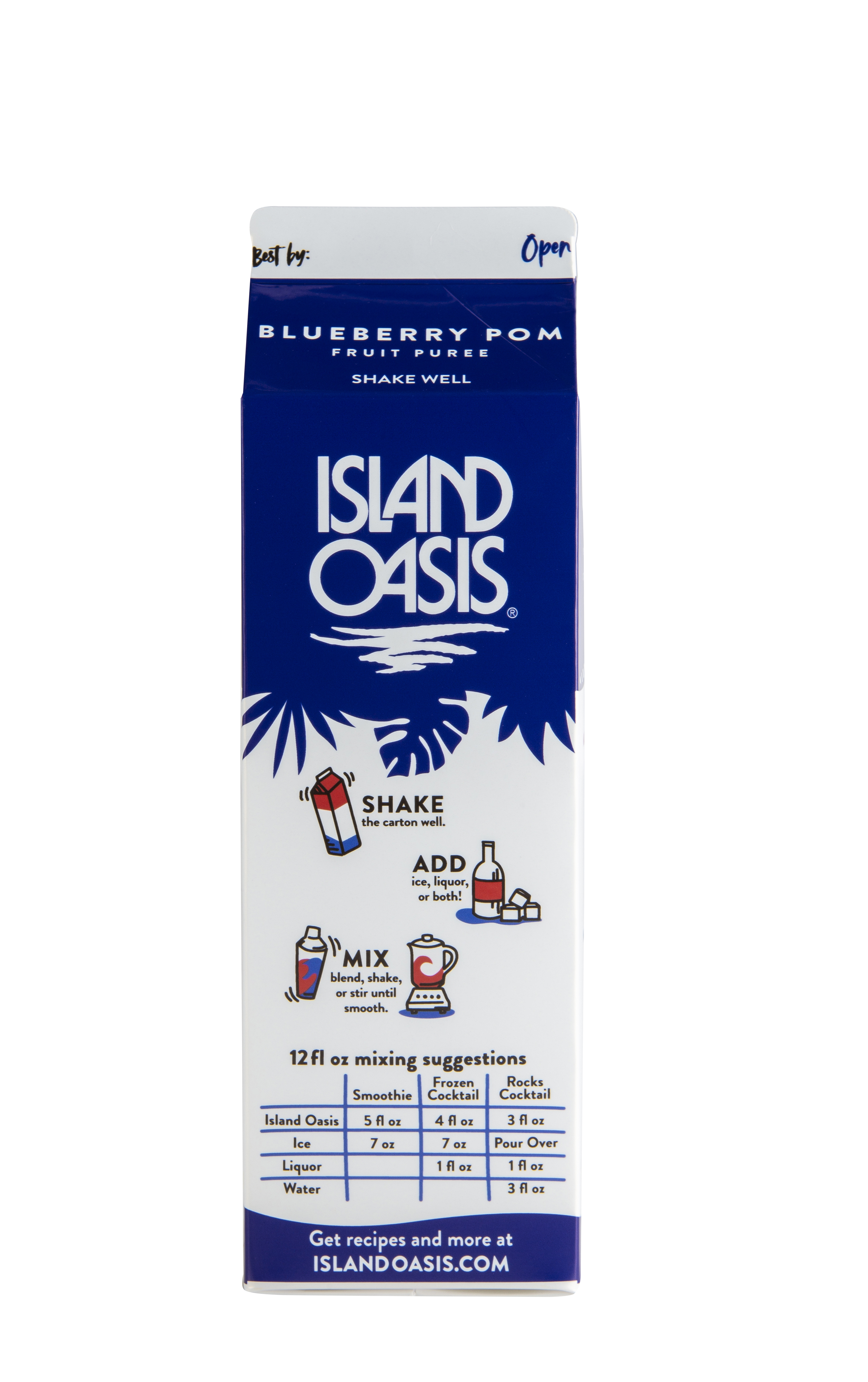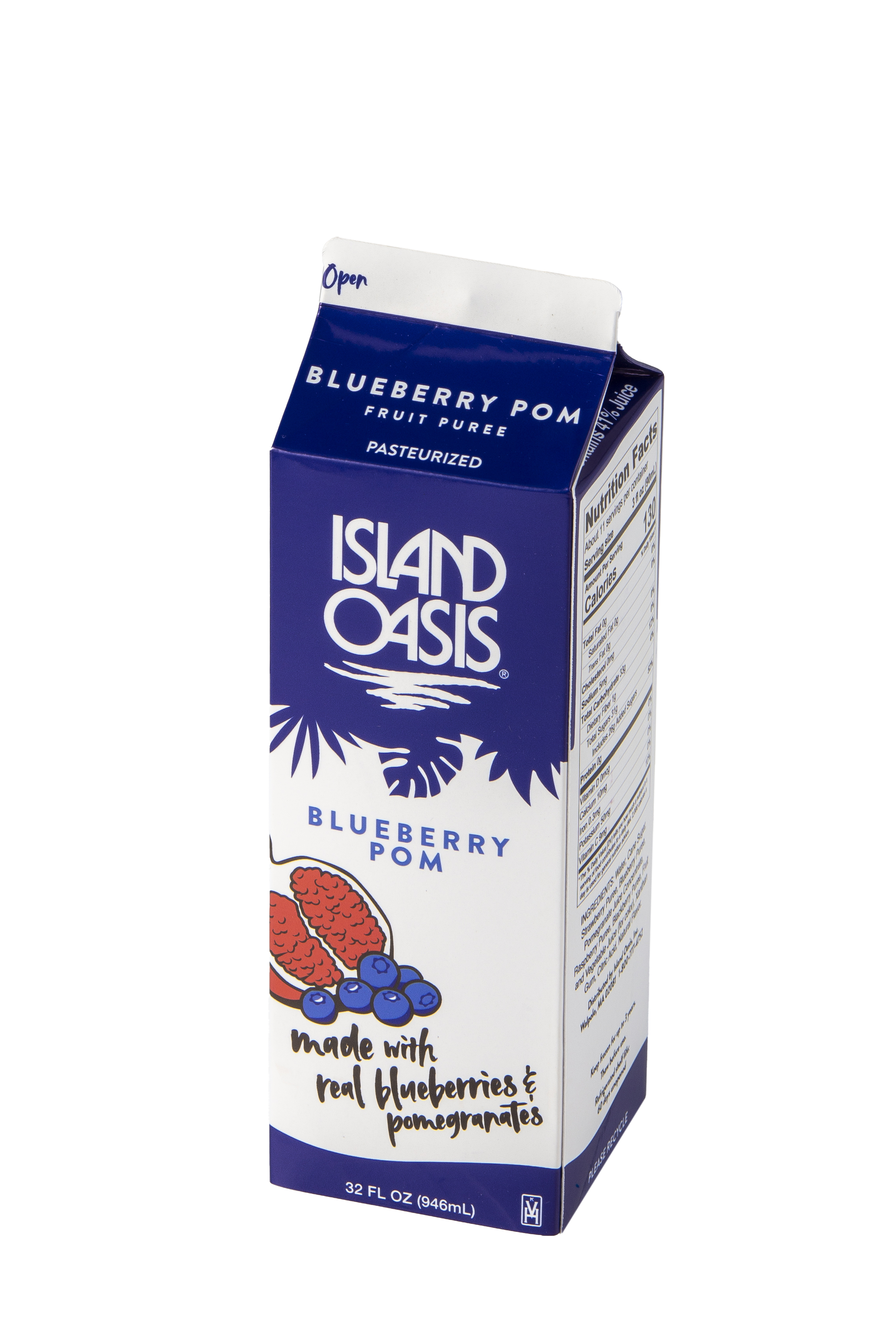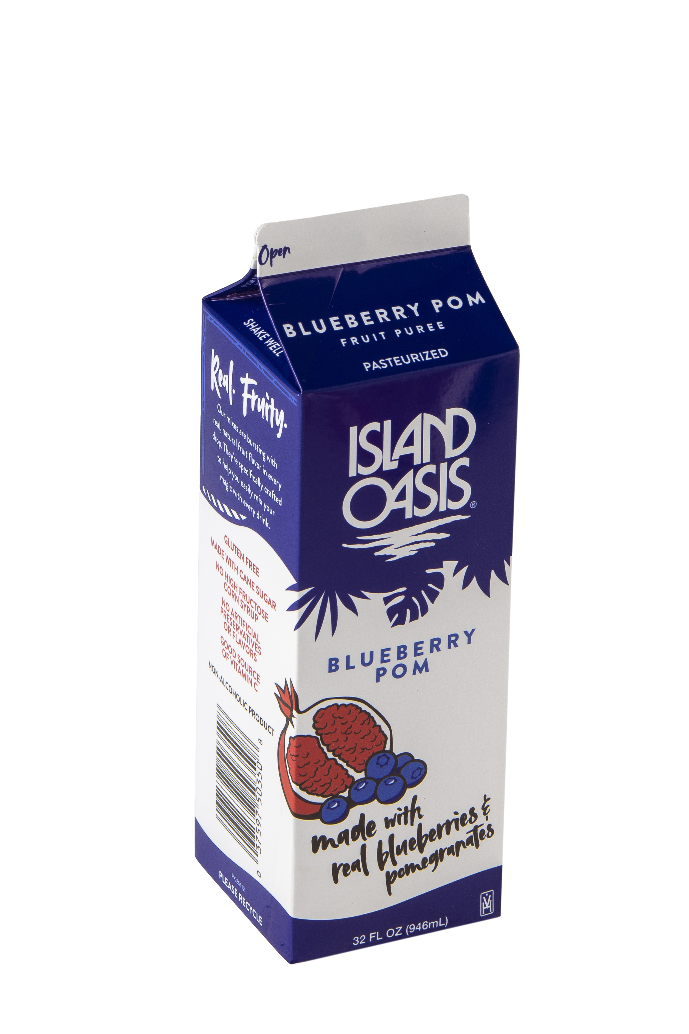 - Sweet, sun-ripened blueberries and juicy, jewel-like pomegranate make a powerhouse pair in this natural mix from Island Oasis! Now you can keep fruit at your fingertips without washing and storing delicate produce. With our frozen Blueberry Pom Mix, just pour and blend! Our smooth mix features a blend of juices and real fruit puree including a touch of seed and pulp for authentic texture. We enhance it with a hint of real sugar for a balanced flavor profile. At Island Oasis, we think fresh, healthy fruit should be easy to enjoy. So we work hard to bring our customers the freshest-tasting fruit nature has to offer. Our frozen Blueberry Pom Mix captures them at the peak of ripeness in a convenient liquid mix. Just thaw in the fridge and enjoy the fresh taste and health benefits of fruit without the hassle. It doesn't get much easier than that!From fruity smoothies to cocktails and mocktails, make them all quickly and easily with our frozen Blueberry Pom Mix. For a very berry smoothie, blend with ice. Or combine with another delicious Island Oasis mix for a custom flavor. Get creative and invent signature cocktails and mocktails with big blueberry taste. No matter how you blend it, you'll have fresh-tasting fruit at your fingertips with our mix. This gluten-free, natural Island Oasis Blueberry Pom Mix contains no artificial flavors, colors or preservatives, high fructose corn syrup, or trans fats. Kosher certified.