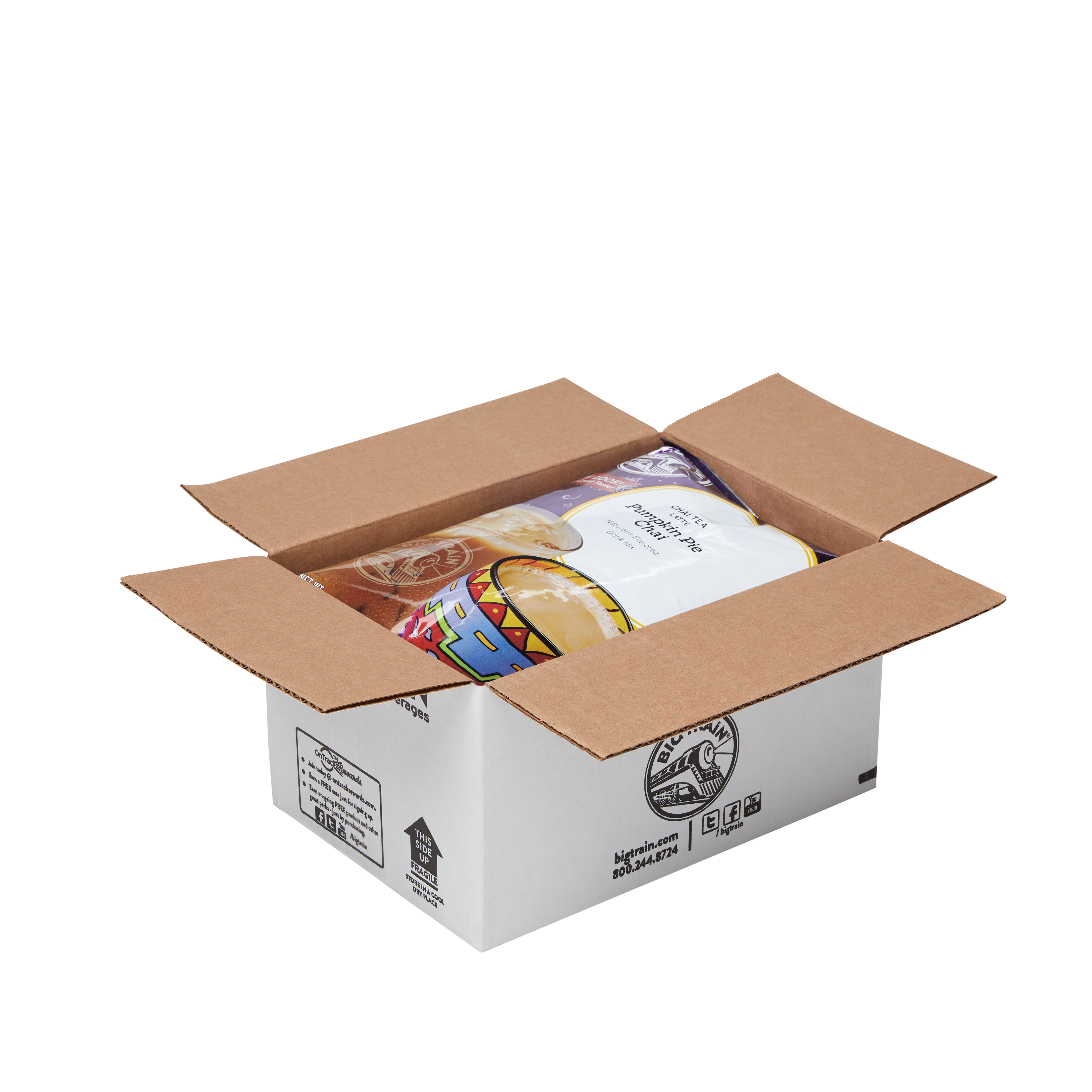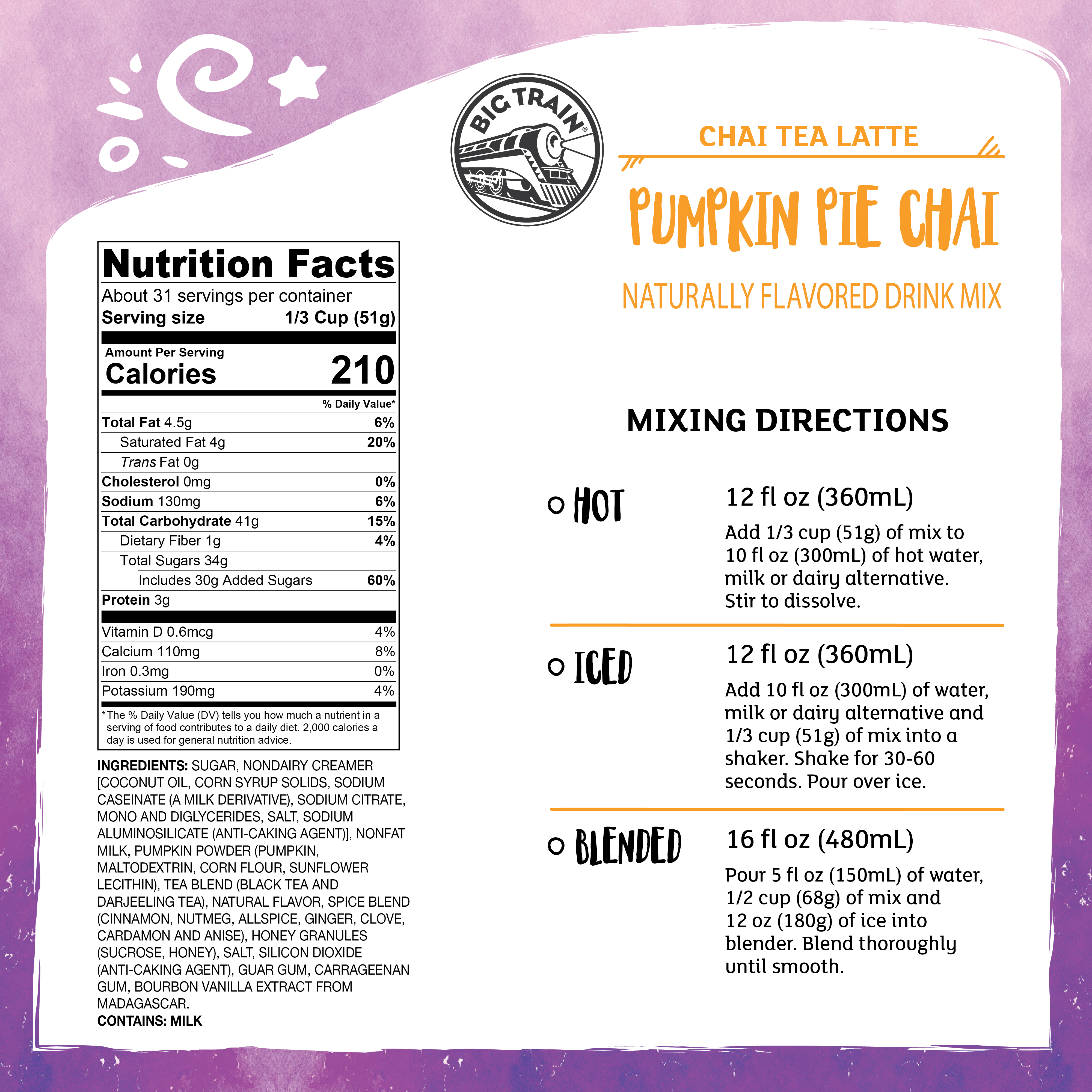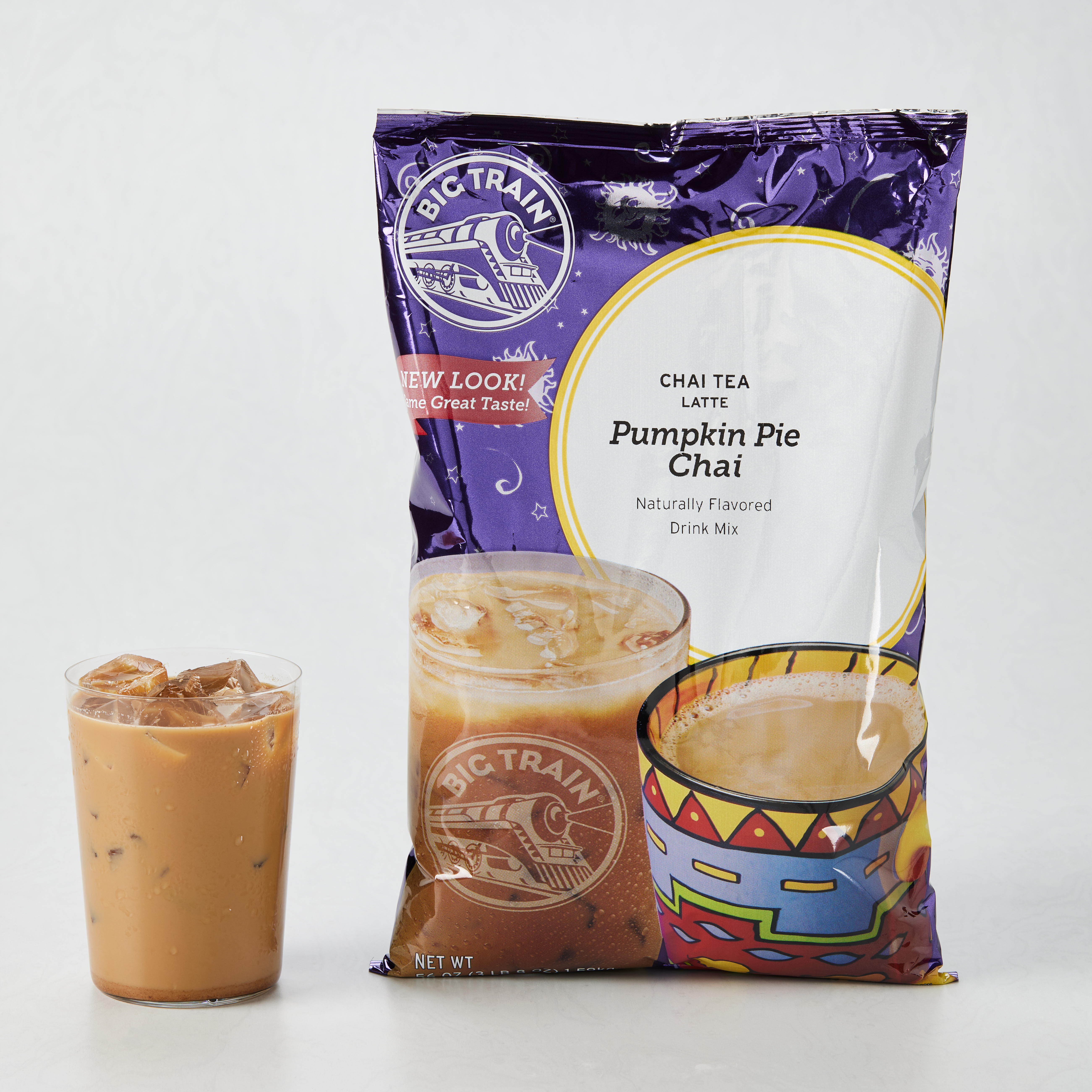 - Pumpkin pie and chai spices pair up deliciously in Big Train's Pumpkin Pie Chai Tea Latte Mix! Taste a holiday favorite with our East meets West fusion of a seasonal treat and exotic taste from India. Real pumpkin stars in our delicious mix for authentic autumn experience. We craft our invigorating signature chai with black and Darjeeling teas to revive the senses, then we add allspice and nutmeg to our authentic Masala blend for true pumpkin pie flavor. Serve hot, iced, or blended.