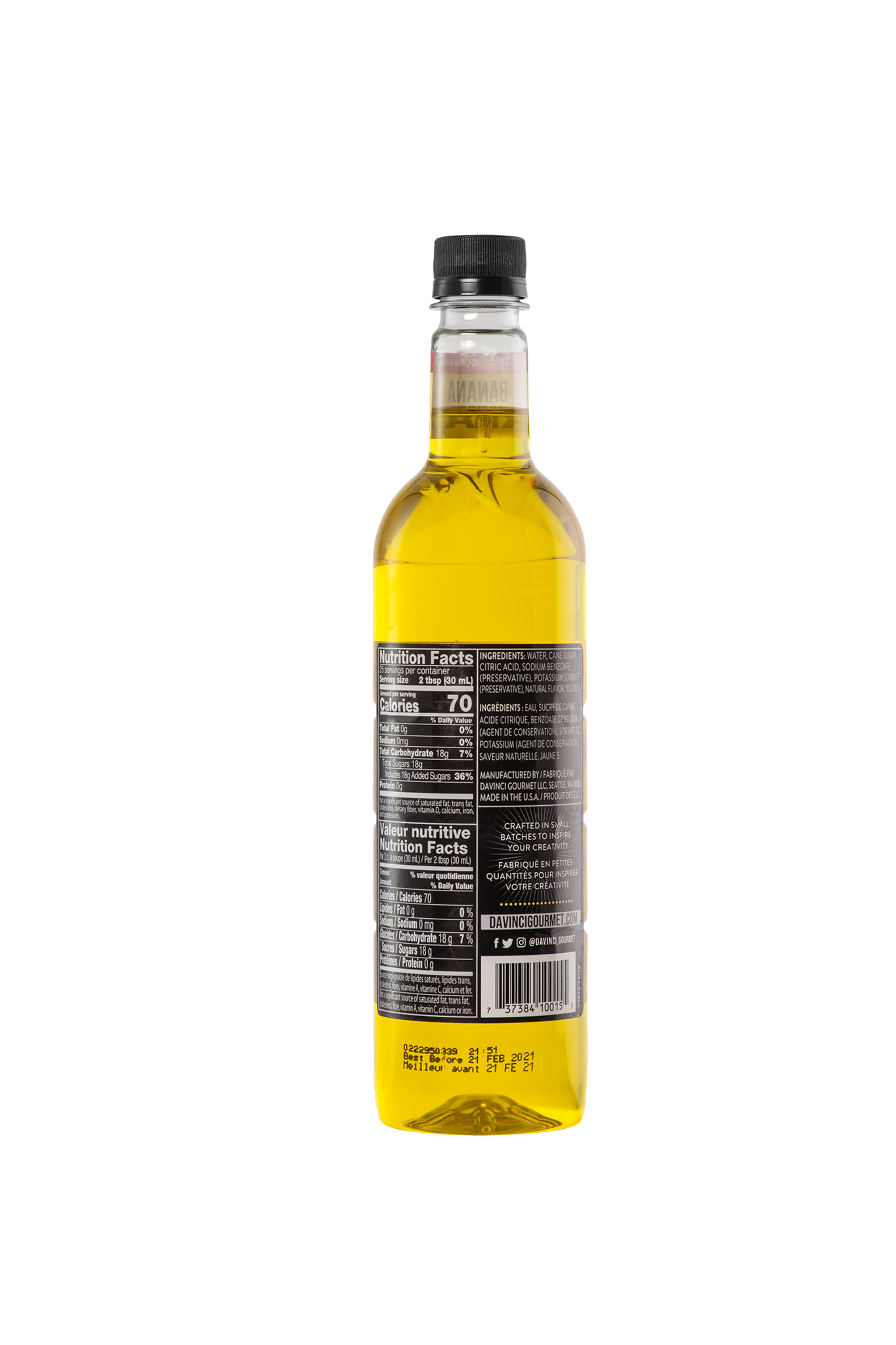 - Sweet, velvety banana flavor infuses every drop of this delicious syrup from DaVinci Gourmet. Add it to tea, coffee, tropical cocktails and mocktails and desserts for sweet banana flavor and aroma. At DaVinci Gourmet, we craft our Classic line of syrups with the highest-quality ingredients for incomparable flavor. We sweeten our banana syrup with pure cane sugar for balanced flavor. For smooth results, we specially formulate our Classic syrups to stand up to hot drinks and to resist curdling dairy products.Try DaVinci Gourmet's Classic Banana syrup in a variety of beverage or culinary applications. Invent signature drinks or intensify and sweeten the fruity taste of classic desserts like Bananas Foster with a splash of this delicious syrup. Or combine with syrups from our wide selection of Classic, Naturals and Fruit Innovations products to create unique custom flavors. Our Classic Banana syrup is Kosher-Pareve certified.