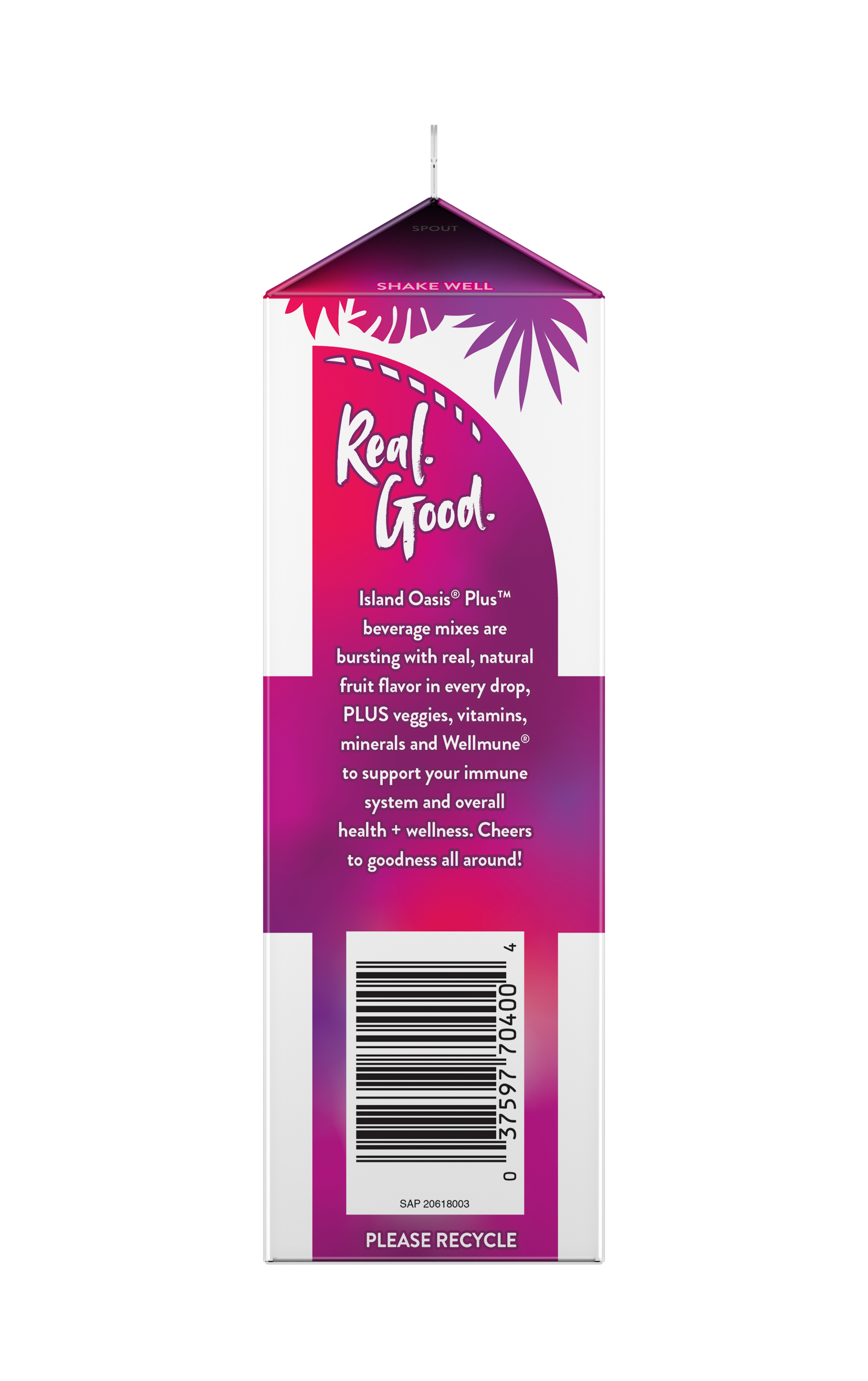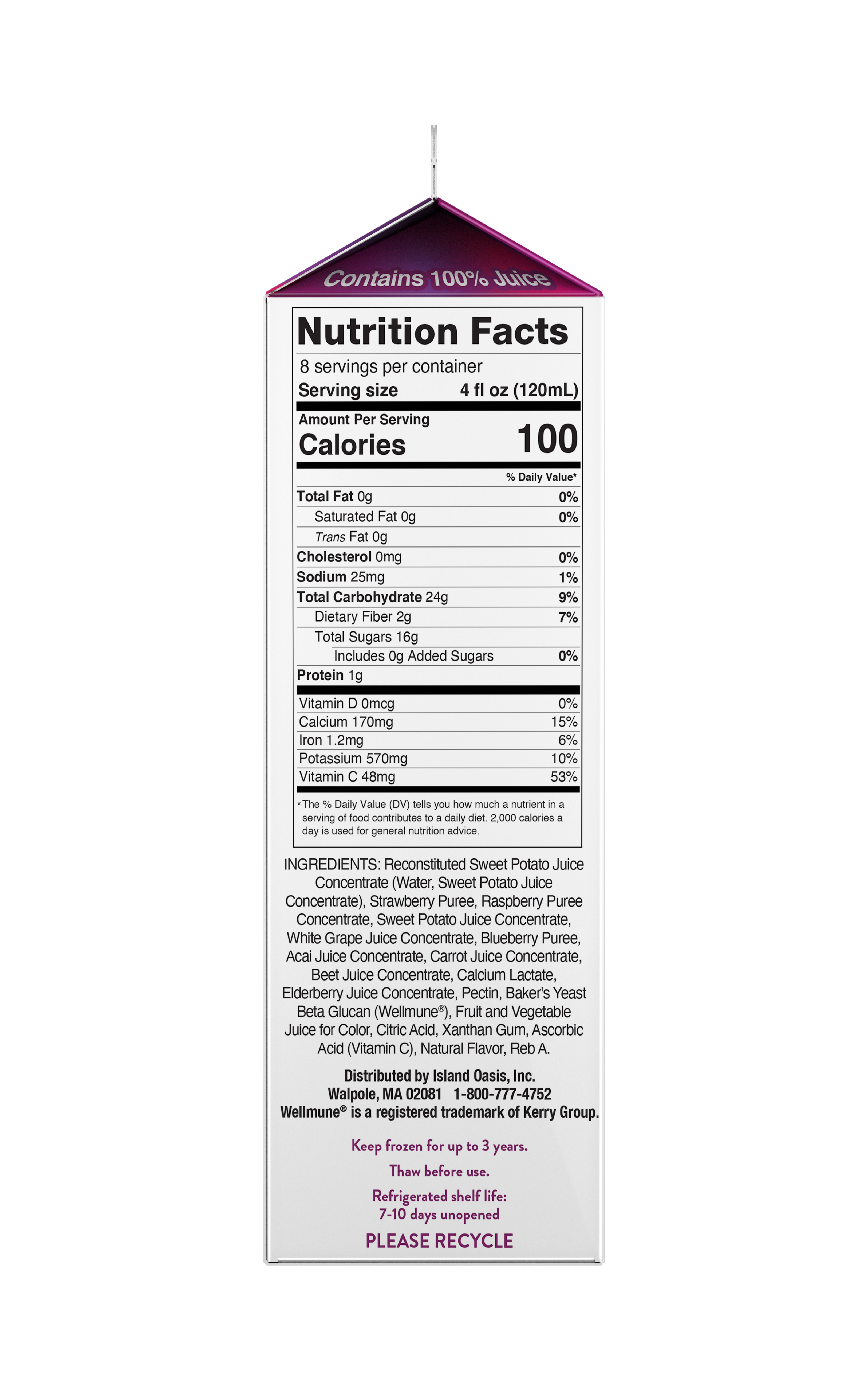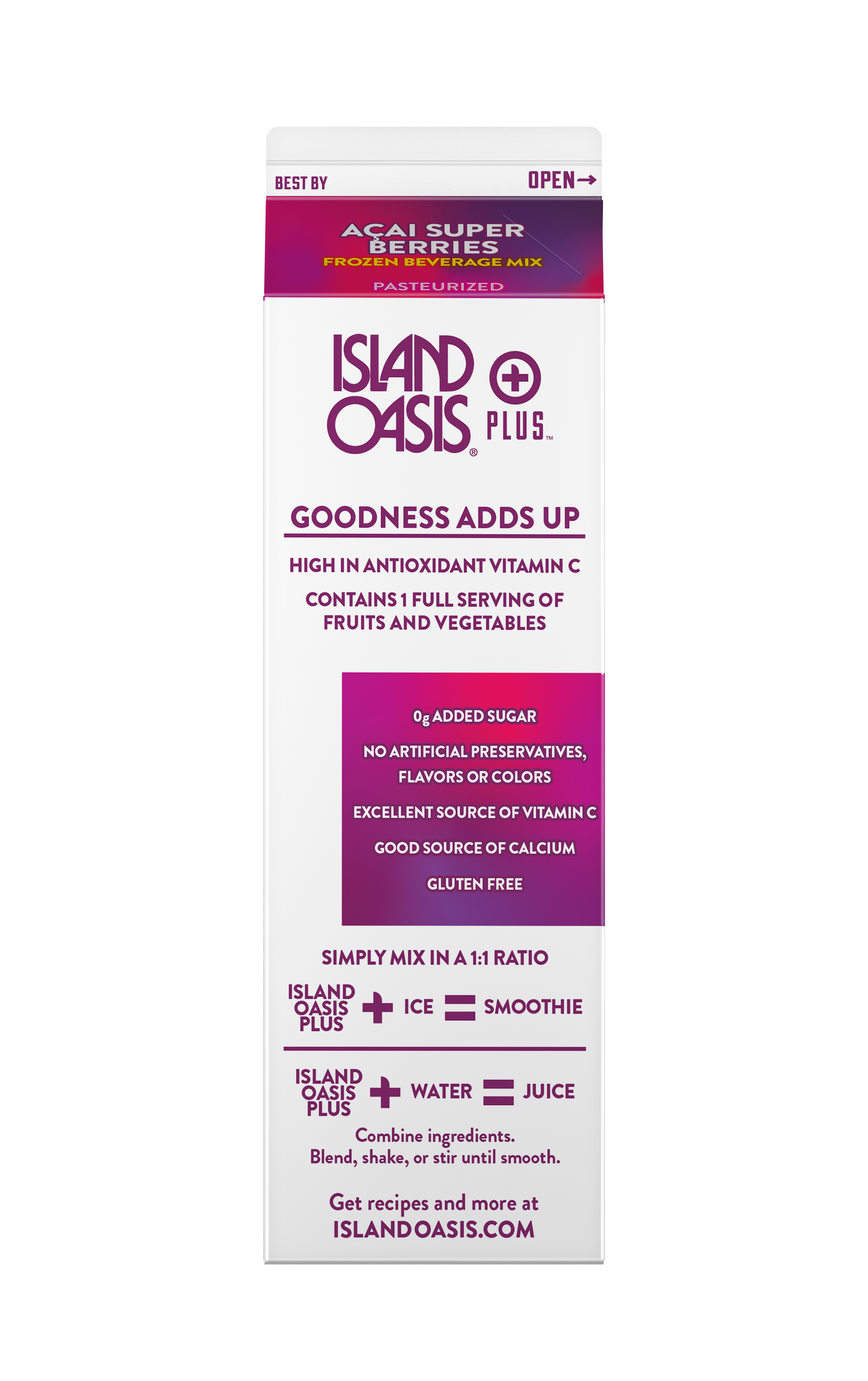 - Island Oasis Plus Acai Super Berries mix offers functional health, wellness and goodness in a cup. Made with real acai, elderberries, and vegetables and premium ingredients, Island Oasis Plus delivers on the sensible escape your customers have been craving. Made with Wellmune(R) to help strengthen the immune system, support overall health and wellness, maintain overall physical health, protect against the harmful effects of stress, and promote healthy energy levels and mental clarity. In addition, Island Oasis Plus Acai Super Berries is high in antioxidant vitamin C, a good source of calcium and potassium, contains no artificial flavors, preservatives or colors, has 0g added sugar, and is gluten free and kosher.
