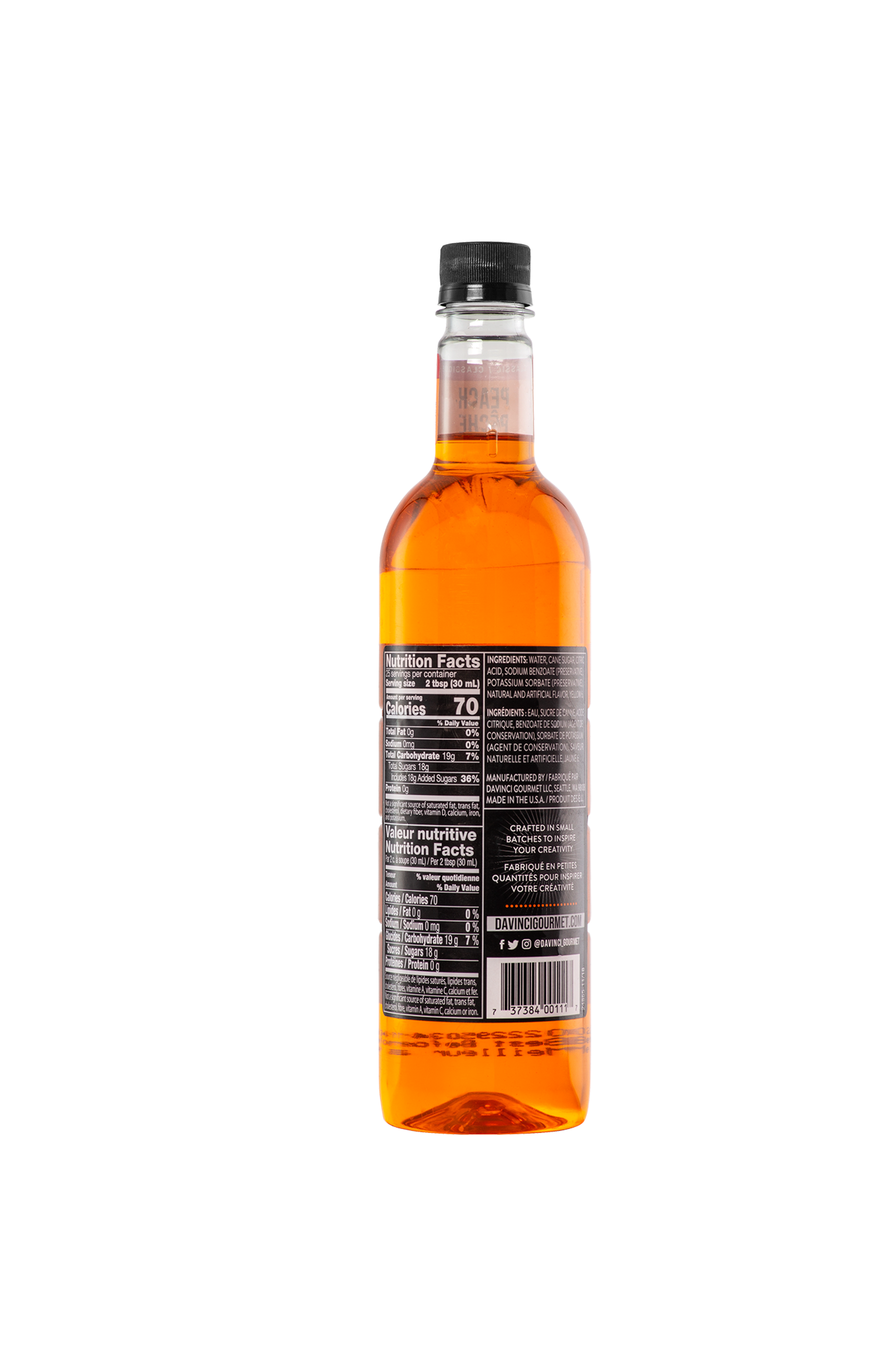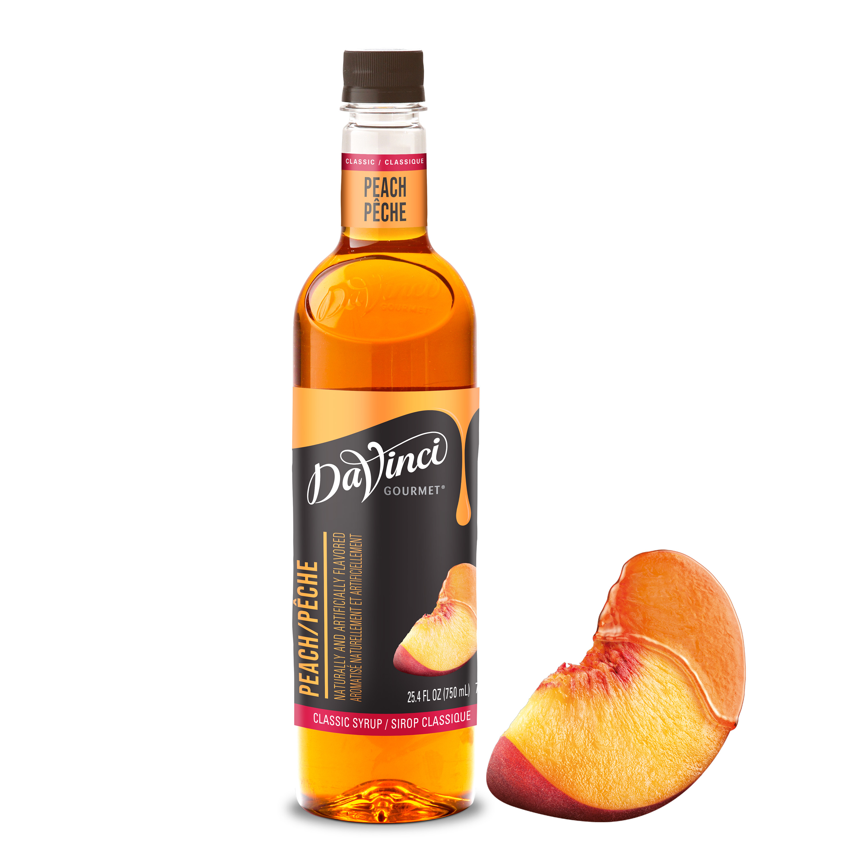 - Sip the fruity flavor of sun-ripened peaches with this juicy-tasting syrup from DaVinci Gourmet. Our Classic Peach syrup features fresh peach flavor balanced with pure can sugar for the perfect amount of sweetness. At DaVinci Gourmet, we use only the finest ingredients to create products that the professionals trust to make delicious beverages every time. Our Classic Peach syrup is formulated to mix easily in cold beverages for flavor in every drop. And it resists curdling for a consistent texture. This fruity DaVinci Gourmet Classic Peach syrup makes a delicious addition to a variety of beverage and culinary applications. Or combine with syrups from our wide selection of Classic, Naturals and Fruit Innovations products to create unique custom flavors. Our Classic Peach syrup is Kosher-Pareve certified.