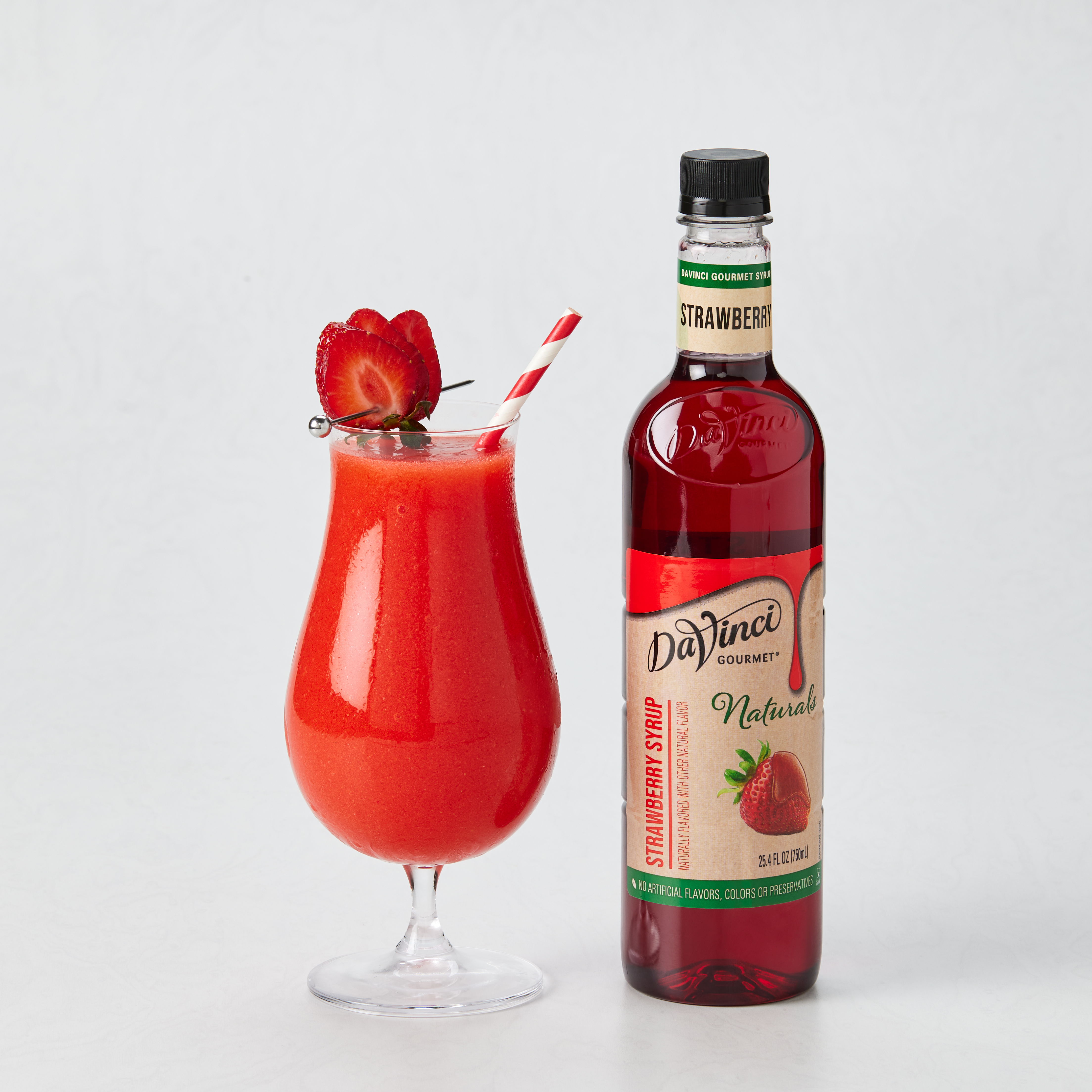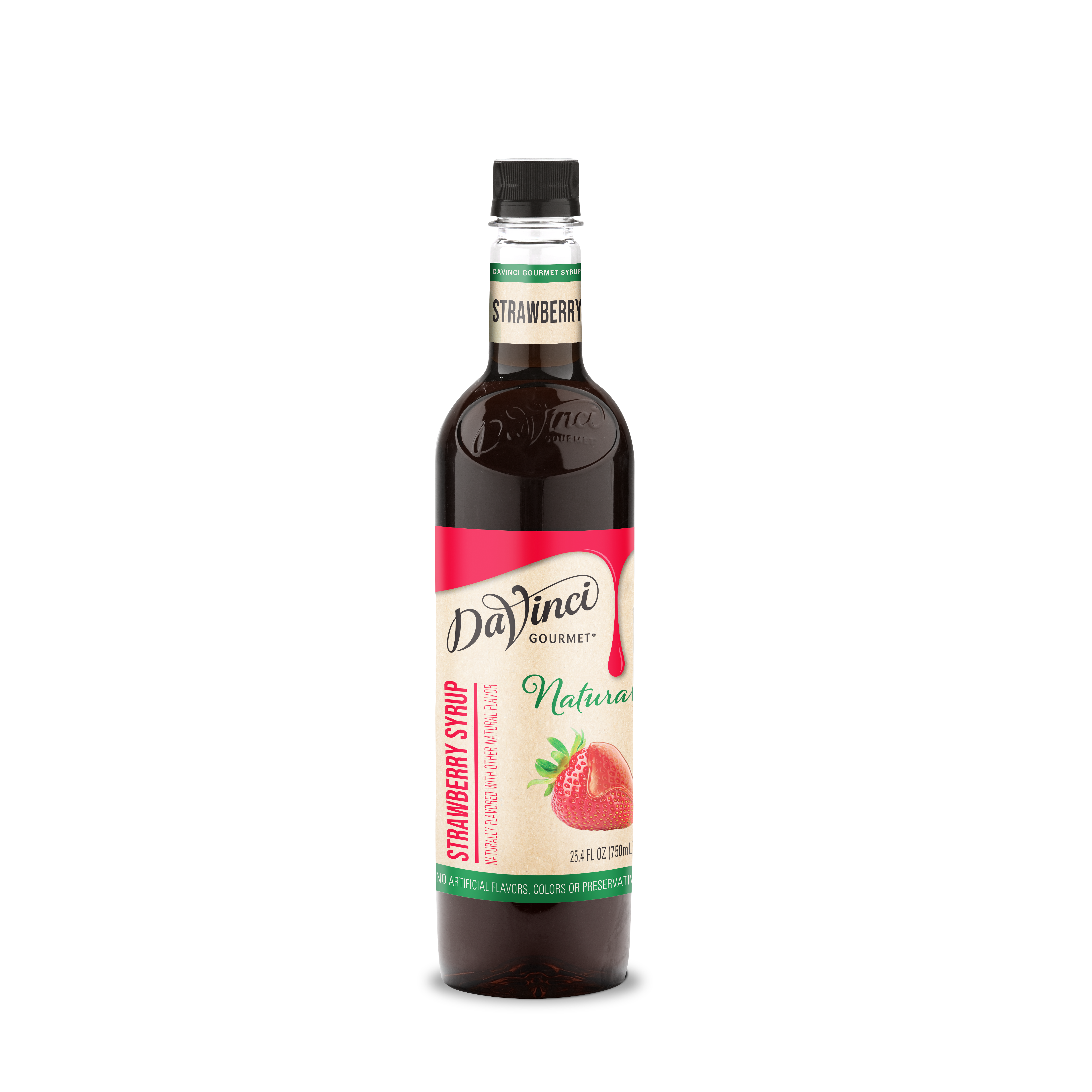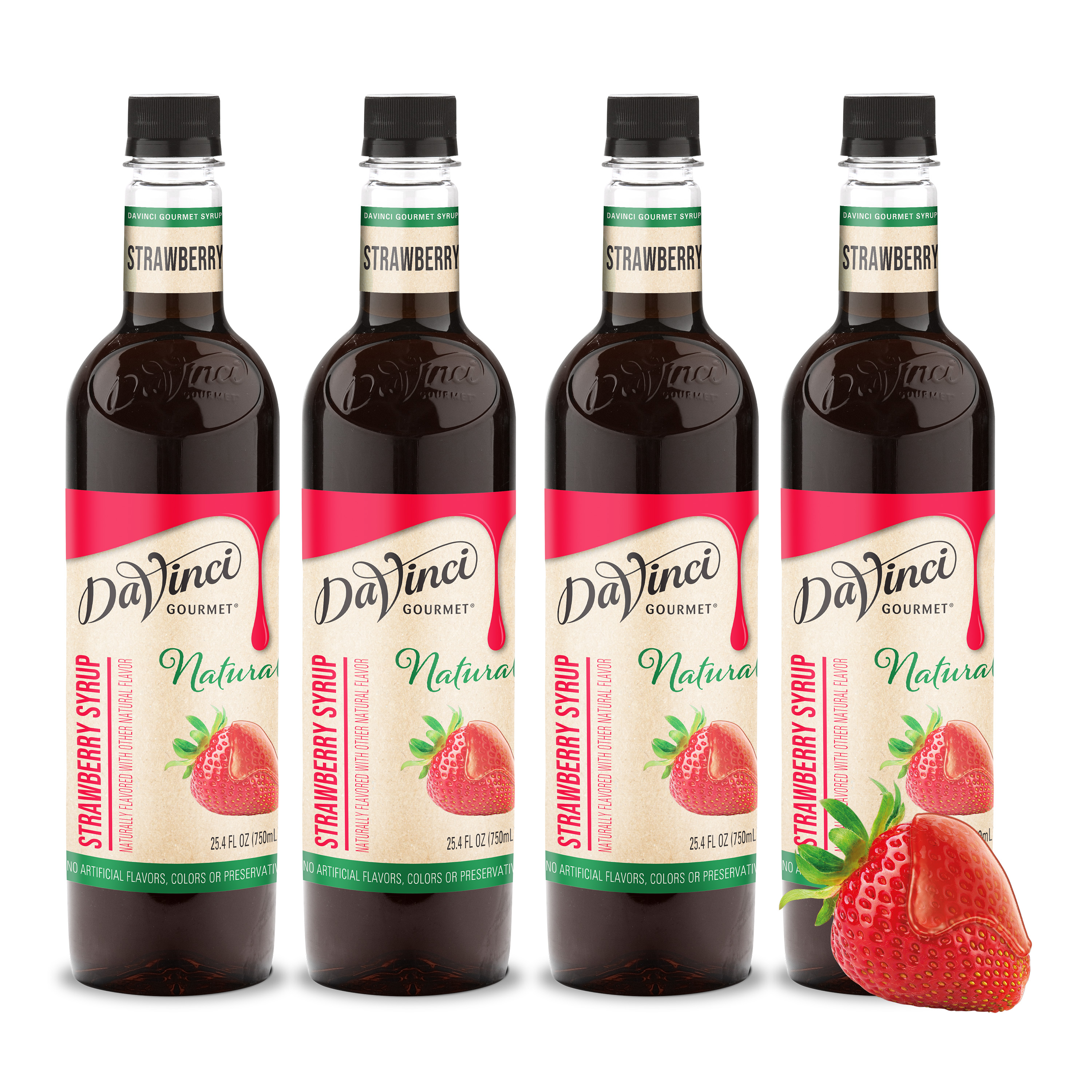 - Taste ripe, sweet berries in this delicious scarlet-hued natural strawberry syrup. If you've ever wanted to bottle the essence of summer, our strawberry syrup delivers flavor at the peak of freshness. At DaVinci Gourmet, we craft our Naturals line of syrups from the highest-quality ingredients. Sweetened with pure cane sugar, our natural strawberry syrup highlights the taste of fresh berries and real fruit juice for authentic flavor. Hot or cold, it makes a versatile addition to a wide range of culinary and beverage applications. It pairs perfectly with almost any flavor profile, including coffee and hot cocoa drinks. In cocktail recipes, try in place of grenadine for natural berry flavor and vibrant red color. Drizzle on ice cream or sorbet for bright, natural strawberry flavor. Or combine with syrups from our wide selection of Classic, Naturals and Fruit Innovations products to create unique custom flavors for all your signature drinks. Our strawberry syrup contains no artificial colors, flavors or preservatives. Made with real fruit juice.