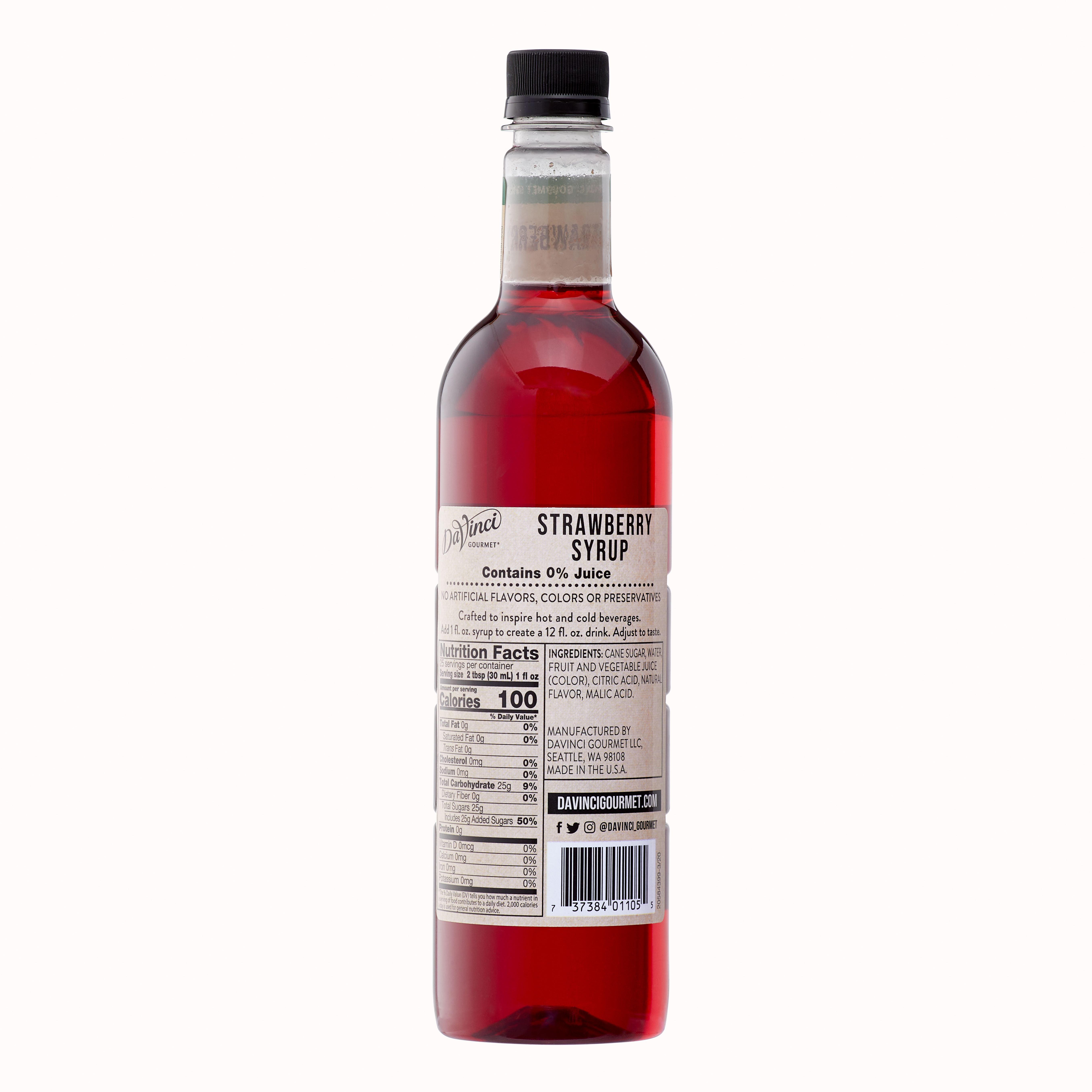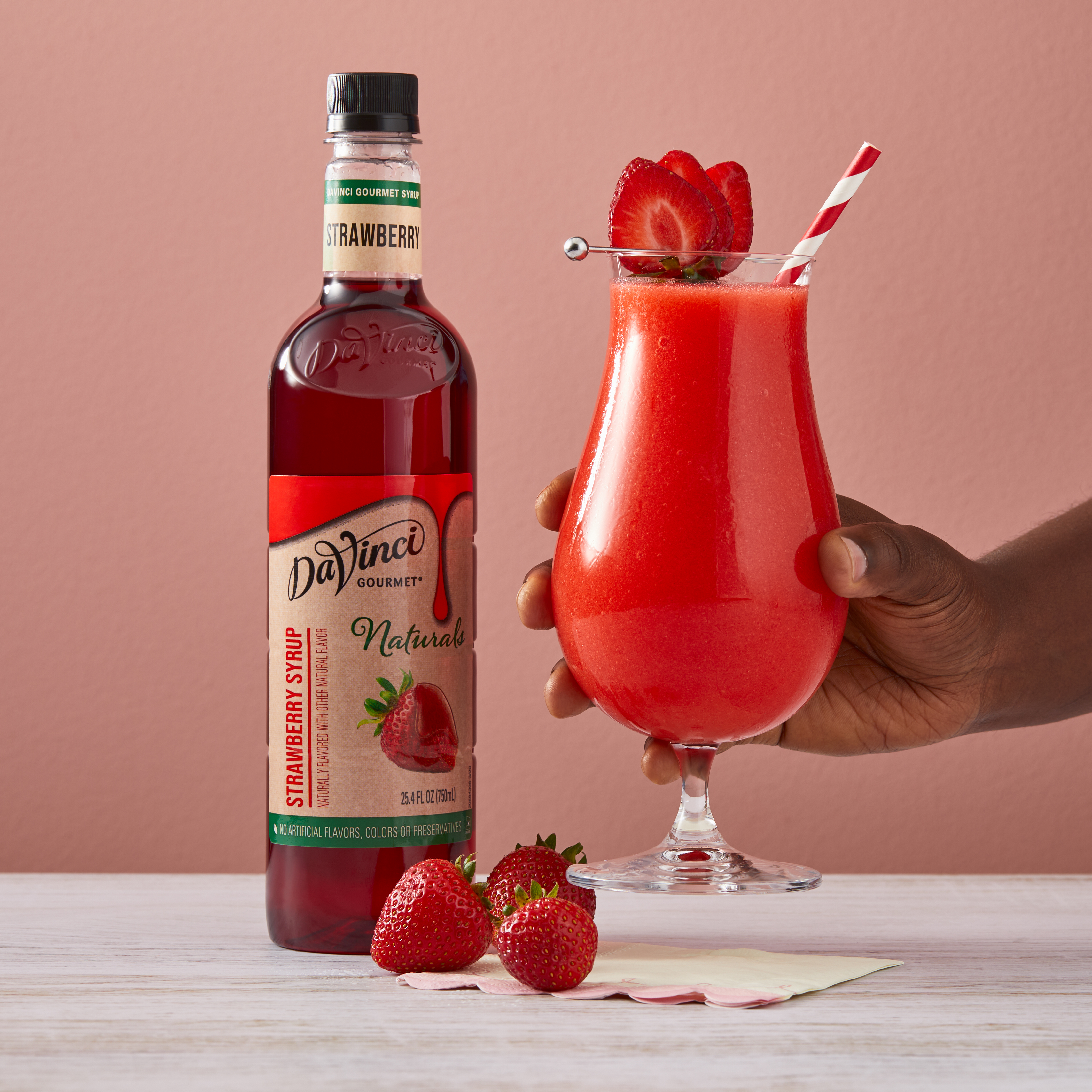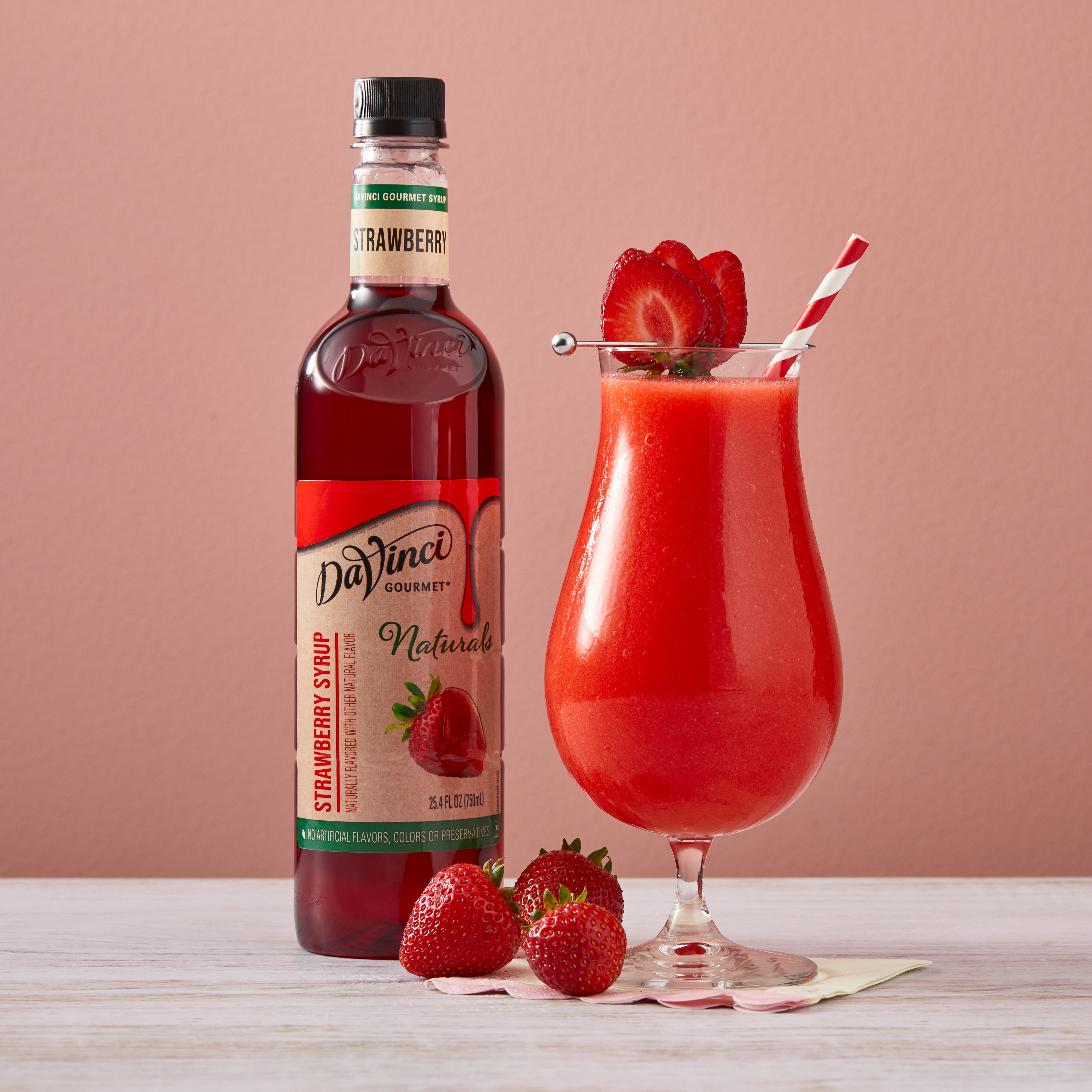 - Taste ripe, sweet berries in this delicious scarlet-hued natural strawberry syrup. If you've ever wanted to bottle the essence of summer, our strawberry syrup delivers flavor at the peak of freshness. At DaVinci Gourmet, we craft our Naturals line of syrups from the highest-quality ingredients. Sweetened with pure cane sugar, our natural strawberry syrup highlights the taste of fresh berries and real fruit juice for authentic flavor. Hot or cold, it makes a versatile addition to a wide range of culinary and beverage applications. It pairs perfectly with almost any flavor profile, including coffee and hot cocoa drinks. In cocktail recipes, try in place of grenadine for natural berry flavor and vibrant red color. Drizzle on ice cream or sorbet for bright, natural strawberry flavor. Or combine with syrups from our wide selection of Classic, Naturals and Fruit Innovations products to create unique custom flavors for all your signature drinks. Our strawberry syrup contains no artificial colors, flavors or preservatives. Made with real fruit juice.