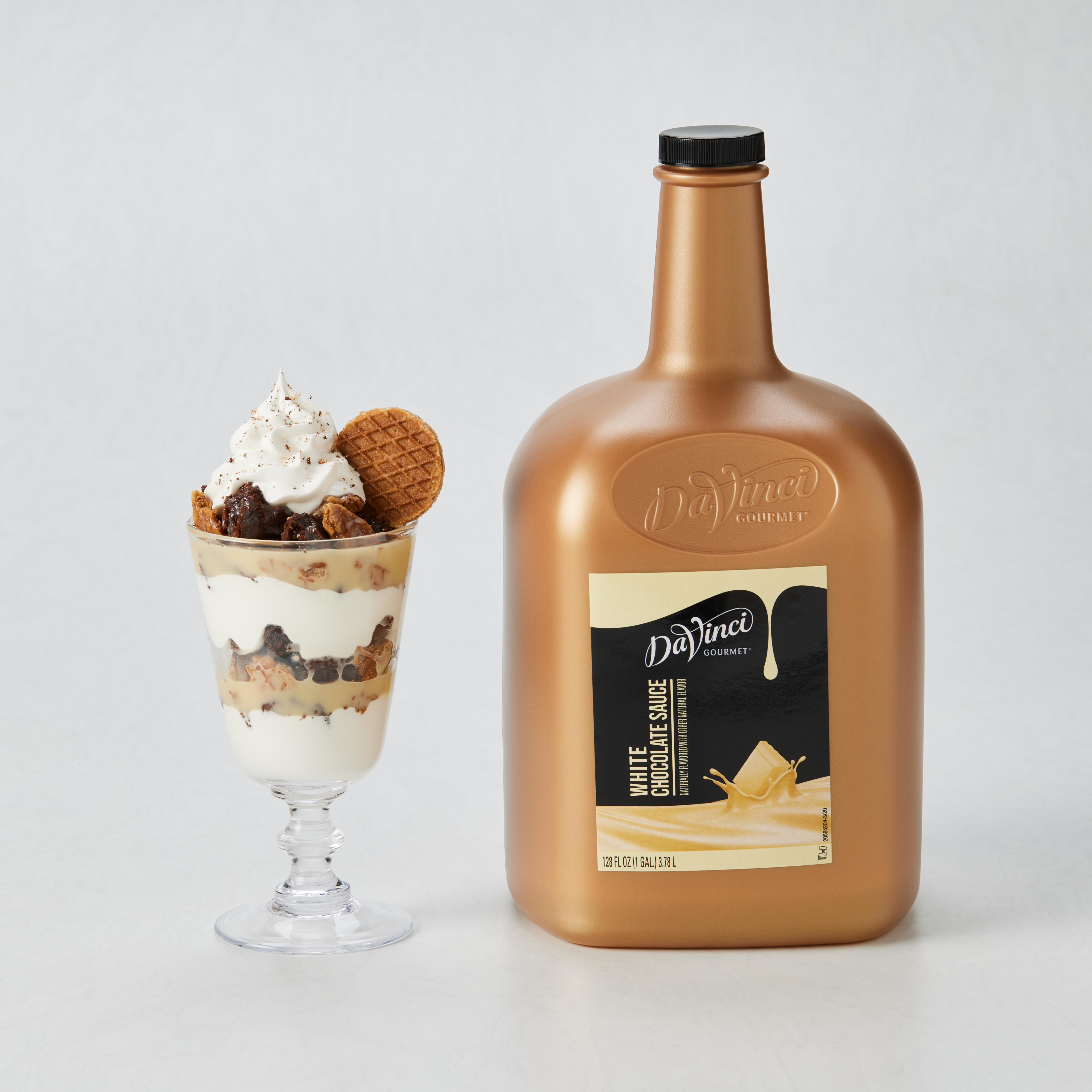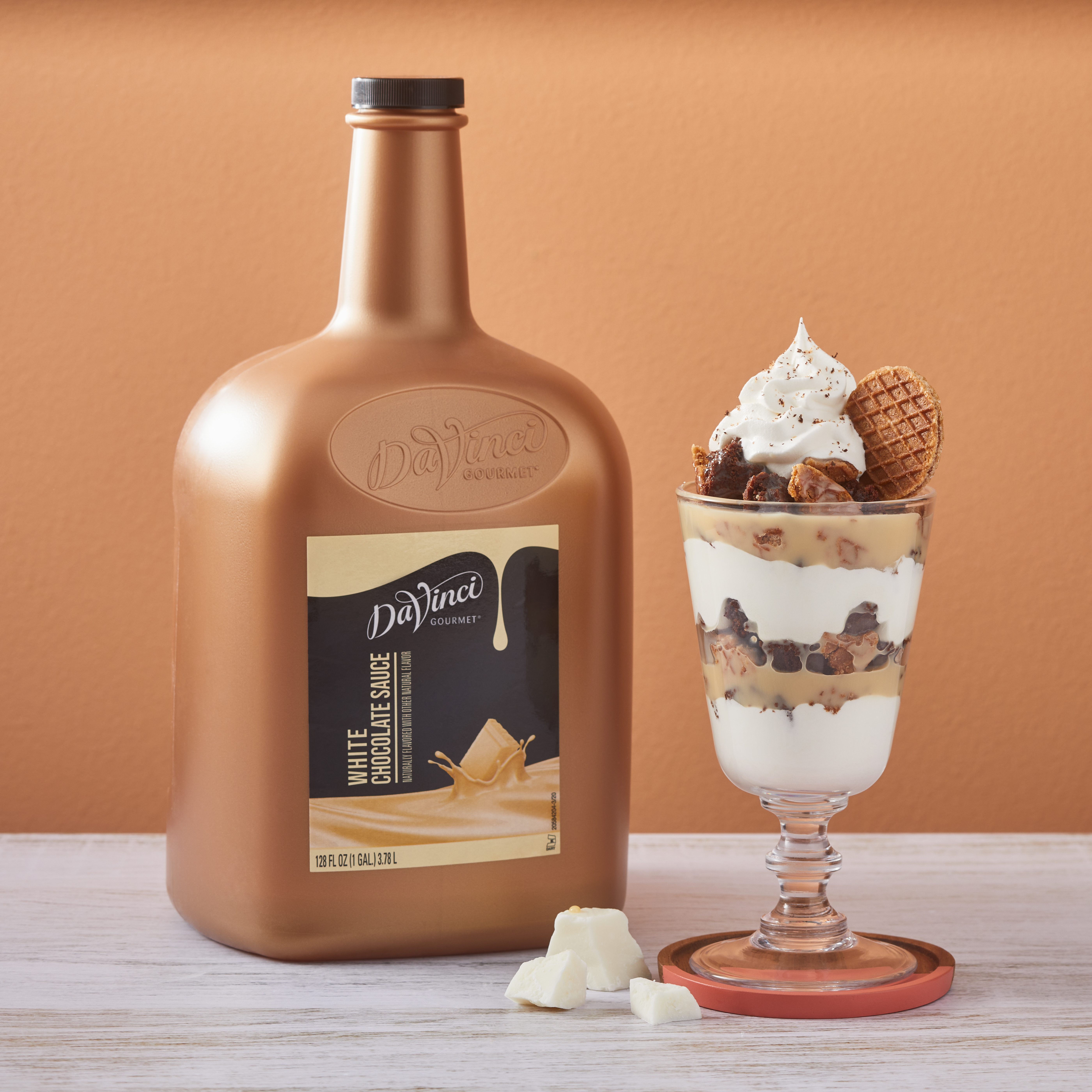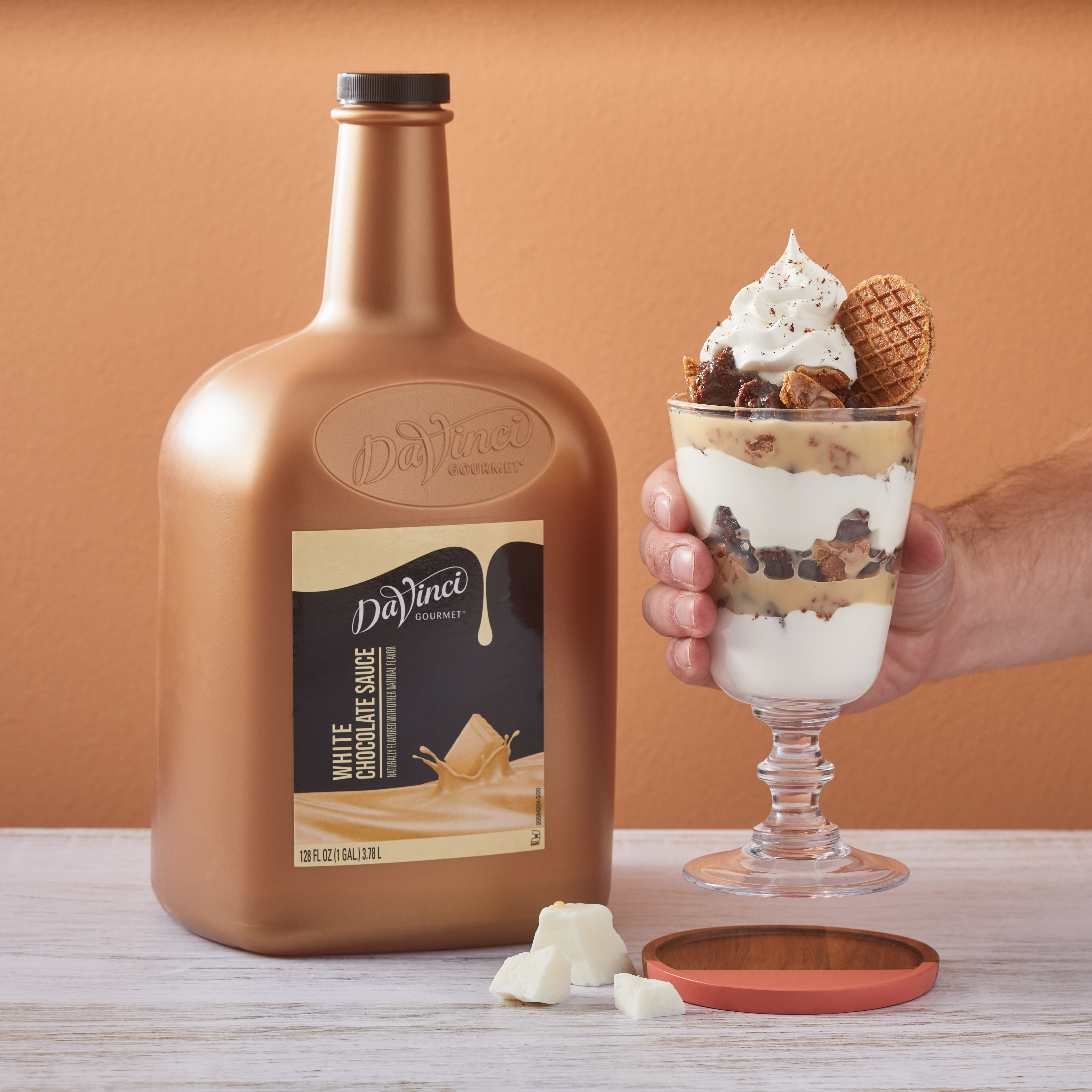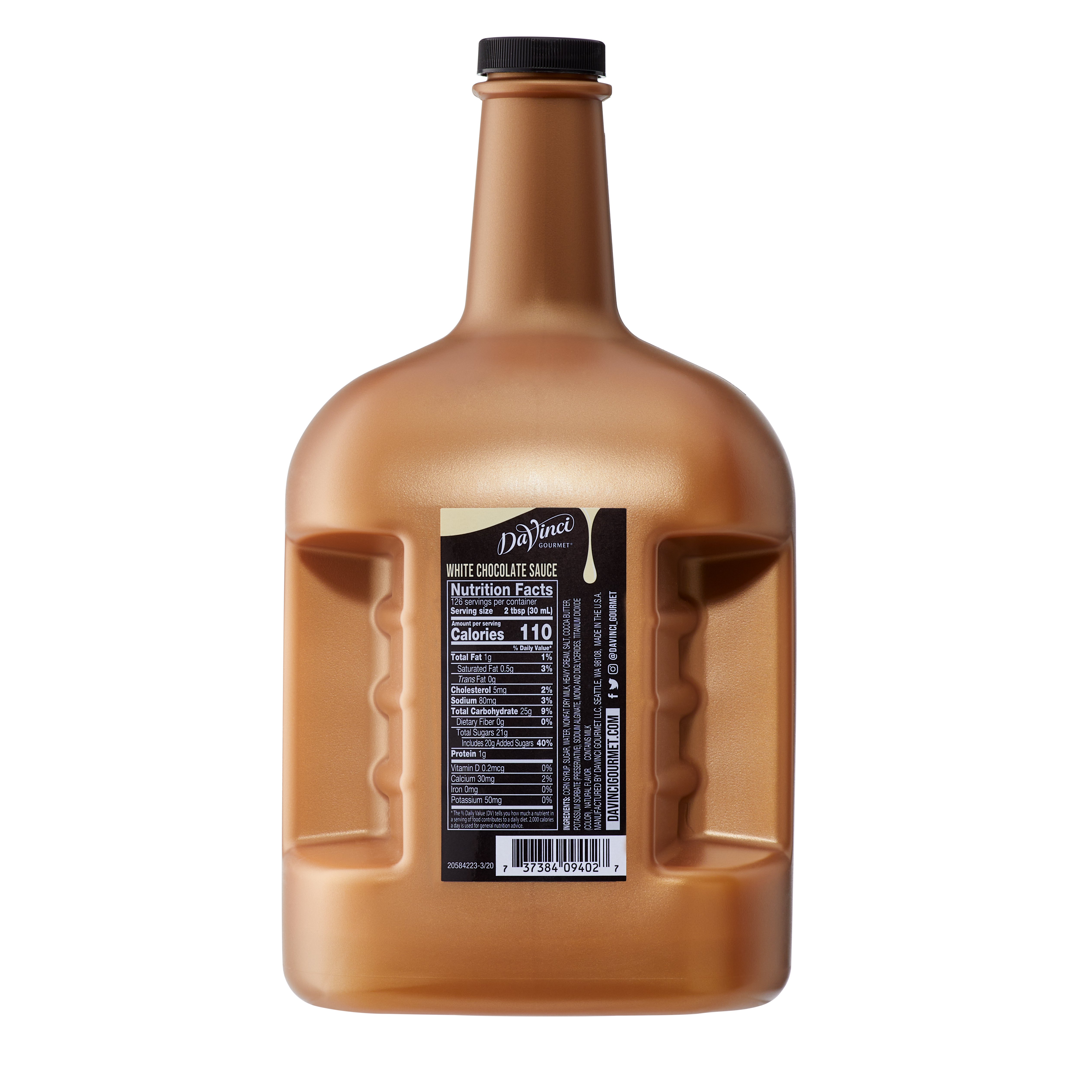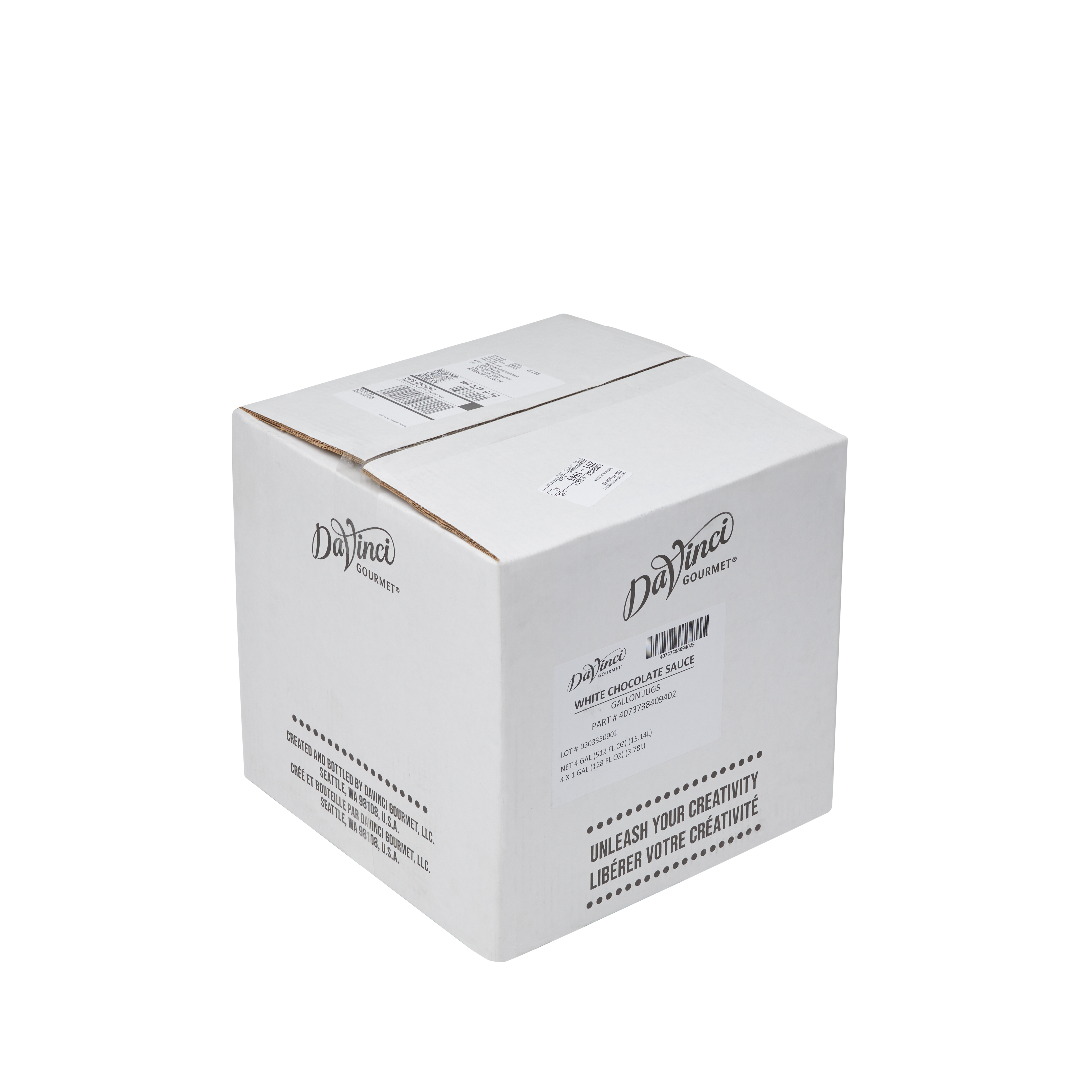 - Enhance any beverage or culinary creation with this rich-tasting white chocolate sauce from DaVinci Gourmet. Our Classic White Chocolate Sauce features the taste of creamy white chocolate and sweet vanilla flavor At DaVinci Gourmet, we cultivate our reputation for premium products by using only the highest-quality ingredients. Our white chocolate sauce contains heavy cream and rich cocoa butter for truly decadent taste. Across the globe, professionals trust DaVinci Gourmet products like this one to create delicious beverages and culinary offerings that delight their customers. Our versatile Classic White Chocolate sauce makes a delicious addition to a wide range of beverage and culinary applications. Try in blended drinks or frappes to enhance with rich flavor. Or drizzle this over whipped cream on beverages for a rich ribbon of white chocolate decadence. Use as an ice cream topping, or add to milkshakes to enhance their flavor. Our Classic White Chocolate sauce is Kosher-Dairy certified. This DaVinci Gourmet Classic White Chocolate Sauce is available in a 1/2 gallon plastic jug or a 1 gallon plastic jug.