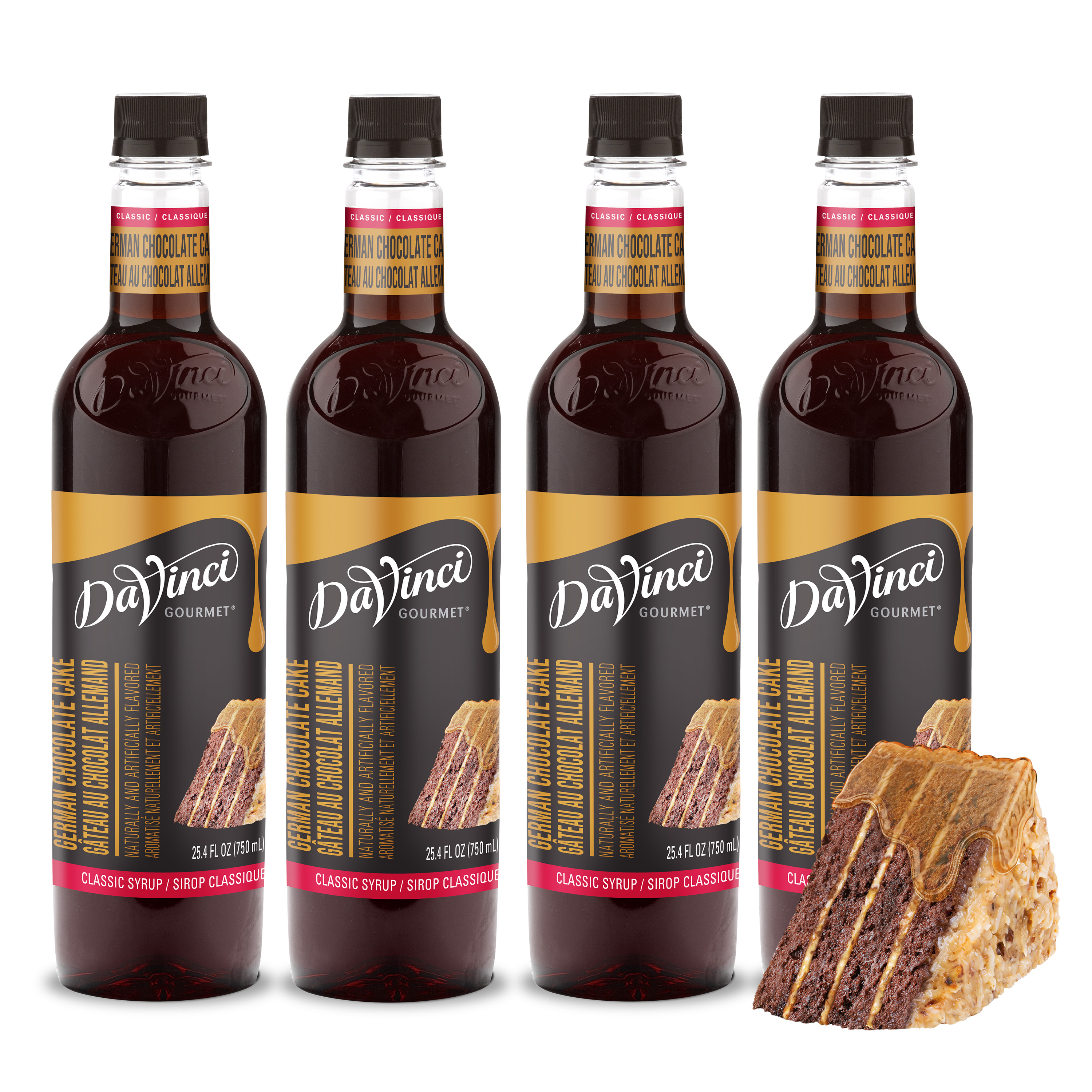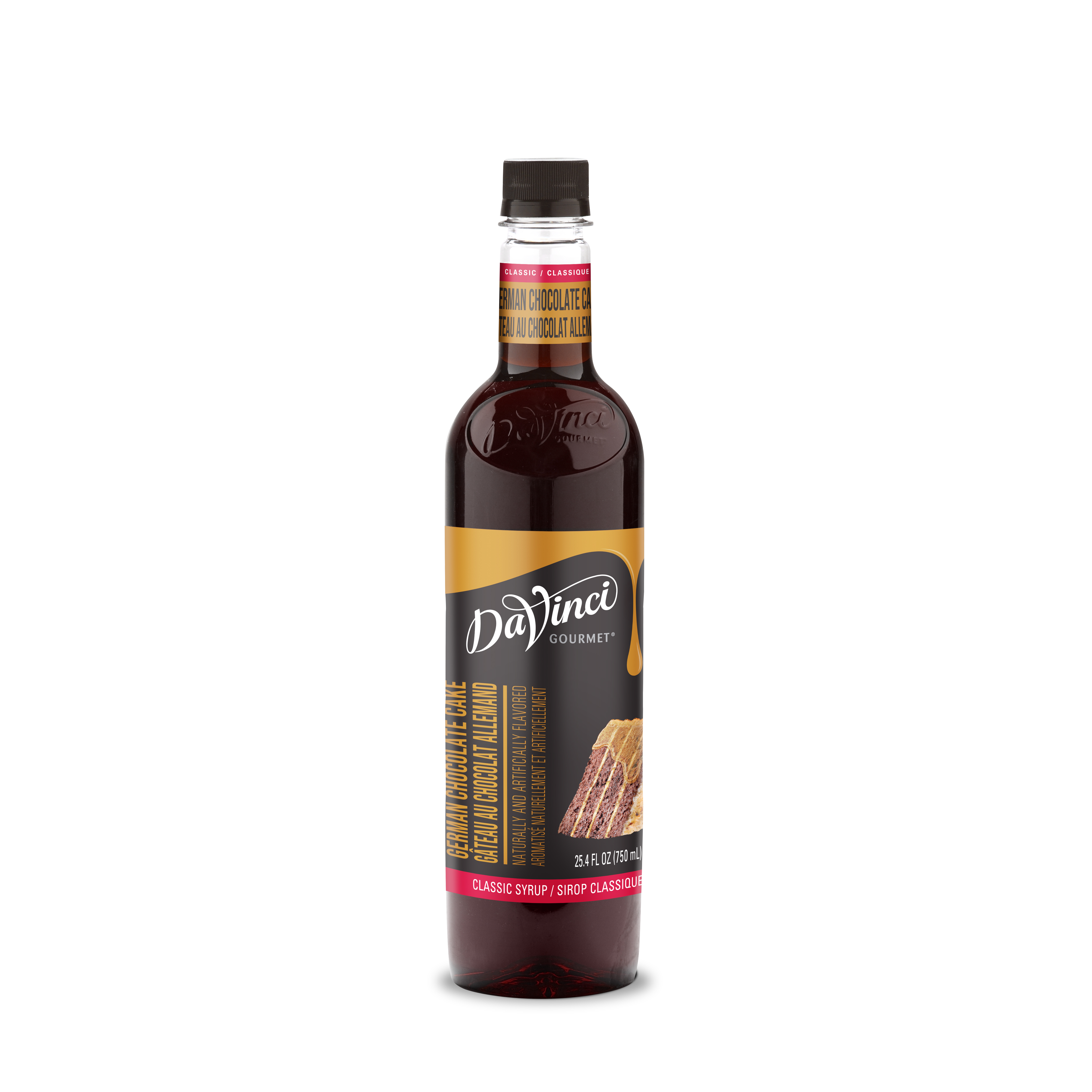 - A trio of decadent flavors - moist chocolate cake, toasted coconut and sweet caramel frosting - infuses each drop of our Classic German Chocolate Cake syrup. Taste buds will delight in the sweet taste inspired by the famous American dessert. At DaVinci Gourmet, we craft this syrup with only the finest ingredients for premium flavor. Our Classic German Chocolate Cake syrup is made with the perfect amount of pure cane sugar for balanced taste. We've specially formulated our delectable syrup to mix easily in hot or cold drinks and resist curdling when mixed with dairy products. Hot or cold, DaVinci Gourmet's Classic German Chocolate Cake syrup makes a perfect addition to a wide range of beverage and culinary applications. Combine syrups from our wide selection of Classic, Naturals and Fruit Innovations products to create unique custom flavors for all your signature drinks. Our Classic German Chocolate Cake syrup is Kosher-Pareve certified.