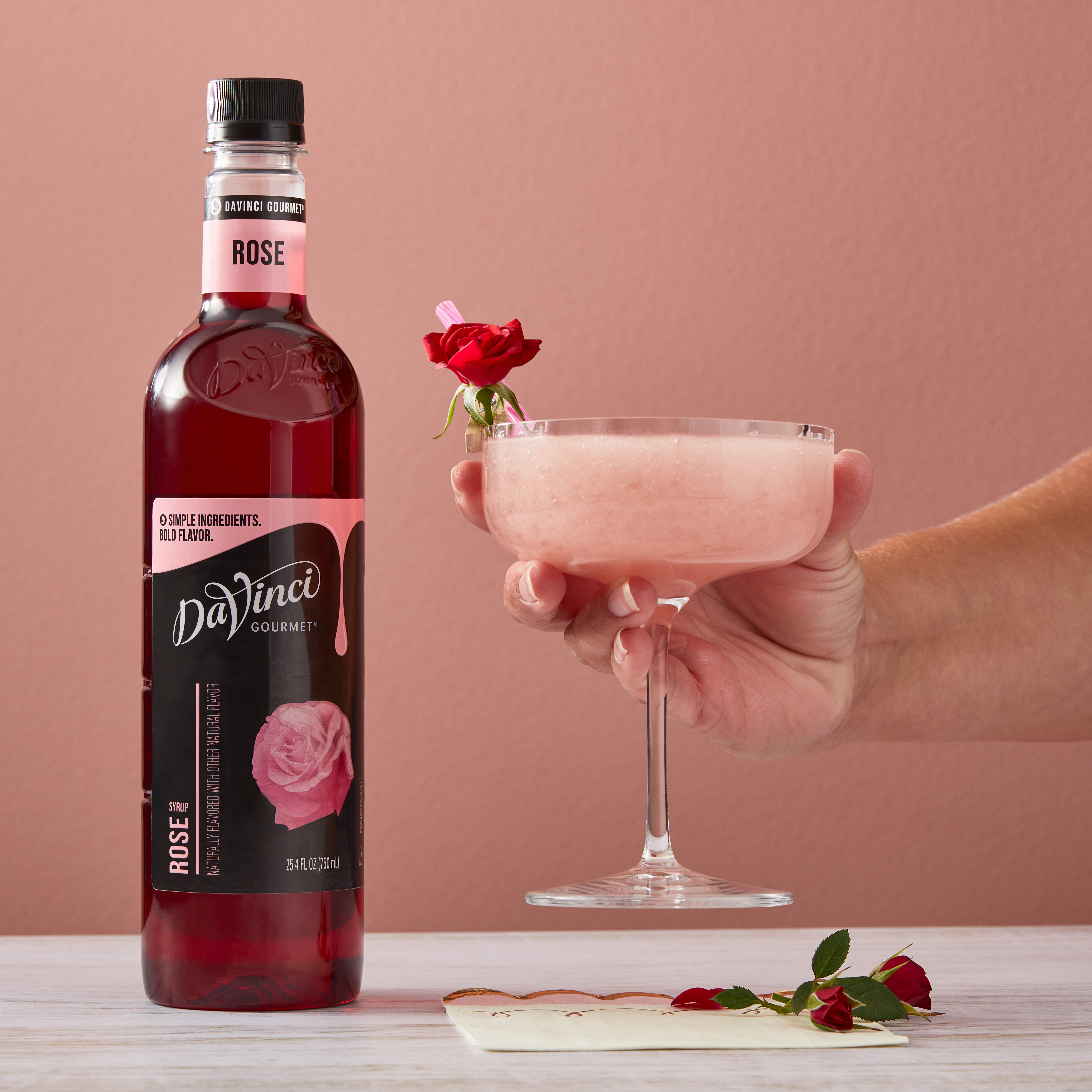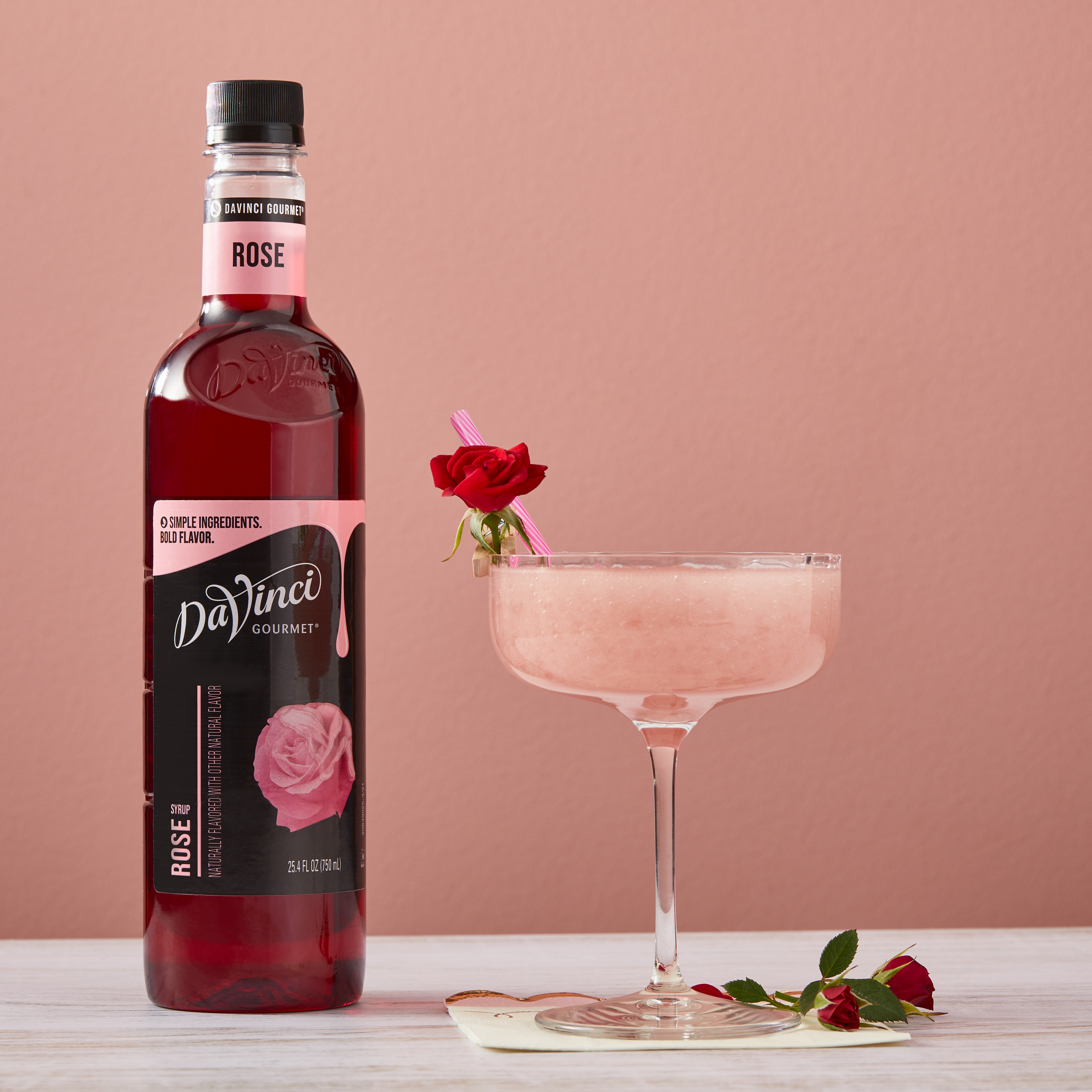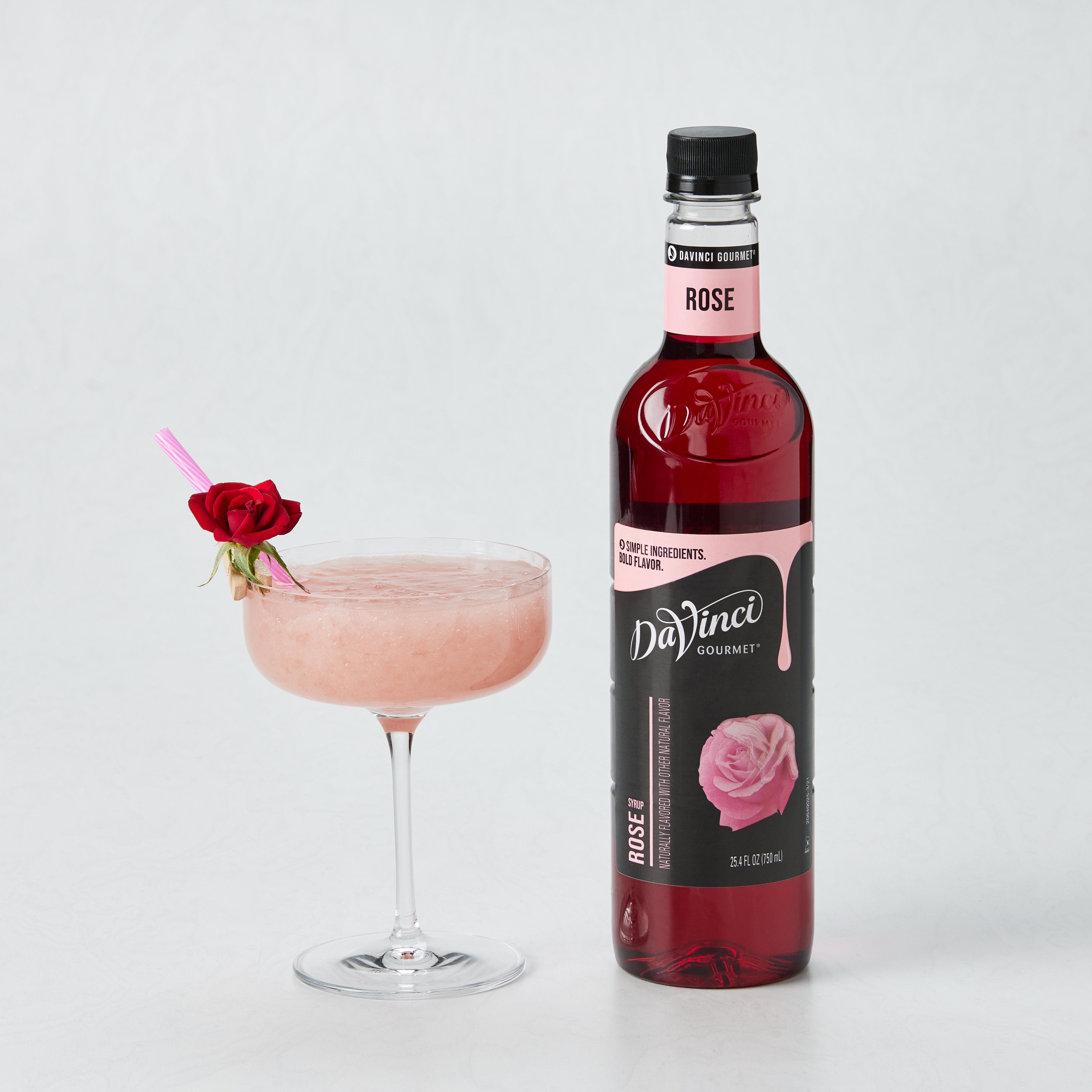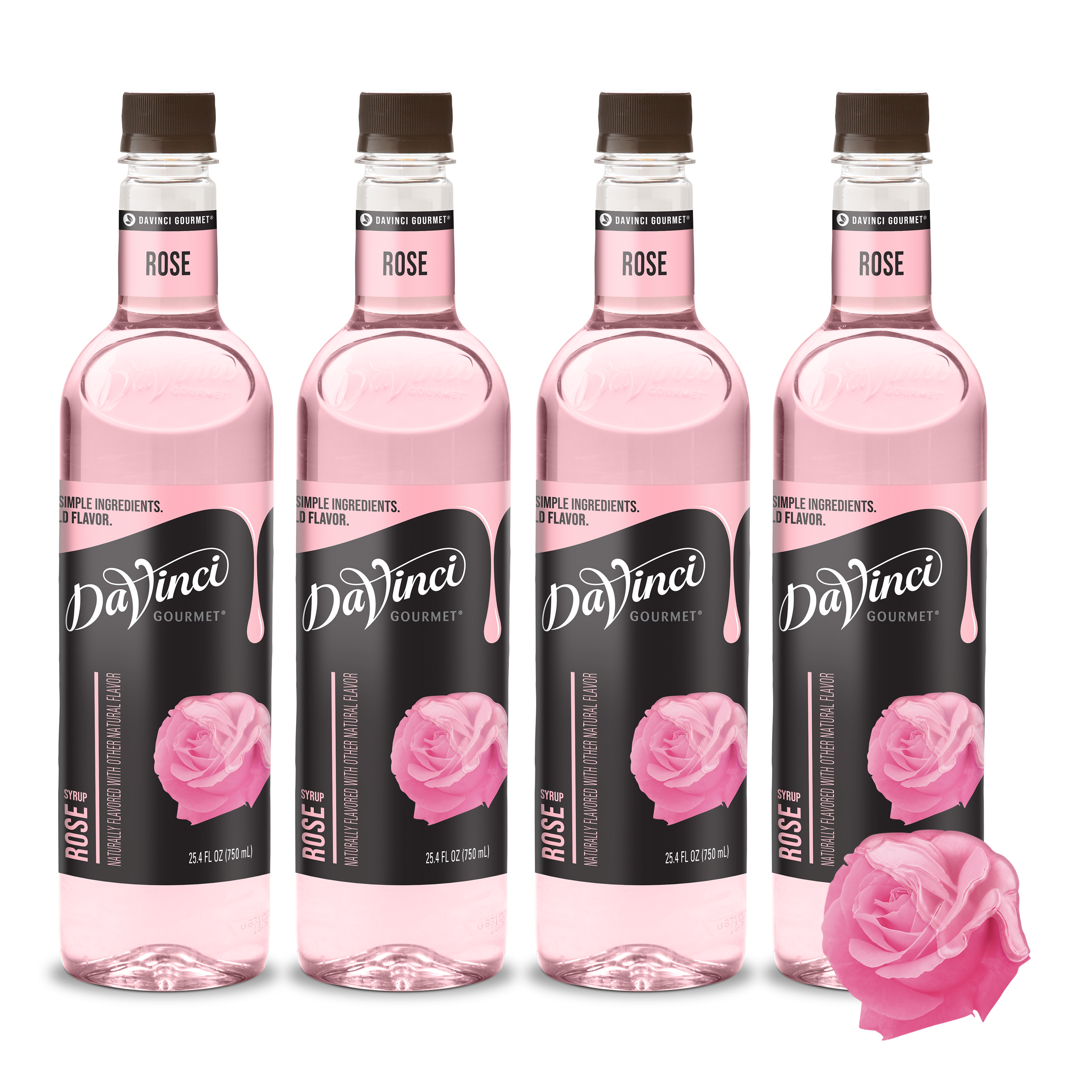 - DaVinci Gourmet Rose Syrup is crafted in small batches and delivers remarkable floral taste. Made with bright, floral flavors, rose syrup inspires crafted beverages, cocktails, culinary treats and more. DaVinci Gourmet offers a vast library of core and seasonal offerings, formulated to mix easily in a number of beverage and culinary applications. It resists curdling in dairy products, perfectly holds its flavor in hot and cold beverages and is available in 4 count 750 mL plastic bottles.