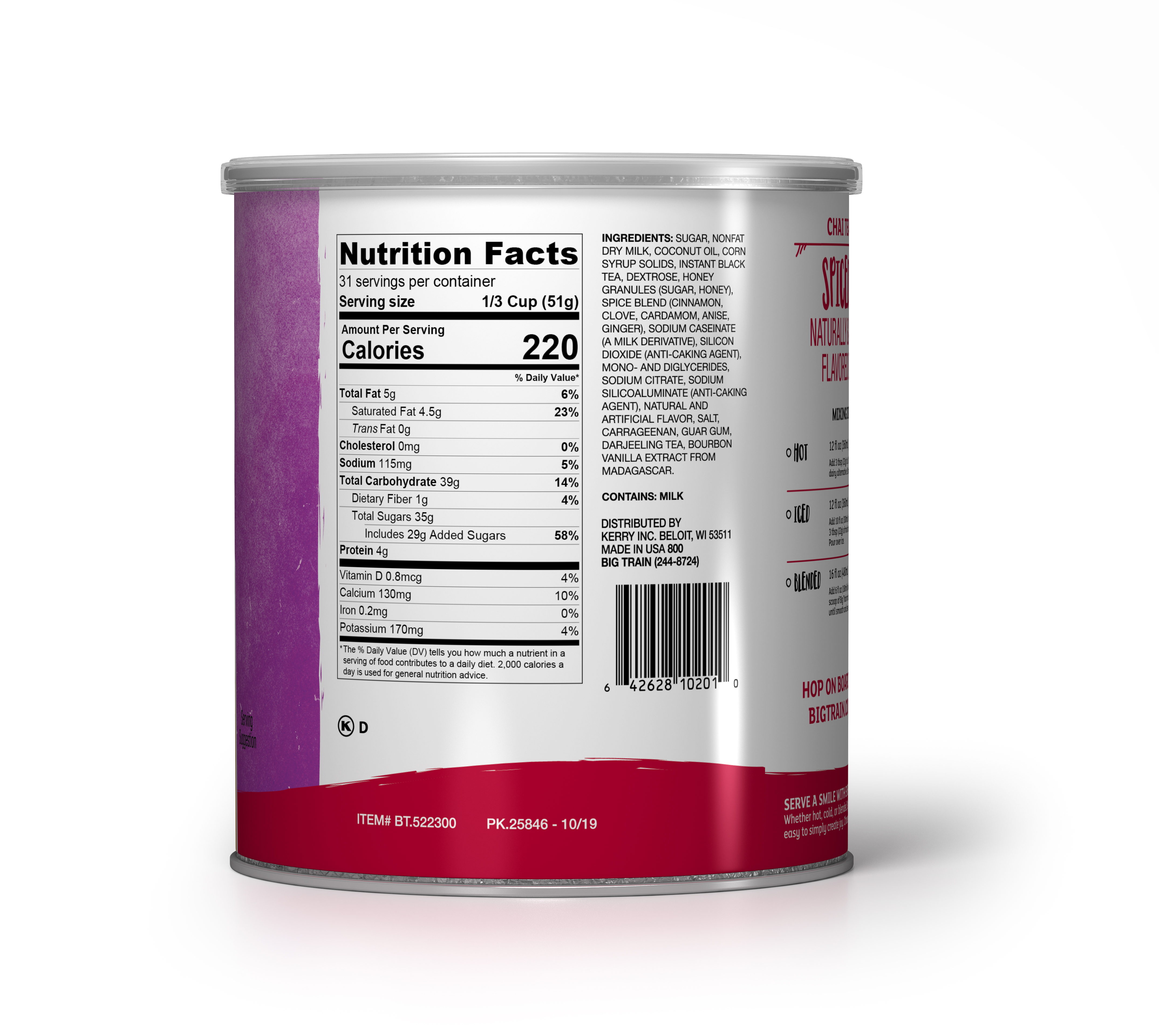 - Breathe deep, take a sip, and travel to the East in a teacup with Big Train's Spiced Chai Tea Latte Mix! We start with our invigorating black tea chai base made with Darjeeling tea and aromatic spices. Our authentic Masala spice blend includes natural cinnamon, clove, cardamom, anise and ginger for spicy-sweet flavor. Using only the finest ingredients, we sweeten our creamy, low-fat chai mix with honey and real sugar to bring out the exotic taste experience. Sweet vanilla flavor completes the melange of spices and tea for a smooth finish. Let our classic Spiced Chai Tea Latte Mix take your taste buds on an unforgettable adventure! Serve hot, iced, or blended.