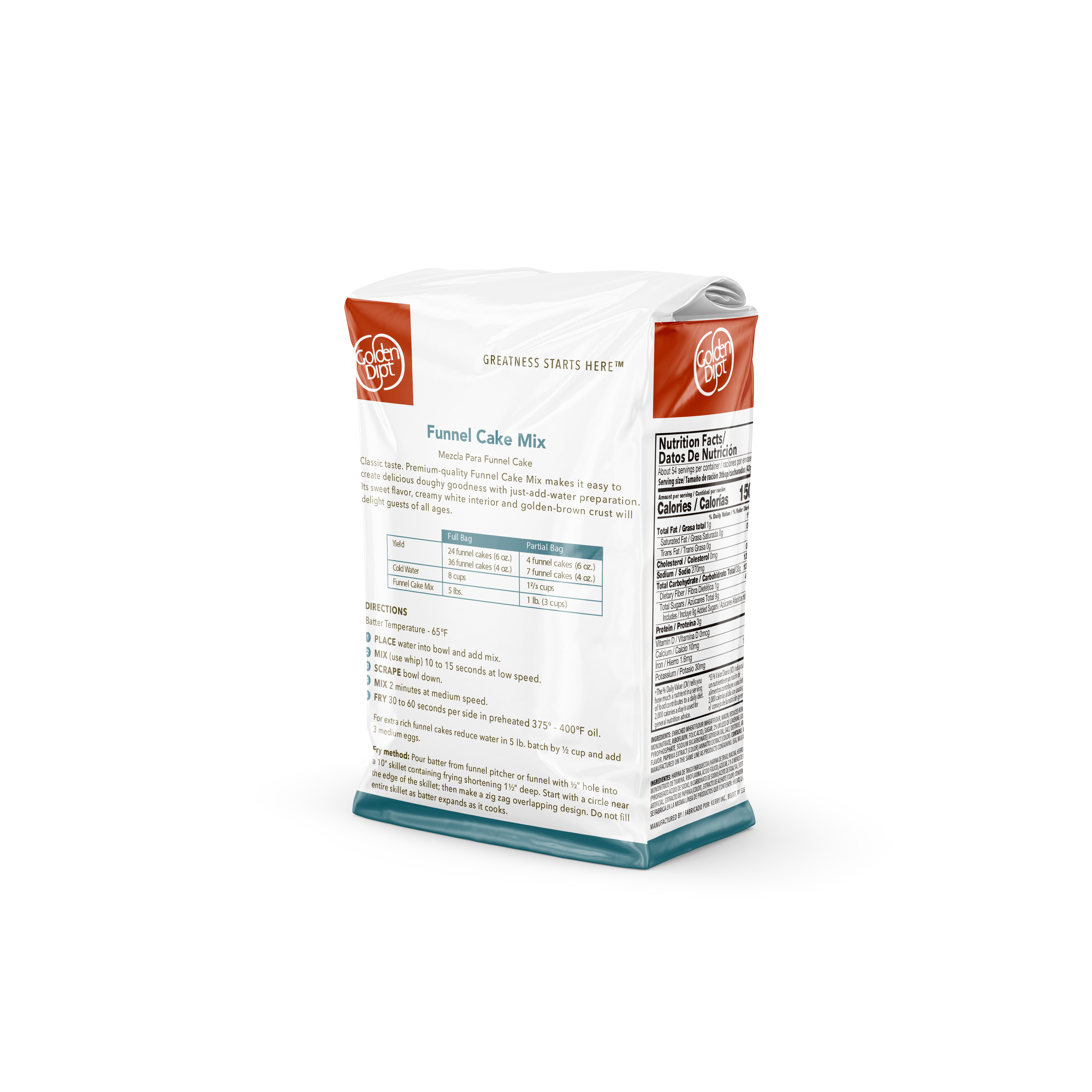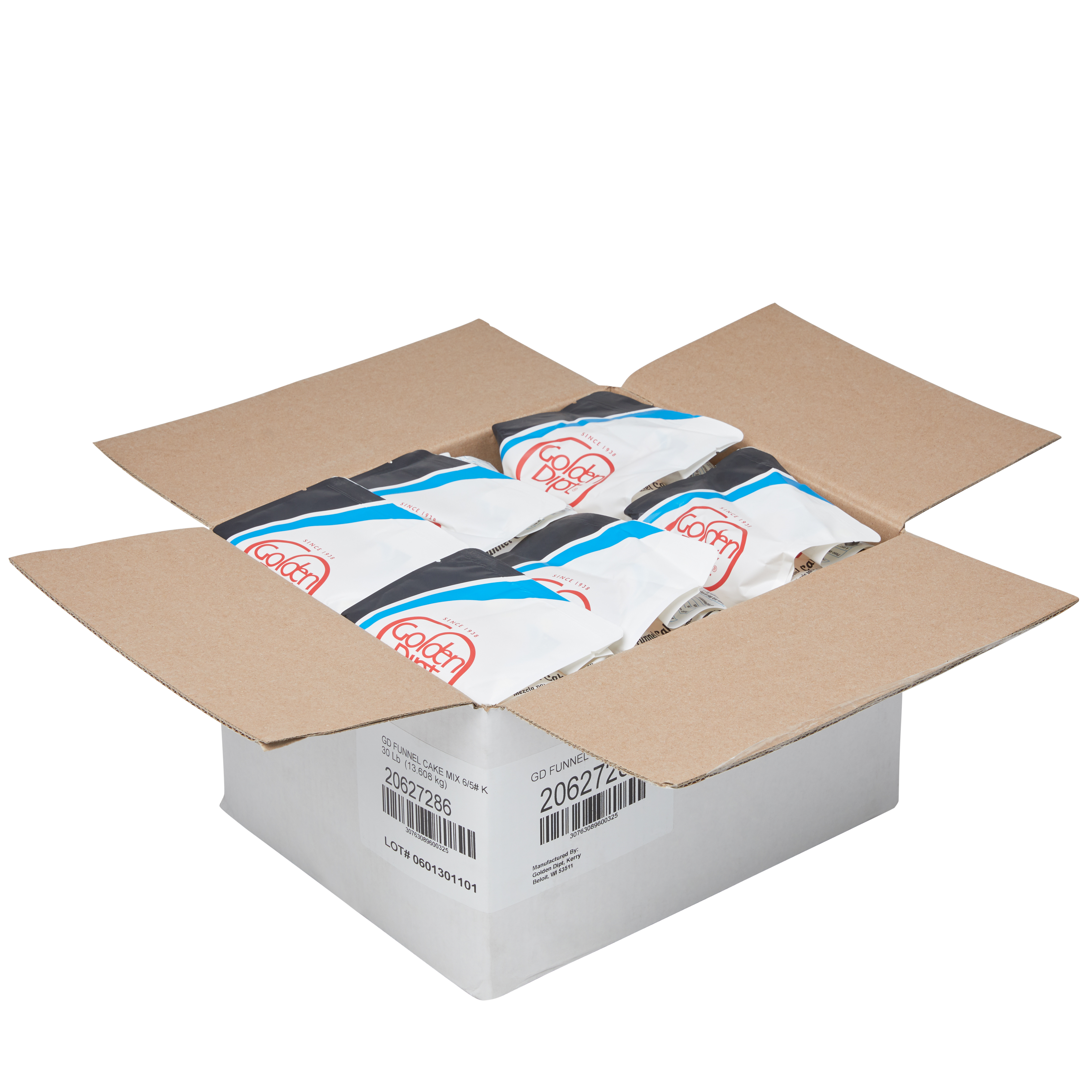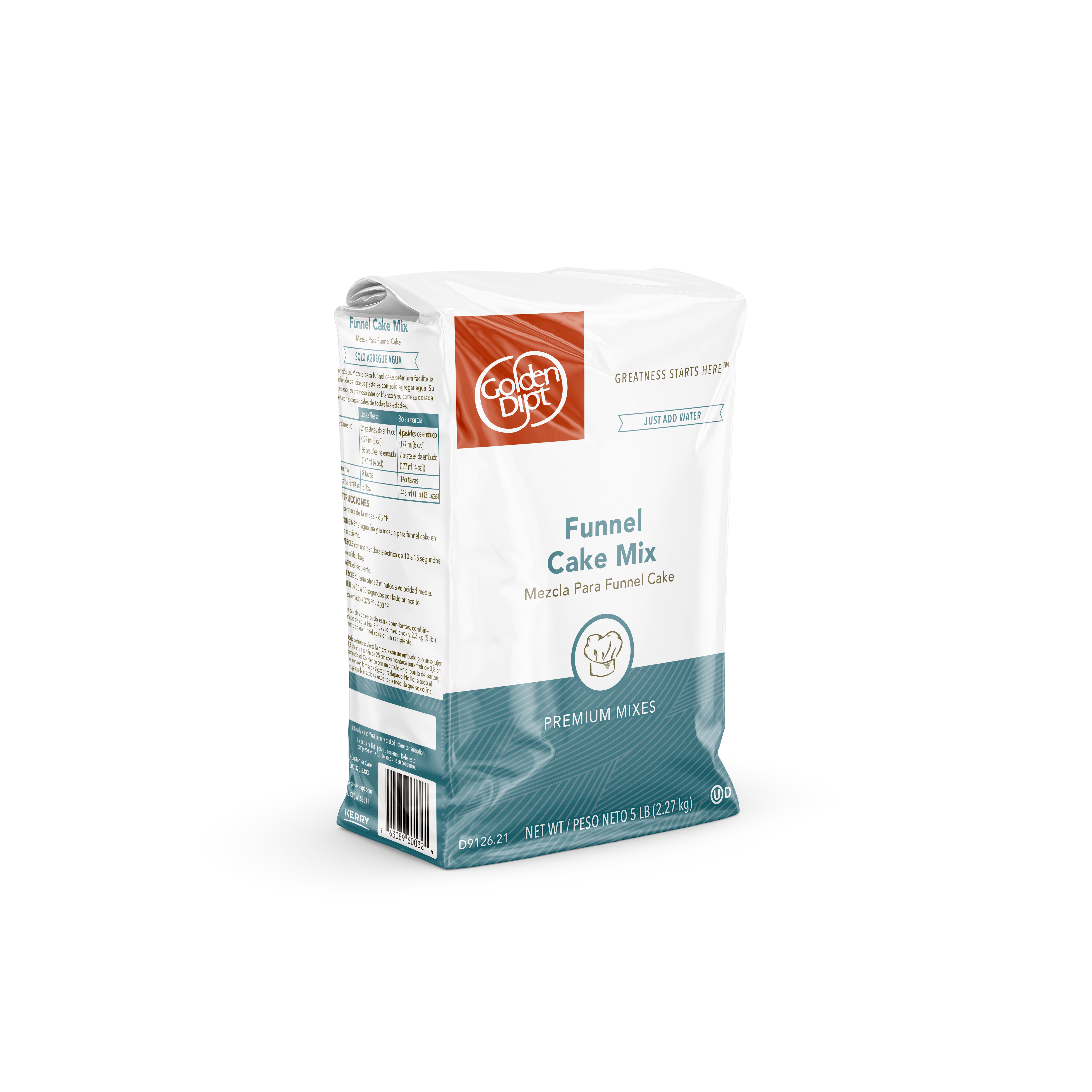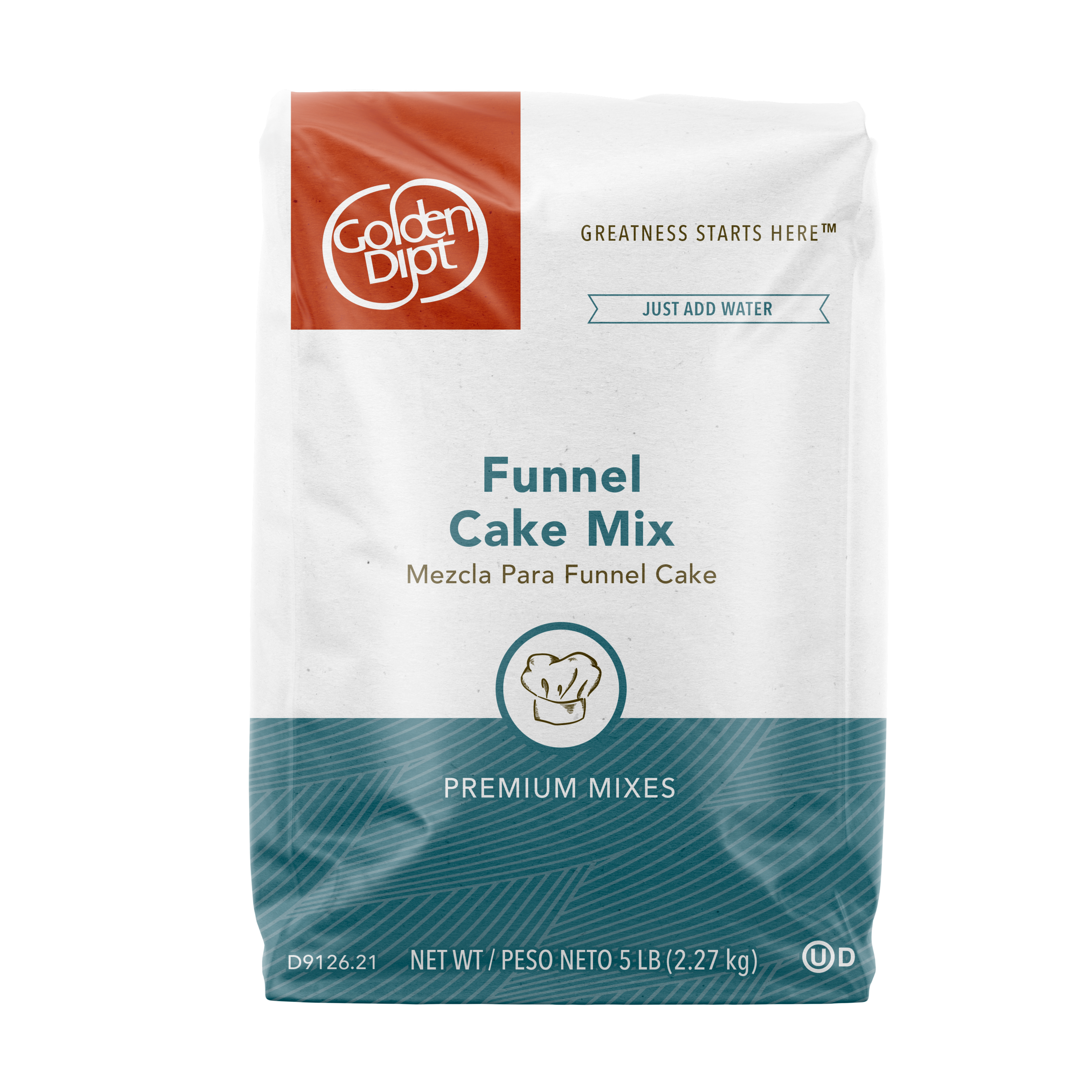 - Fry fresh funnel cakes and serve your patrons the crisp treat they crave with this easy-to-use mix! A favorite snack at carnivals and sporting events, funnel cakes will delight patrons of all ages. Add them to your restaurant menu to create delicious desserts your patrons will love. At Golden Dipt, a trusted name in foodservice for more than 75 years, we formulate all our premium products for superior flavor. Made with decades of industry know-how in mind, our products help busy operators like you make delicious scratch-quality menu items patrons will love. Our funnel cake mix contains a blend of flours and high-quality leavenings for cakes that hold together during frying. For high-volume operators, funnel cake batter holds well under refrigeration. With sweet vanilla flavor, pale white interior and light brown crust, funnel cakes made from our mix are sure to delight. With our high-quality mix, you can create these sweet traditional treats with ease. Simply add water, fry and serve. Sprinkle with powdered sugar or add fruit toppings to create custom menu offerings. Our premium Funnel Cake Mix is Kosher-Dairy certified. This Funnel Cake Mix comes in 5 lb. bags, 6 per case, and makes 210 funnel cakes.