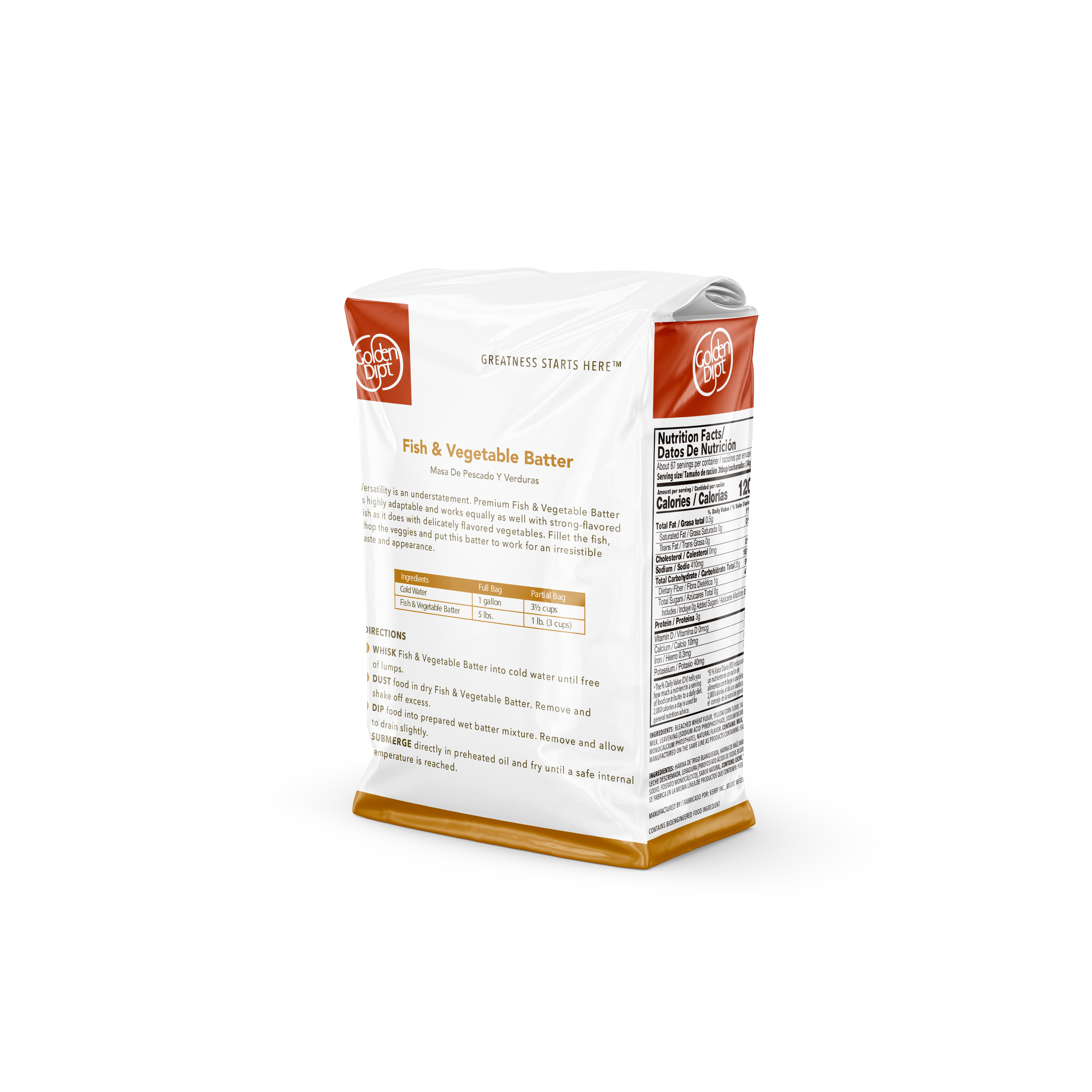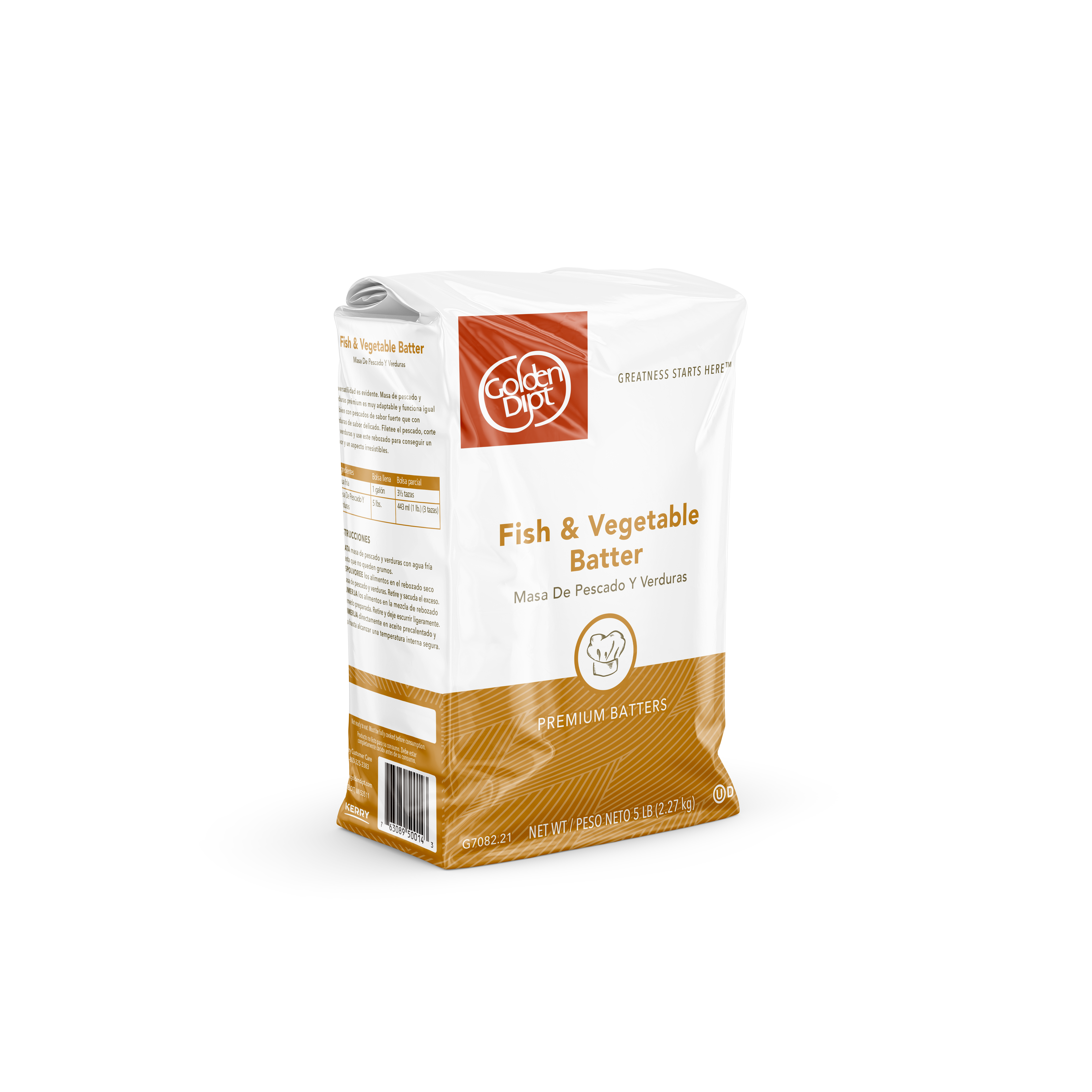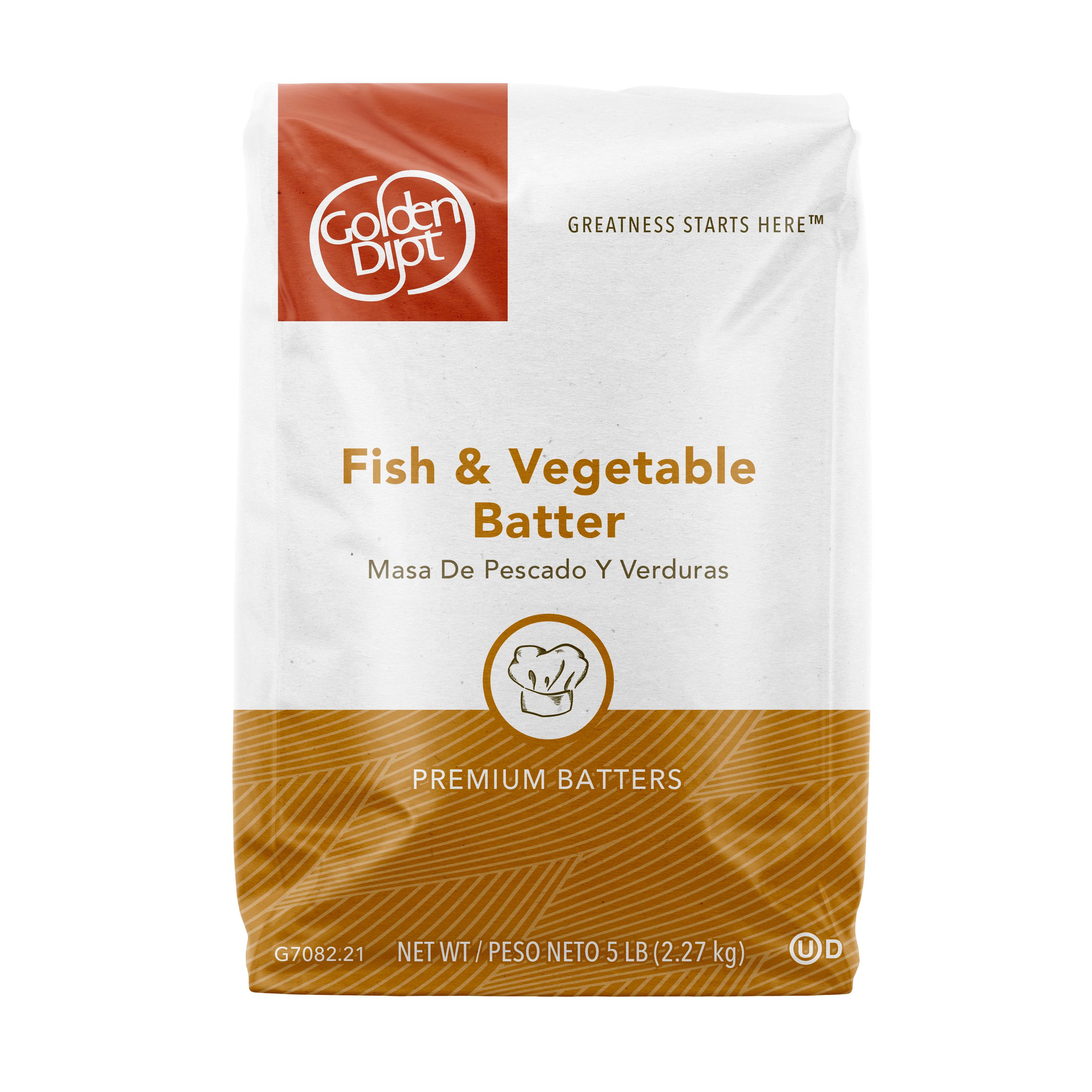 - Make perfectly fried fish, seafood, veggies – just about anything! – the easy way with this versatile Fish & Vegetable Batter Mix from Golden Dipt. At Golden Dipt, we create scratch-quality products that perform better than homemade. We specially formulated this batter to help fish and vegetables retain freshness under heat lamps for longer, so food won’t turn soggy in your busy kitchen. This convenient just-add-water batter coating for fish and vegetables fries to a light golden brown color with a crisp crust. The light color of this high-tolerance batter makes it an ideal choice for larger pieces that need more time in the fryer. It is excellent for delicate fish and vegetables, delivering flavor that enhances and won’t overpower food. Just add liquid of your choice , dip and fry to serve up crispy fish and veggies your patrons will love. Our Fish and Vegetable Batter Mix is Kosher-Dairy certified. Contains milk and wheat. This Fish and Vegetable Batter Mix comes in economical 5 lb. bags, 6 per case to coat 210 lbs.
