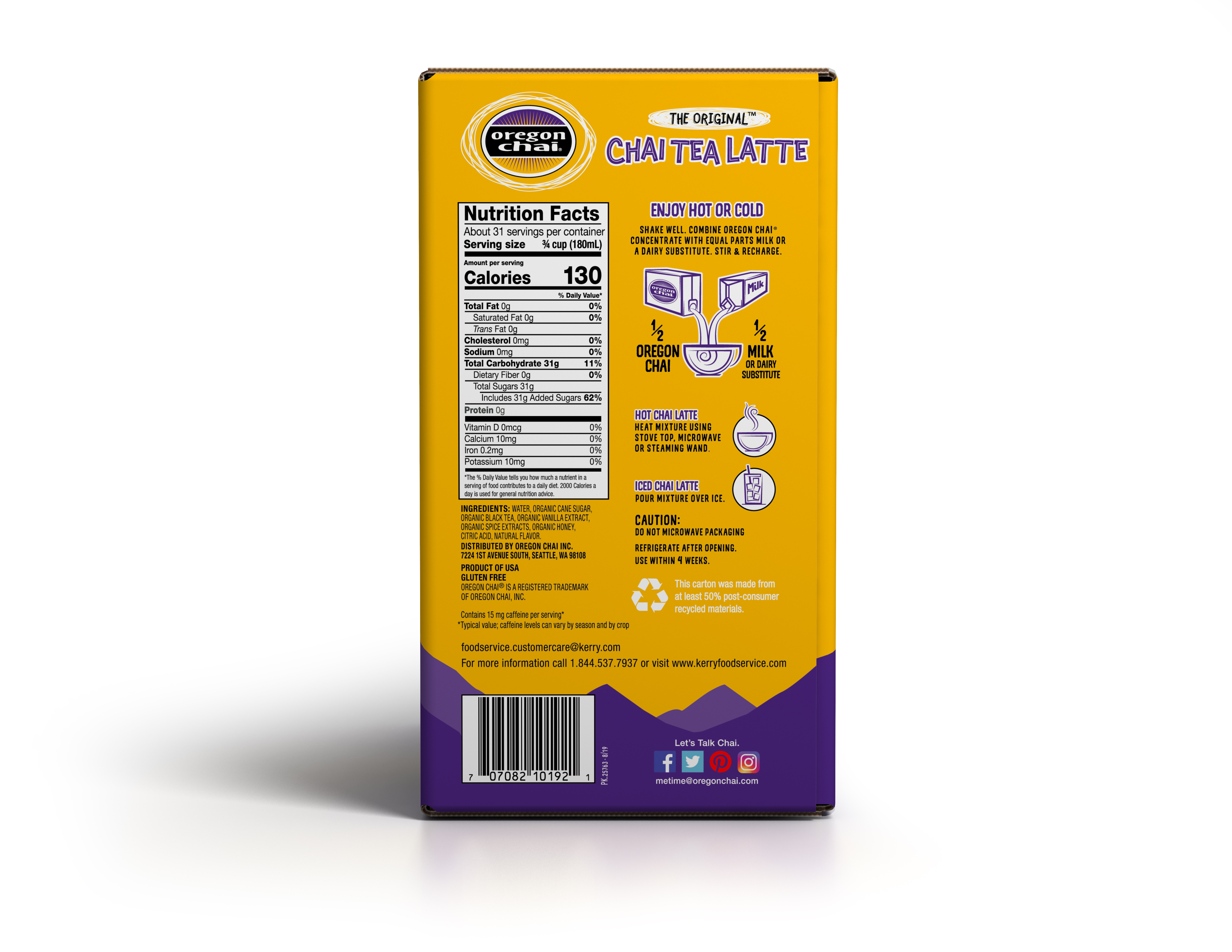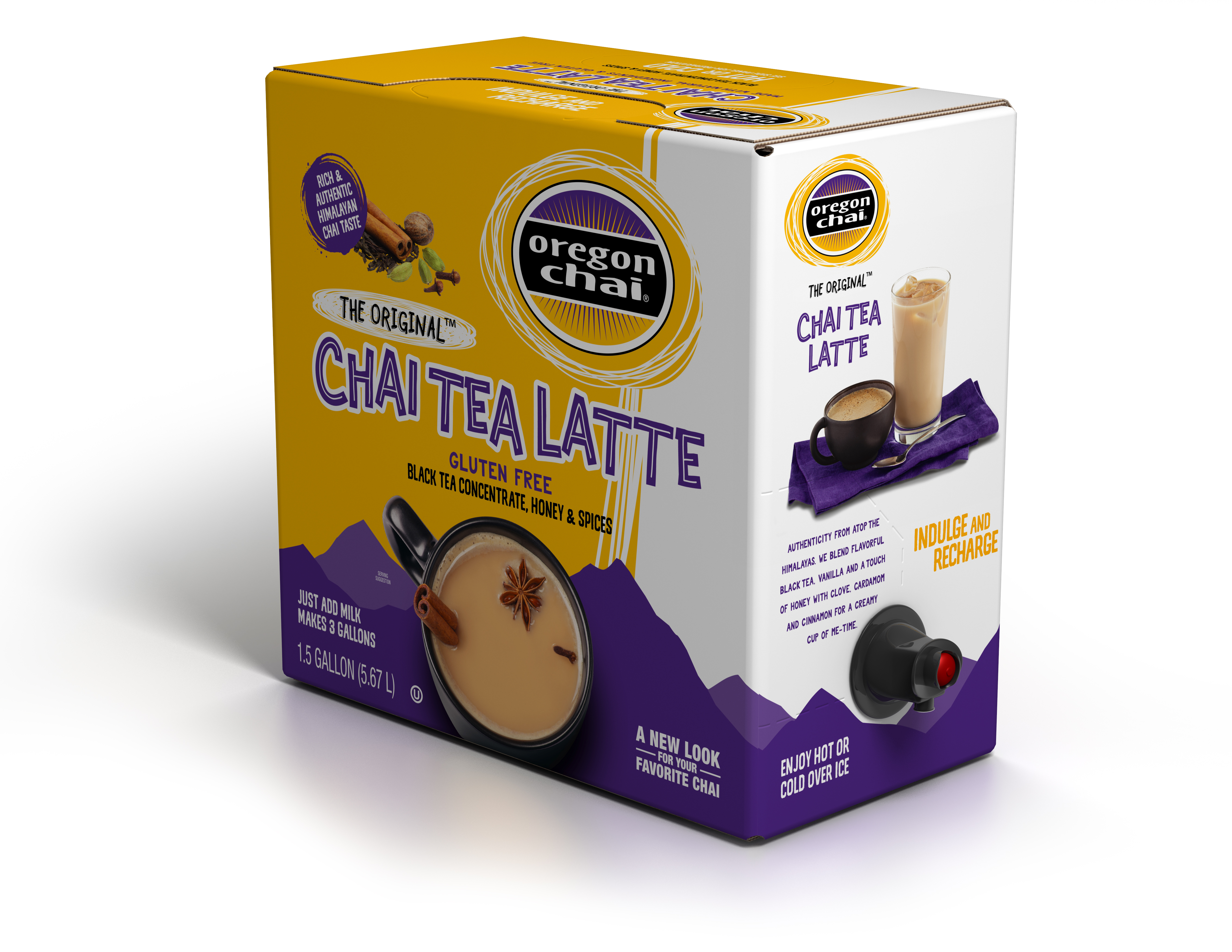 - Easily make larger quantities of chai with The Original Chai Tea Latte bag-in-box packaging, perfect for higher-volume needs. True to its name, The Original™ Chai Tea Latte is, well, the original that started a coffeehouse trend. Inspired by our founder’s trip to the Himalayas, this flavorful blend combines the chai spices of its Eastern heritage with a Western twist. Our sweet and mildly spiced signature flavor features a blend of black tea, honey, smooth vanilla and chai spices in every delicious sip. The convenient bag-in-box design features an easy-pour spigot. To make a delicious chai latte, just mix equal parts concentrate and milk or soy. Heat it up or pour it over ice for a rich, sweet, creamy blend of black tea, honey, vanilla and spices that you’ll enjoy thoroughly. Yes, it’s that easy! More than twenty years after our company’s founding, Oregon Chai products remain true to our principles. We strive to bring incredible flavor to the world, cup after cup, with minimal environmental impact from our products. We make this one with natural ingredients. This Original Chai Tea Latte product is available in an easy-to-pour 1.5 gallon bag-in-box package. Refrigerate after opening.