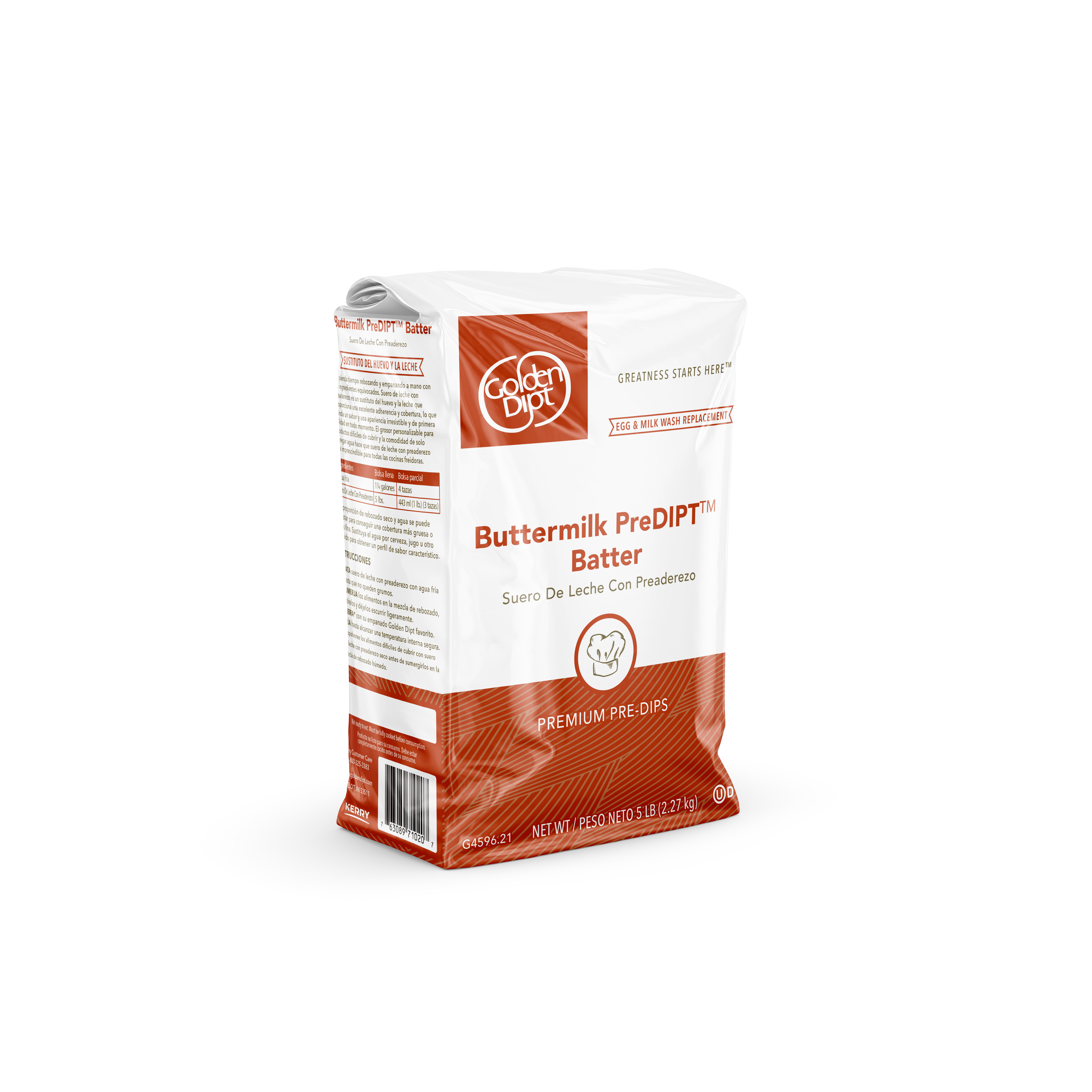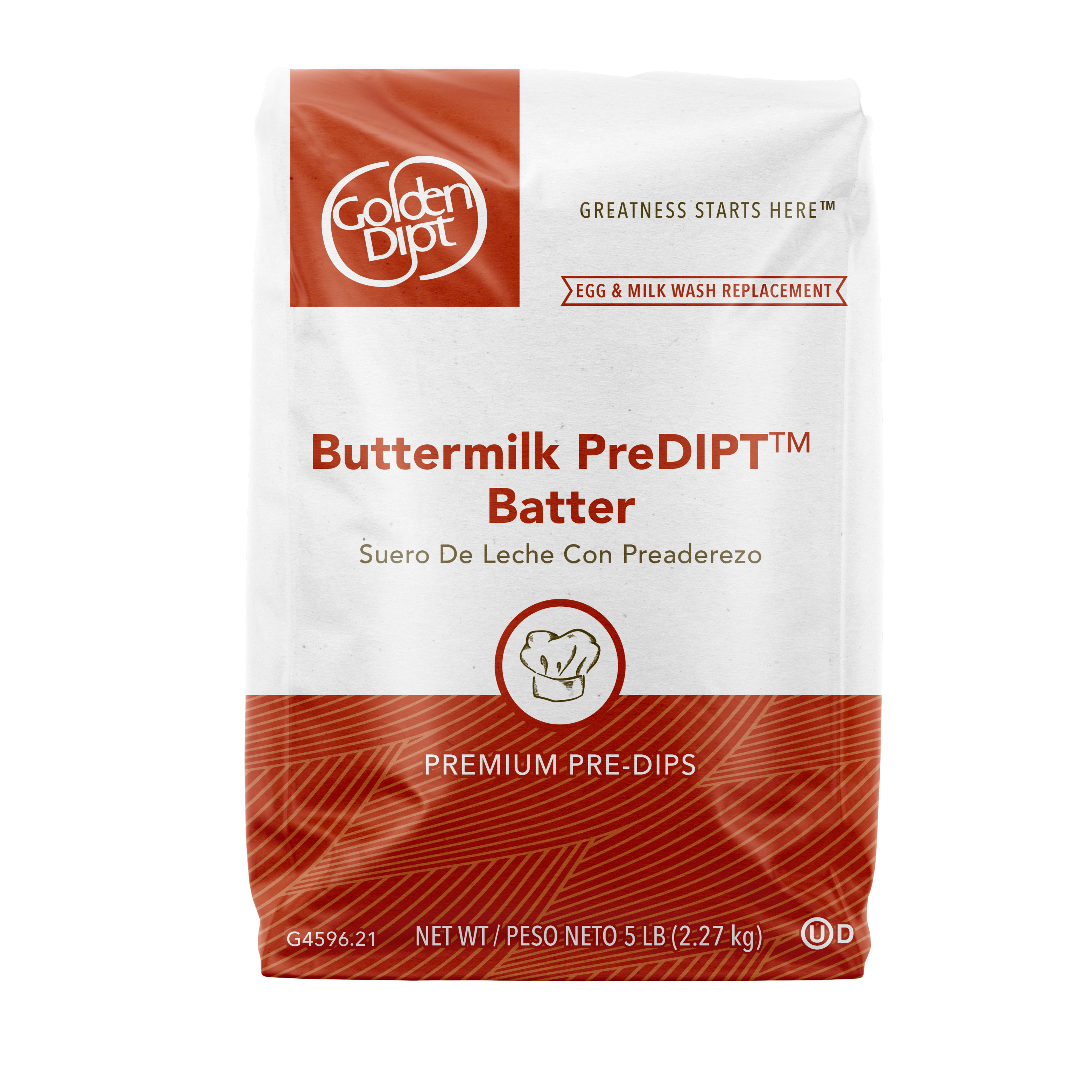 - Save money and enjoy the benefits of our original pre-dip with the addition of flavorful buttermilk. Like our original pre-dip, Buttermilk Pre-Dip from Golden Dipt delivers uniform coverage to those hard-to-coat fried foods. Even panko and coarse coatings will stick with ease. At Golden Dipt, we develop products for busy operators that make scratch-quality foods easier to prepare. Better than homemade, our pre-dip is designed to retain moisture, reducing shrinkage in the fryer for improved plate coverage. Using our pre-dip helps breading uniformly coat foods for better presentation without splits, cracks and fall-off. Best of all, our pre-dip increases your savings over egg wash by 40% or more. One case of shelf-stable Golden Dipt Buttermilk Pre-Dip equals 14 gallons of milk and 21 dozen eggs, saving valuable fridge space and reducing spoilage. With no raw eggs, this pre-dip will keep your kitchen free of cross-contamination from the breading process. Lightly seasoned, our Buttermilk Pre-Dip enhances flavor without overpowering foods and other coatings. Adjust the batter thickness for a custom for all your hard-to-coat our foods. Just add water to reach the desired thickness, coat and fry to perfection. Try as a buttermilk replacement in your chicken fried steak recipe. Our Buttermilk Pre-Dip Batter Mix is Kosher-Dairy certified. Contains egg, milk and wheat. This Buttermilk Pre-Dip Batter Mix is available in economical 50 lb. bags or bag in box to coat 1000 lbs. or 5 lb. bags, 6 per case to coat 600 lbs.