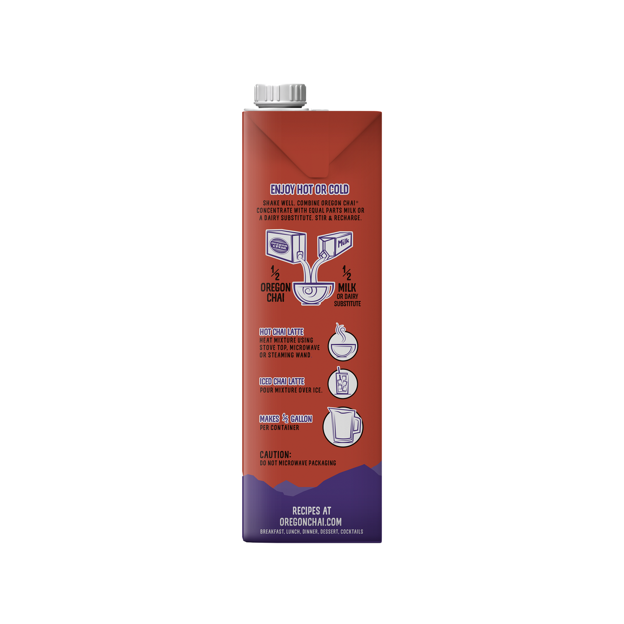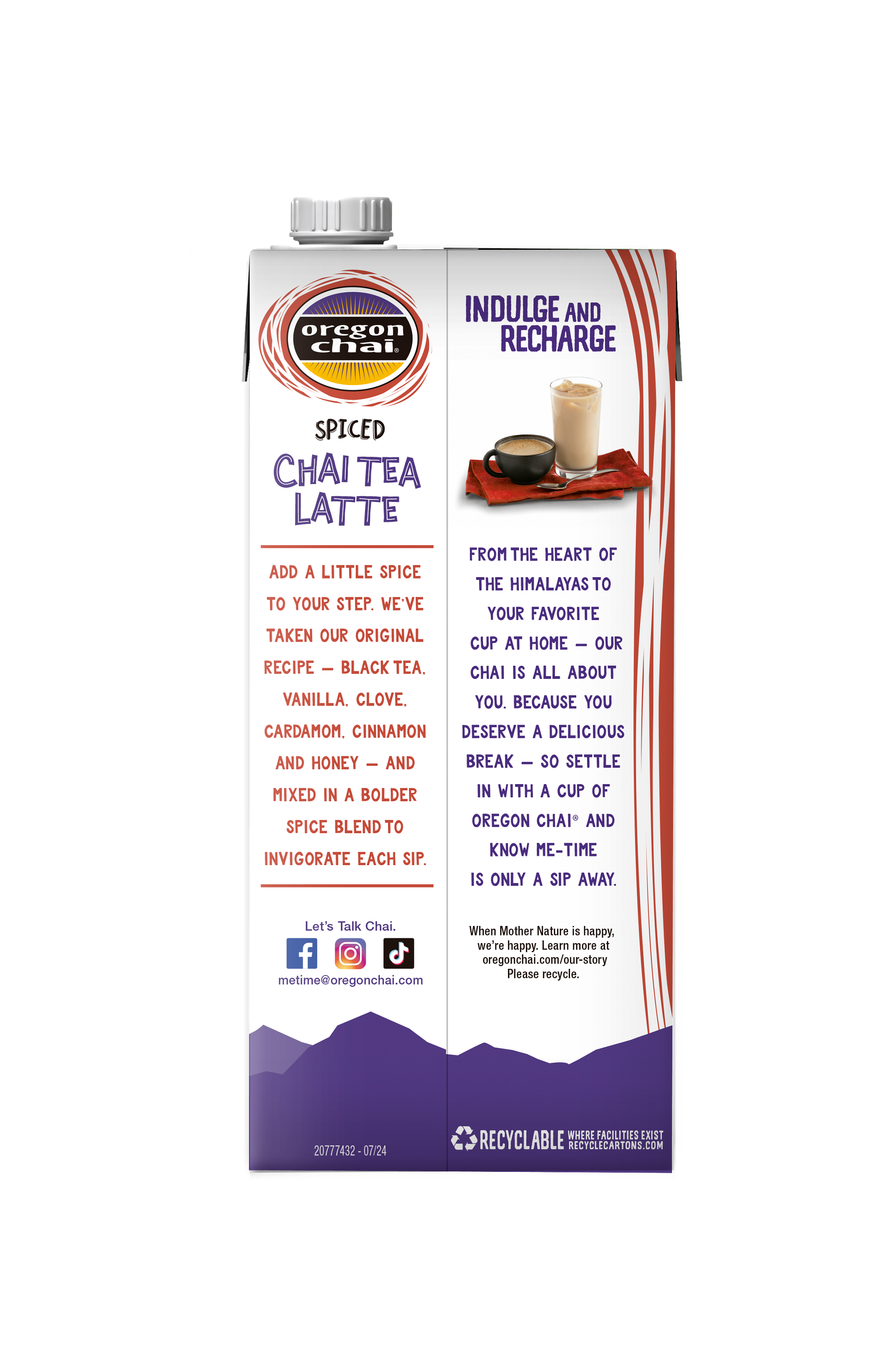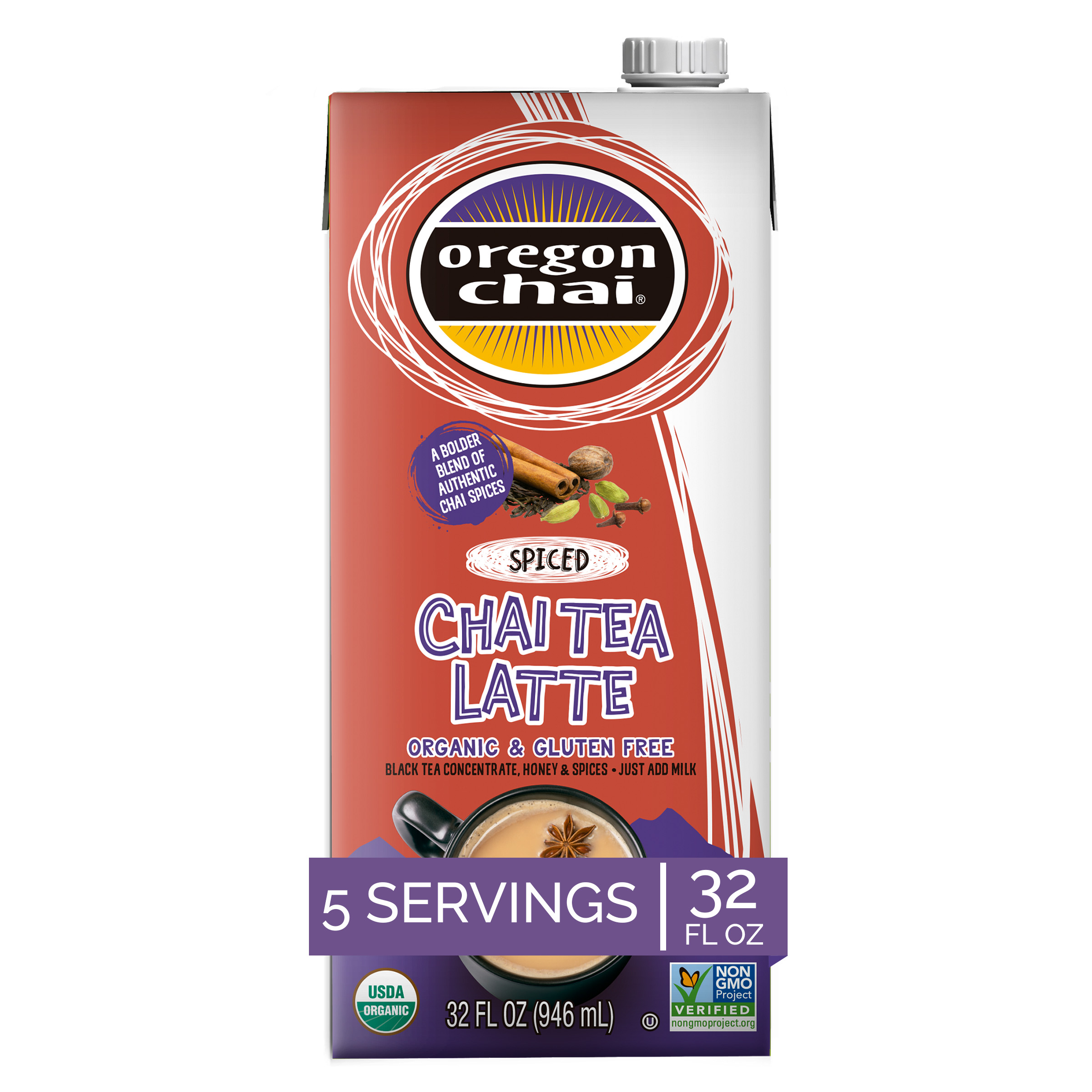 - From the heart of the Himalayas to your favorite cup at home, our chai is all about you. Because you deserve a delicious break - so settle in with a cup of Oregon Chai Spiced Chai Tea Latte. Add a little spice to your step with our spicy take on original chai. We've taken our original chai tea recipe - black tea, vanilla, clove, cardamom, cinnamon and honey - and mixed in a bolder spice blend to invigorate each sip. To make an extra spiced chai tea latte, just mix equal parts concentrate and milk or dairy substitute. Heat it up or pour it over ice for a rich and spicy chai tea latte that you'll enjoy.