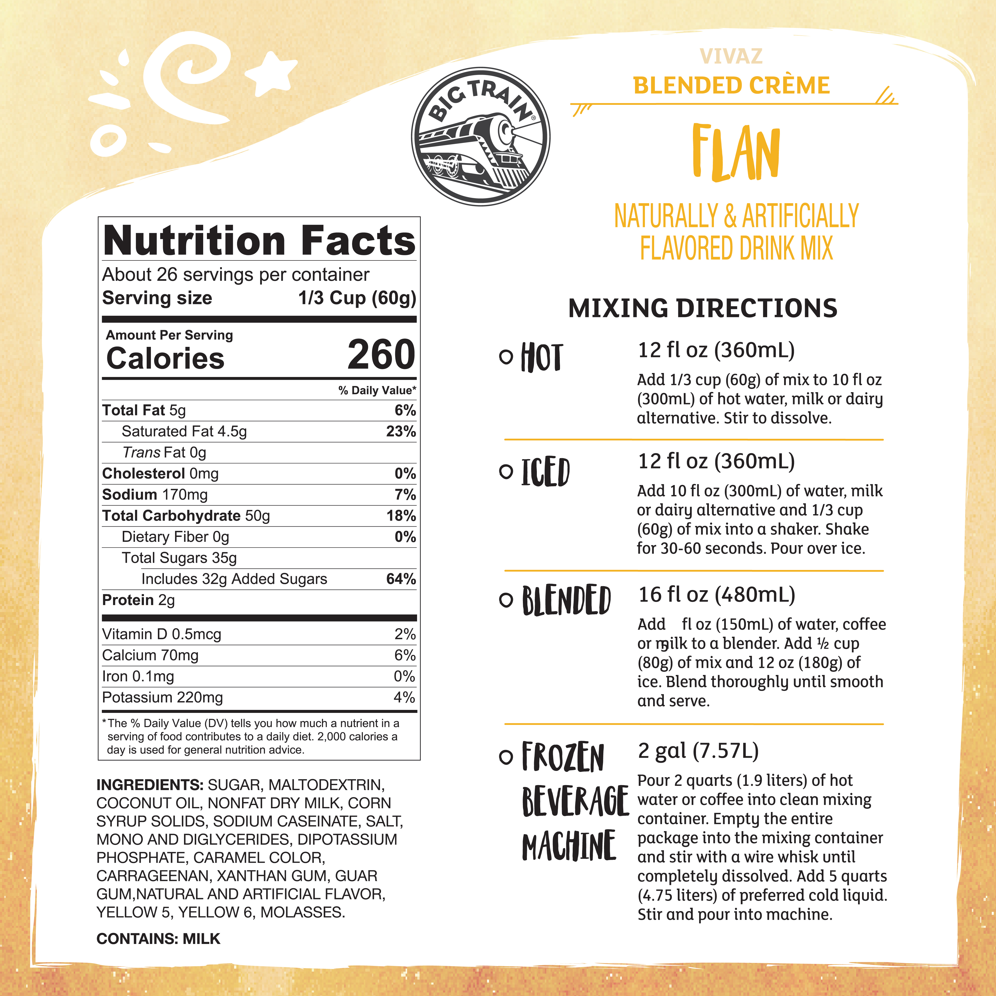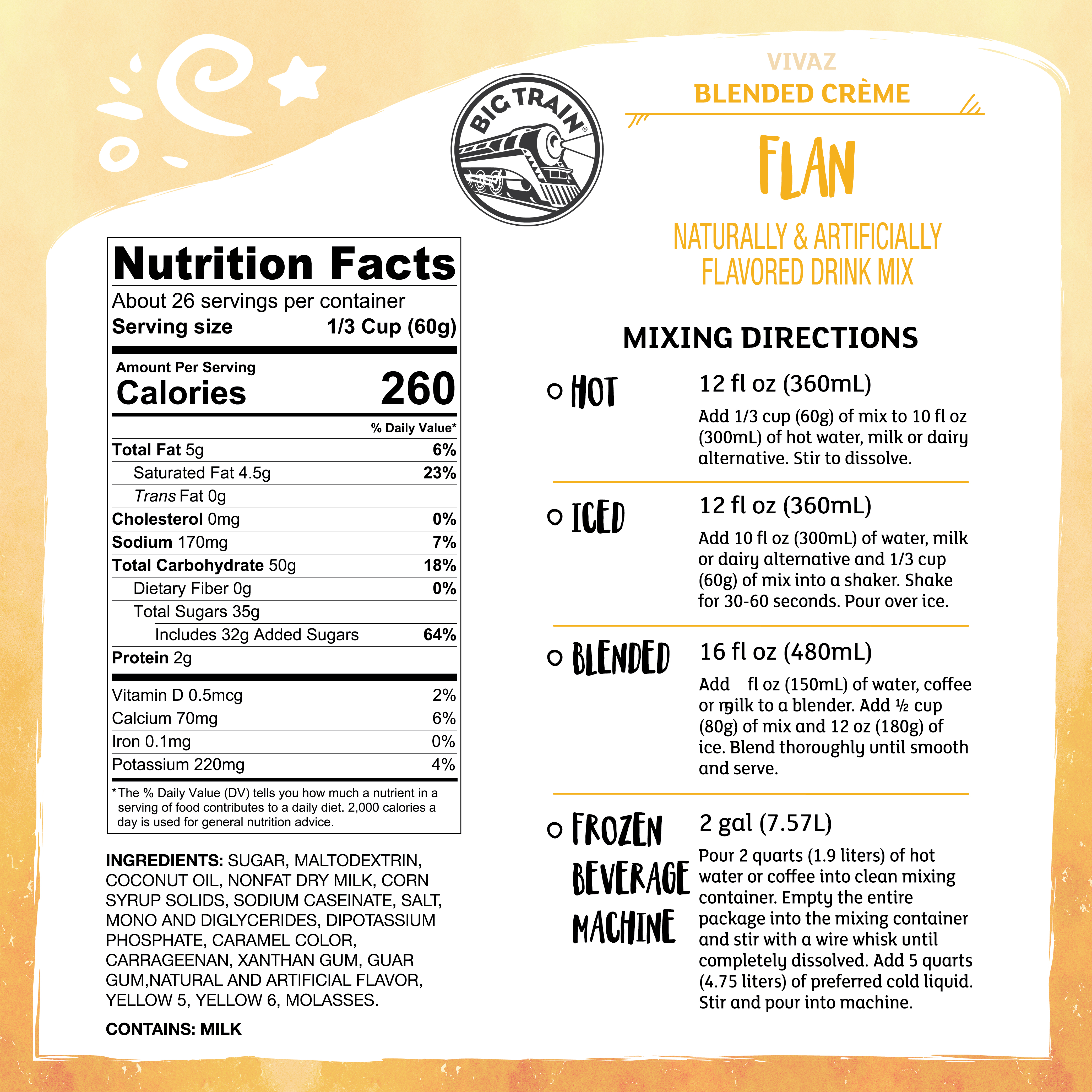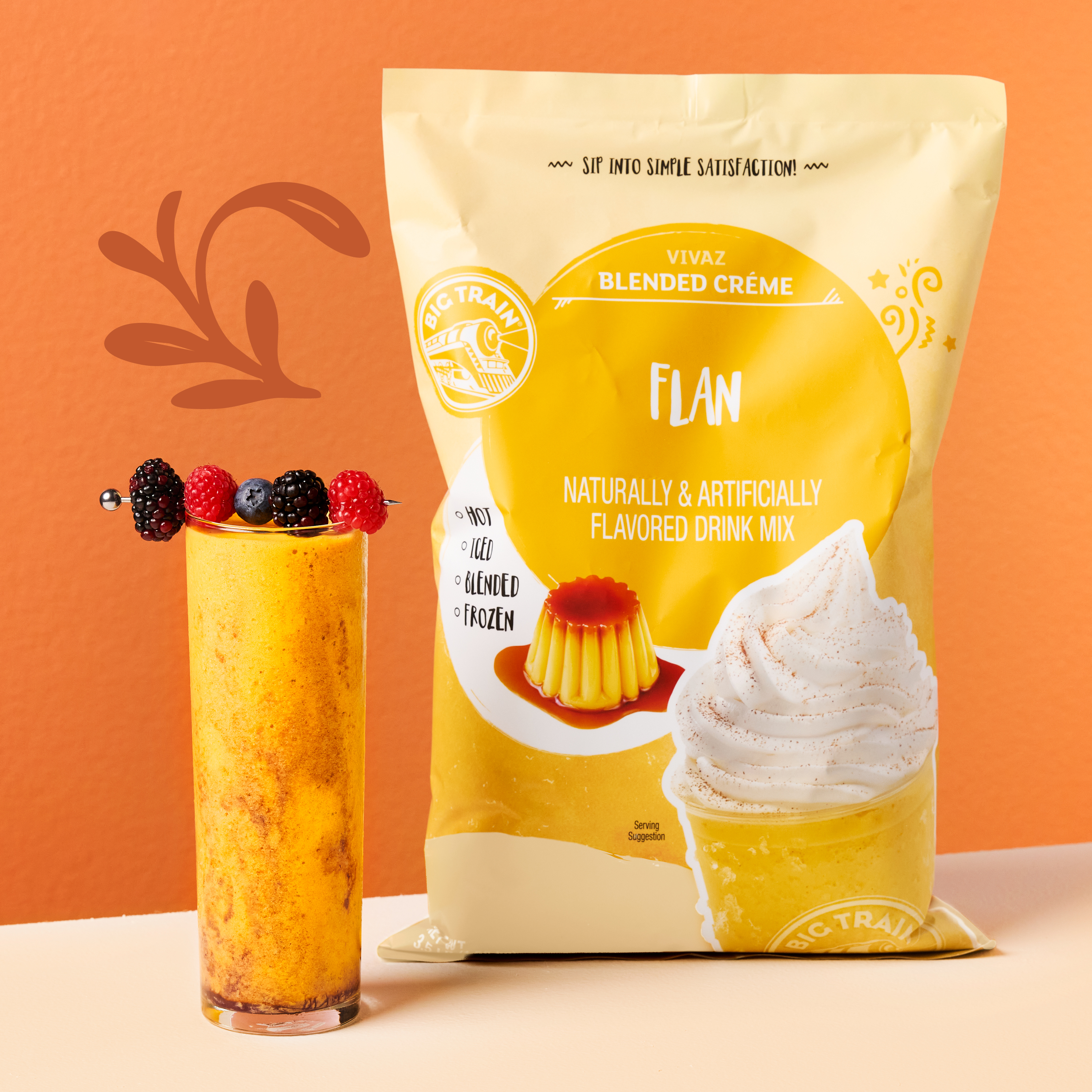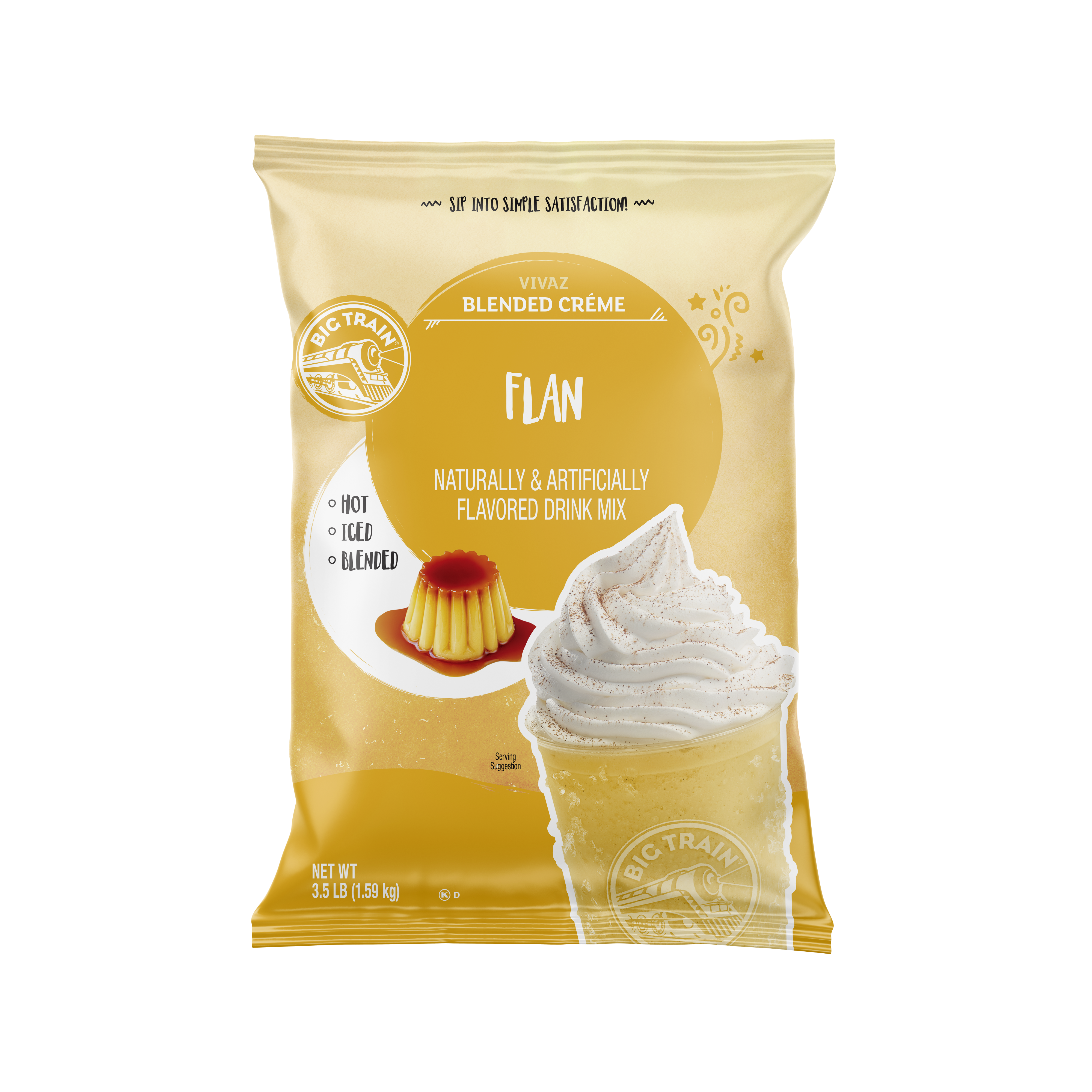- Big Train Vivaz Flan Blended Crème Frappe Mix transforms the iconic Latin dessert into a smooth, creamy beverage experience. With rich caramel notes and a velvety texture, this mix is perfect for creating indulgent drinks that delight. Just add water—no barista skills required—and serve hot, iced or blended. Loved by over 70% of consumers, flan flavor offers broad appeal and high-margin potential. Use it in recipes like wildberry flan frappes or hot cherry flan lattes to add visual flair and flavor innovation. Big Train’s easy-to-use mixes ensure consistent results and premium taste in every cup. Premium, on-trend drinks just got so much easier with Big Train Vivaz Flan Blended Crème Frappe Mix.