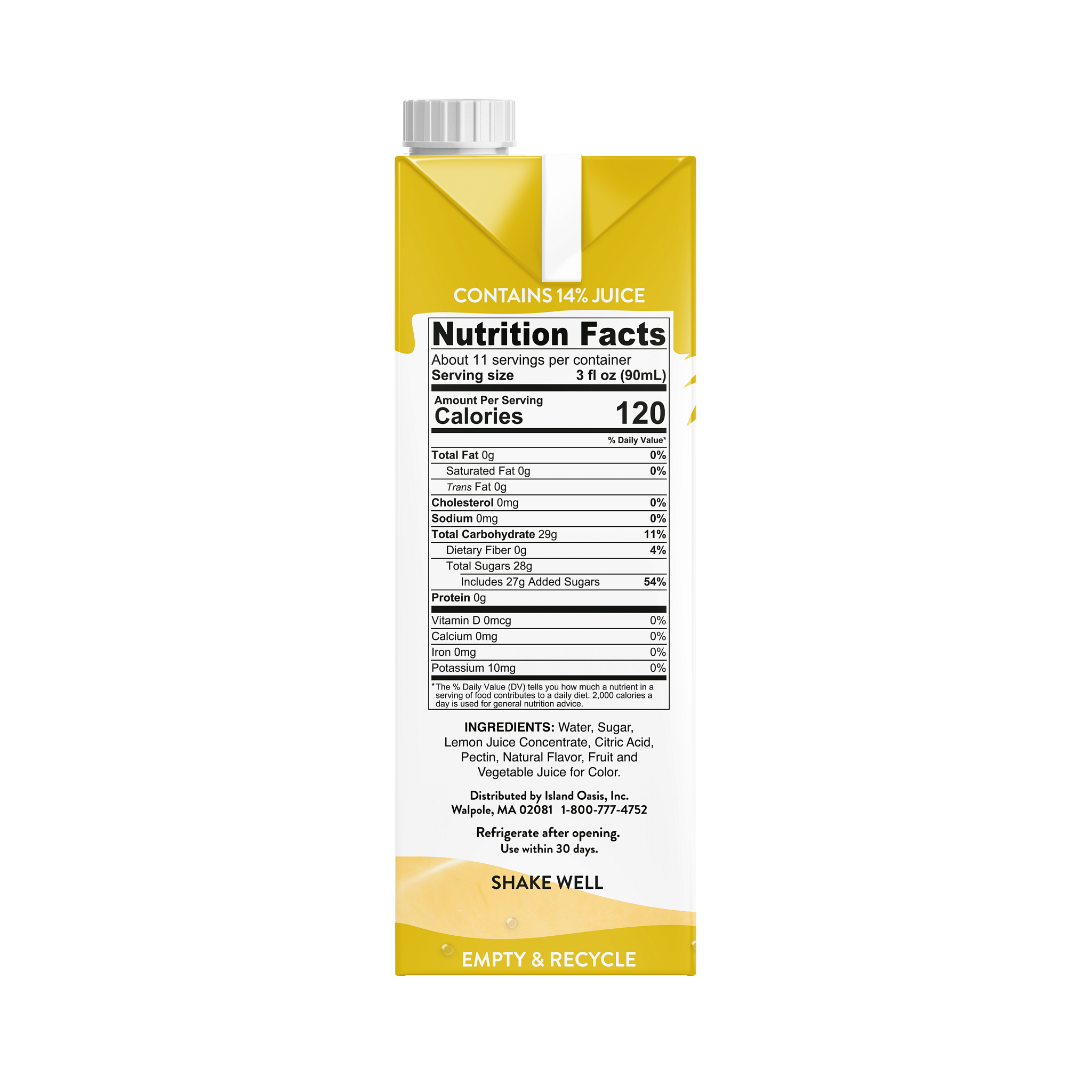 Island Oasis Shelf-Stable Lemonade Beverage Mix delivers the sweet and tart delight of fresh lemons, packaged in a convenient shelf-stable container to bring the flavor of real lemonade from farm to table. Mix with water or ice to create premium lemonades or smoothies. Versatile enough to use in cocktails, mocktails, iced teas and more.