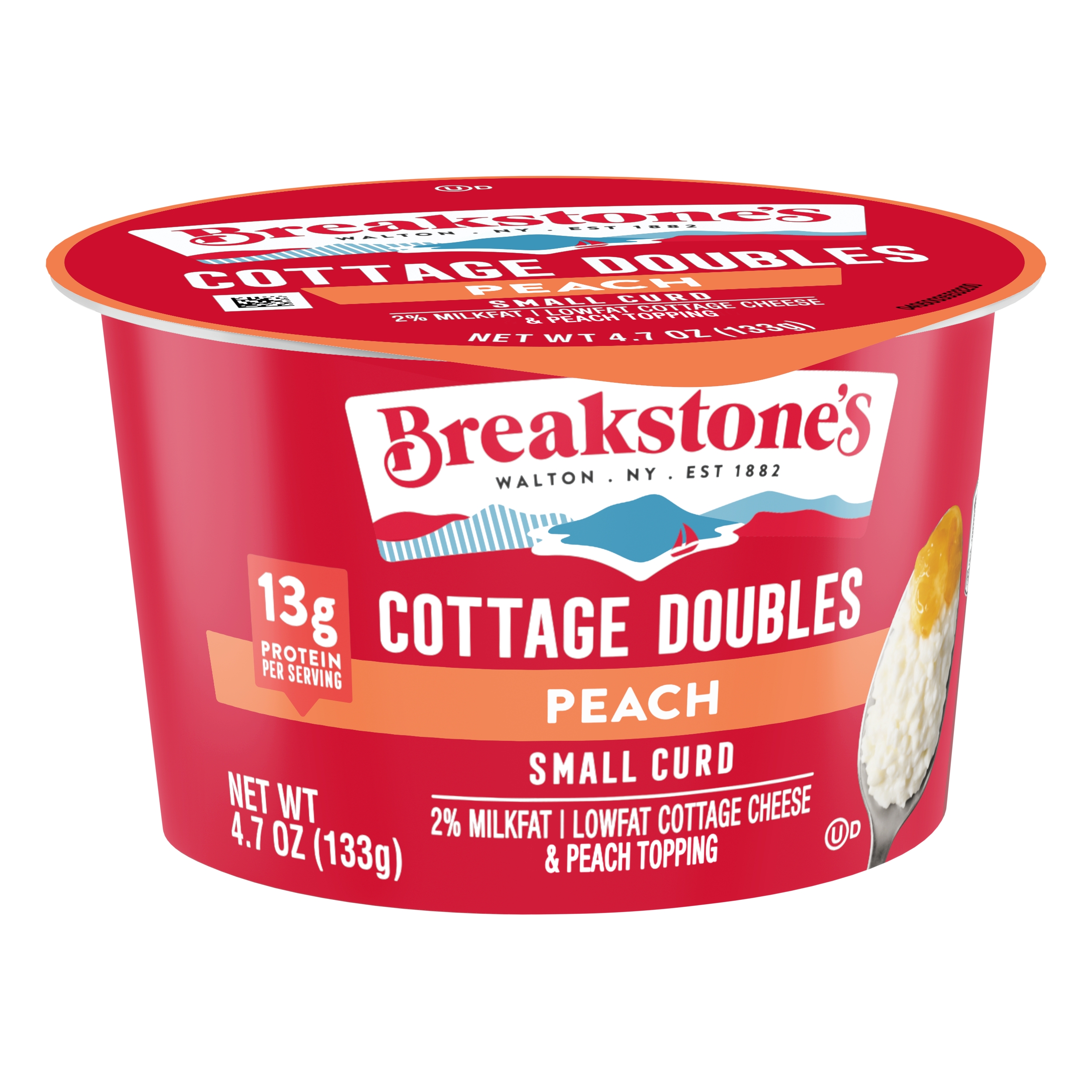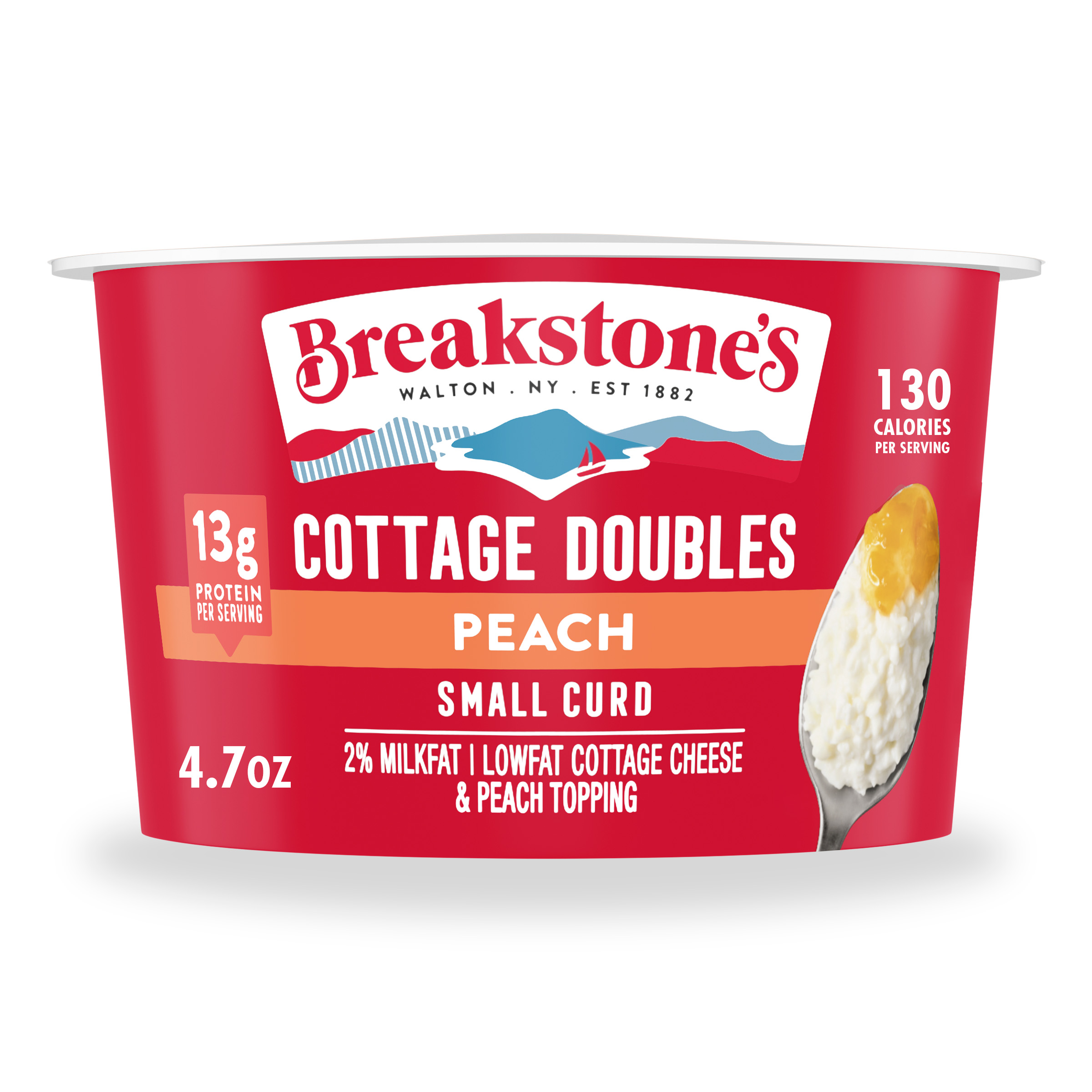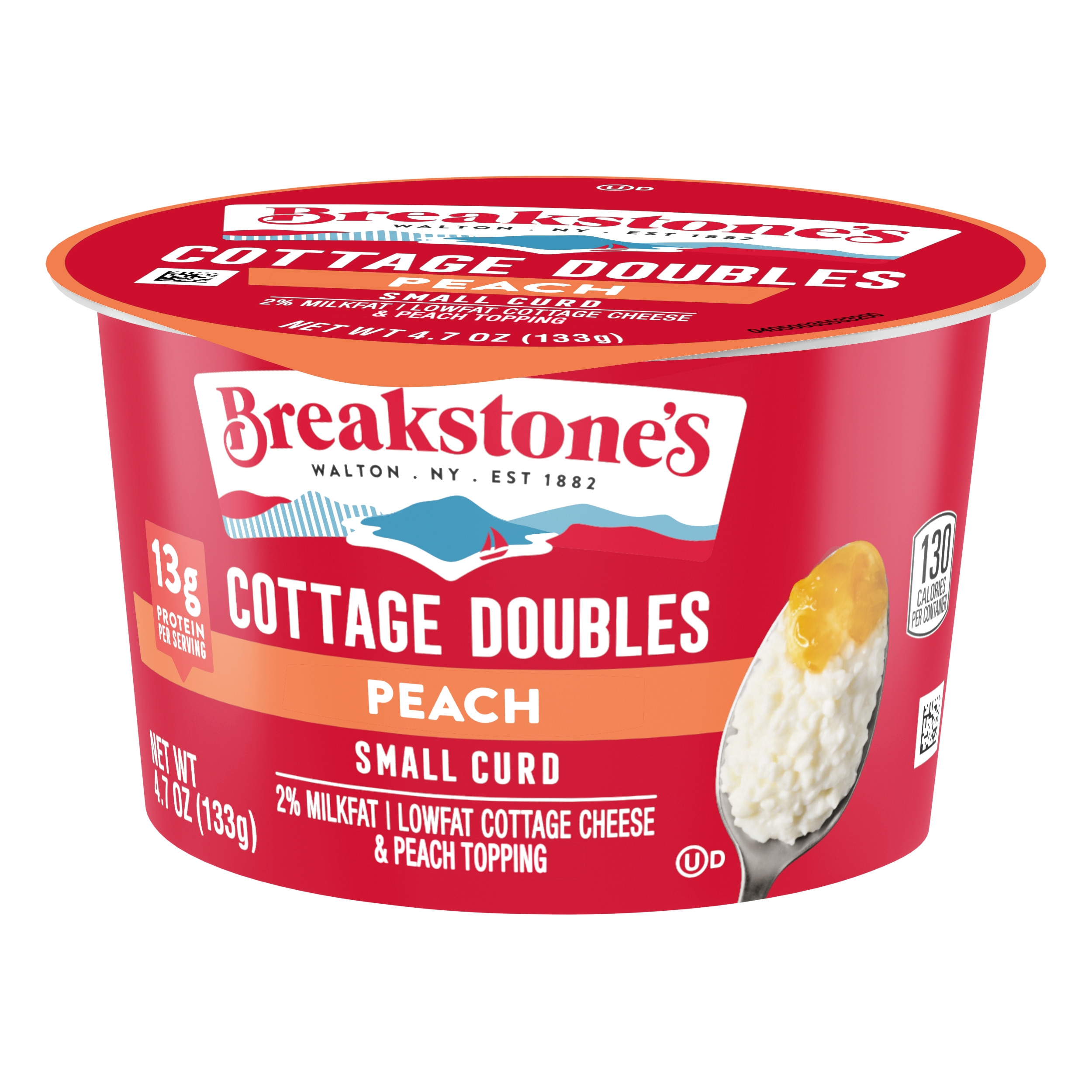| Marketing Message | Breakstone’s Cottage Doubles Lowfat Cottage Cheese with 2% Milkfat and Peach Topping is delicious, creamy, and packed with protein. Enjoyed as a protein snack for breakfast, lunch, or as a work out snack, Breakstone’s cottage cheese cups are extremely versatile. With over 140 years of heritage, Breakstone’s pays tribute to cultured dairy by bringing delicious high-quality dairy to your home. |