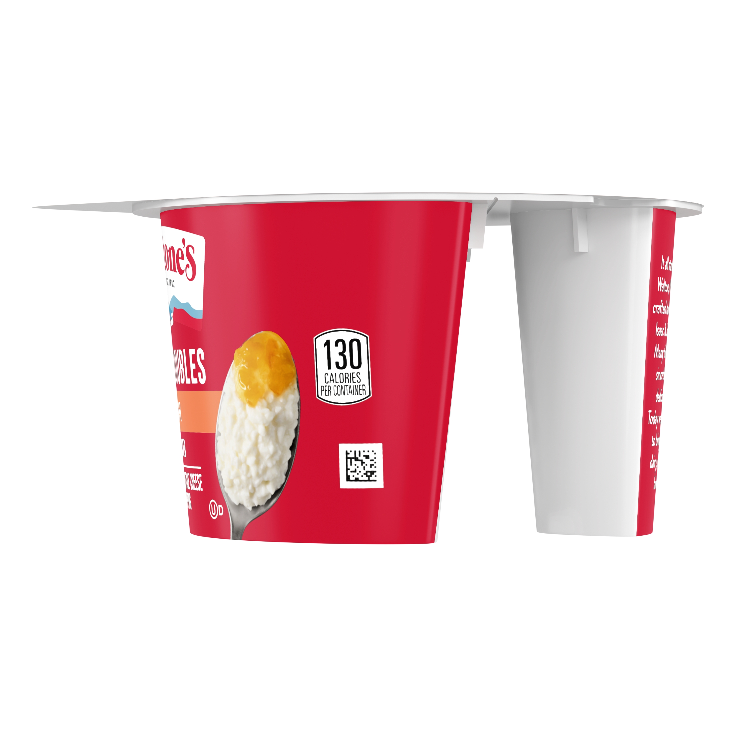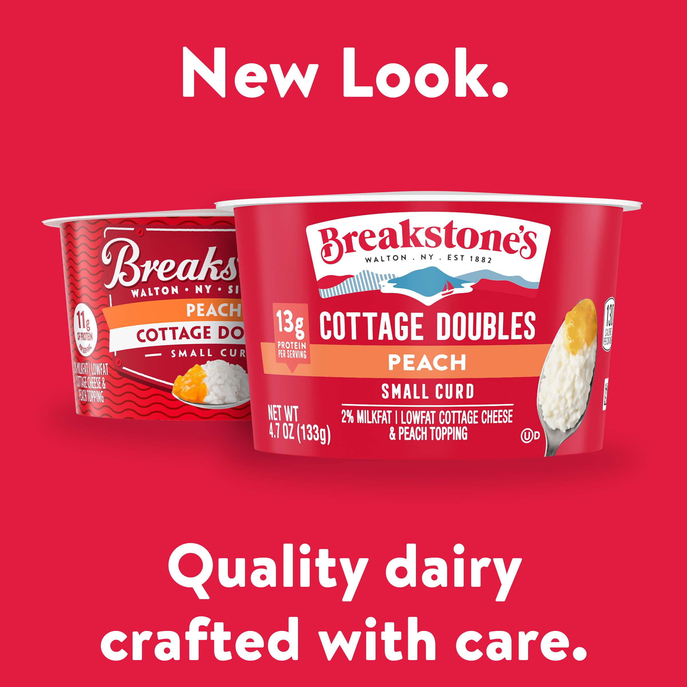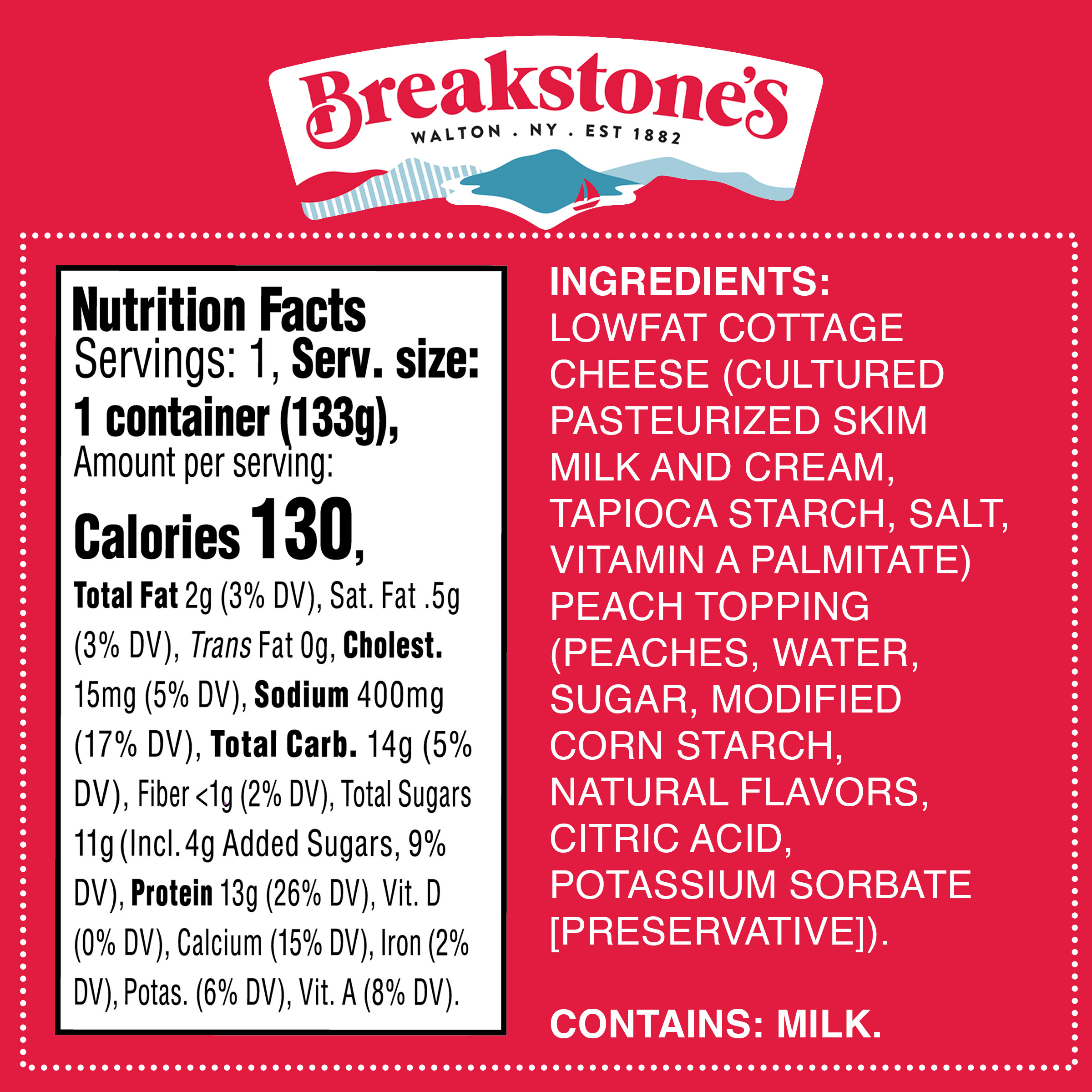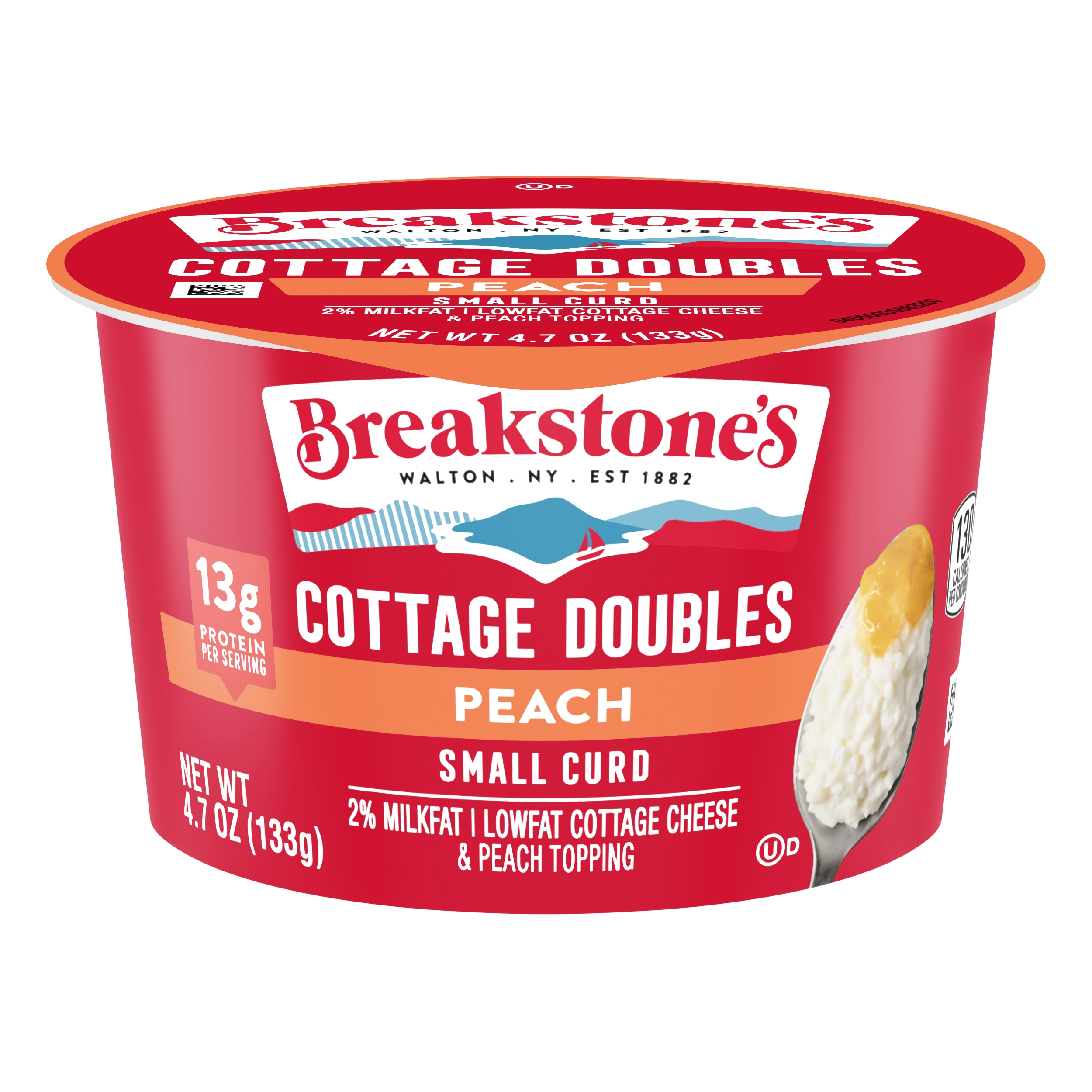 | Marketing Message | Breakstone’s Cottage Doubles Lowfat Cottage Cheese with 2% Milkfat and Peach Topping is delicious, creamy, and packed with protein. Enjoyed as a protein snack for breakfast, lunch, or as a work out snack, Breakstone’s cottage cheese cups are extremely versatile. With over 140 years of heritage, Breakstone’s pays tribute to cultured dairy by bringing delicious high-quality dairy to your home. |