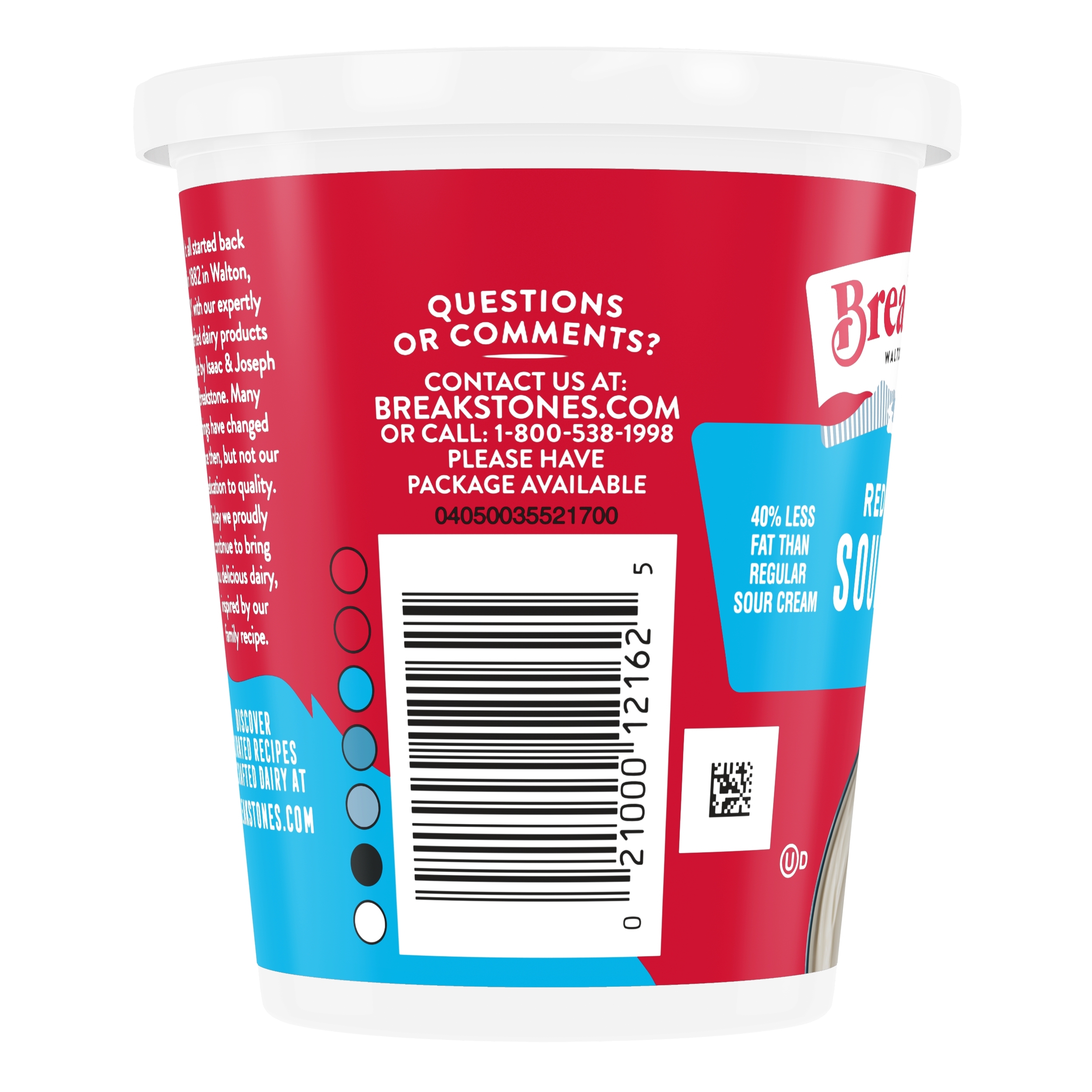 | Marketing Message | Breakstone’s Reduced Fat Sour Cream is delicious, creamy, and versatile. Explore cooking options using Breakstone’s sour cream for a french onion dip, sauces and salad dressing. Or, use it for condiments in a variety of dishes like tacos or a baked potato. With over 140 years of heritage, Breakstone’s pays tribute to cultured dairy by bringing delicious high-quality dairy to your home. |