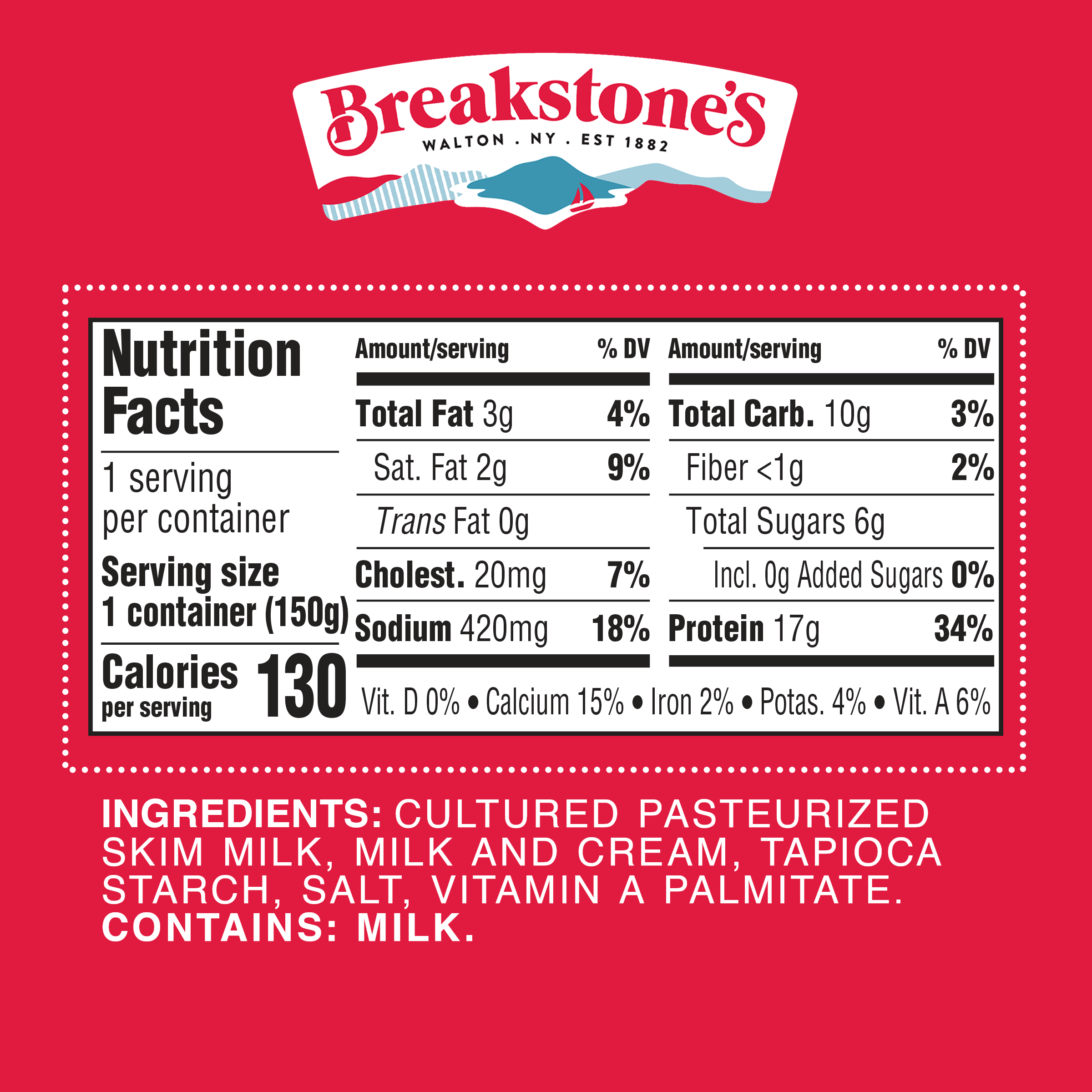 | Feature Bullet 5 | Breakstone’s is a heritage Dairy brand established in 1882 in Walton NY, known for a long history of delicious dairy products |