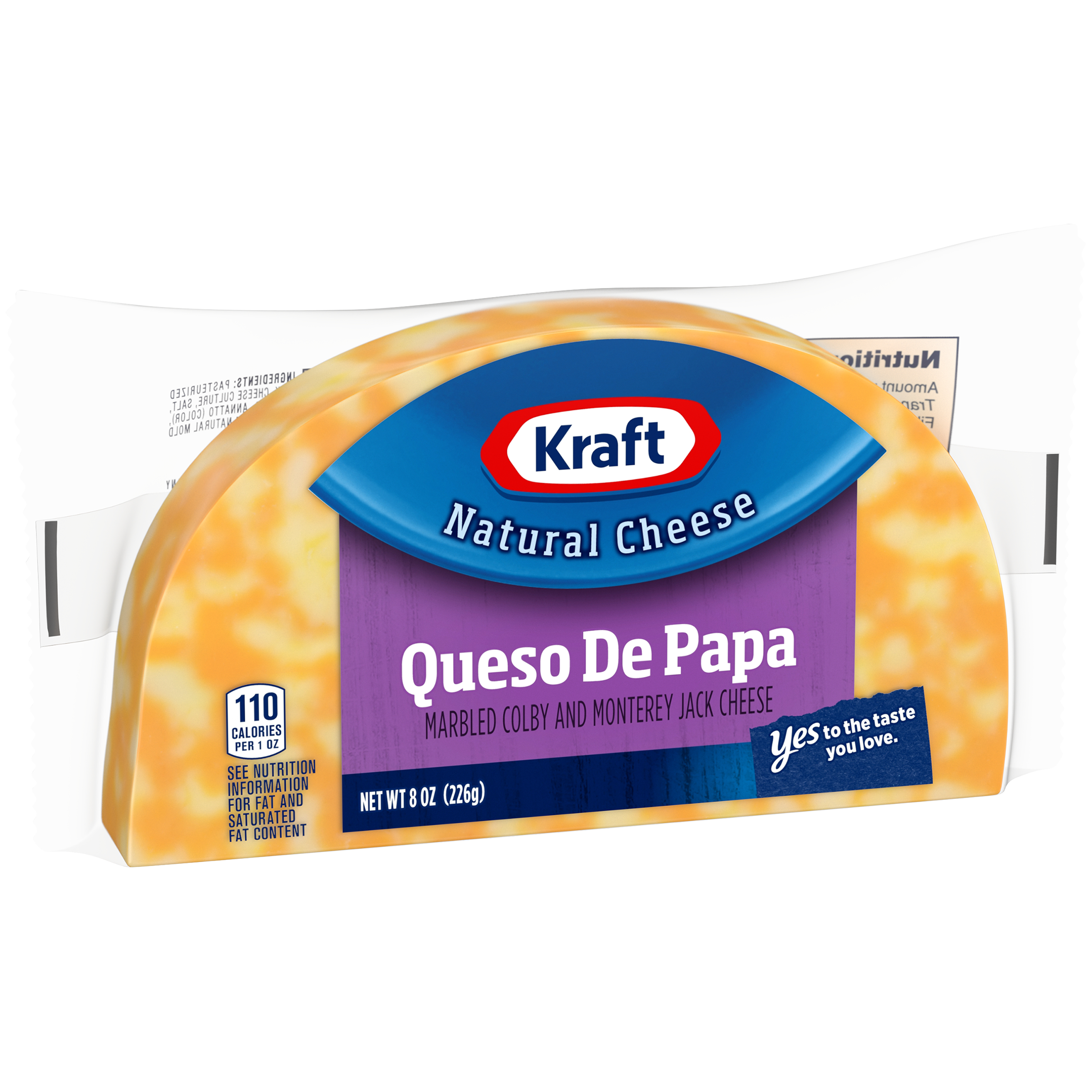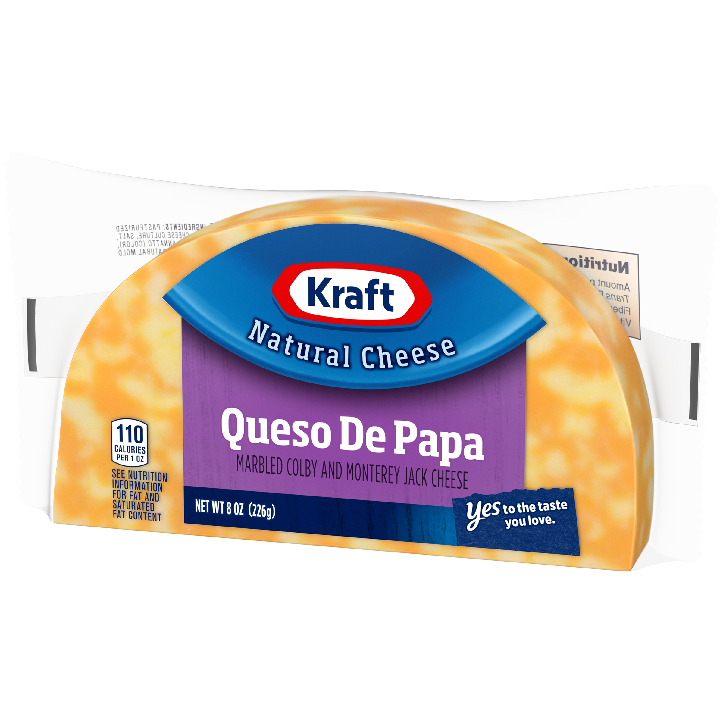 | Marketing Message | Enjoy Kraft Queso de Papa Marbled Colby & Monterey Jack Cheese Blocks! Each block of natural cheese has rich, full flavors perfect for any dish. Shred the cheese for your favorite recipes or cut off slices for entertaining. Always made from fresh milk, Kraft natural blocks of cheese are perfect for your family. For over 100 years, Kraft has been making the cheese your family loves. So, no matter how you like it, we’ve got a cheese for you. |