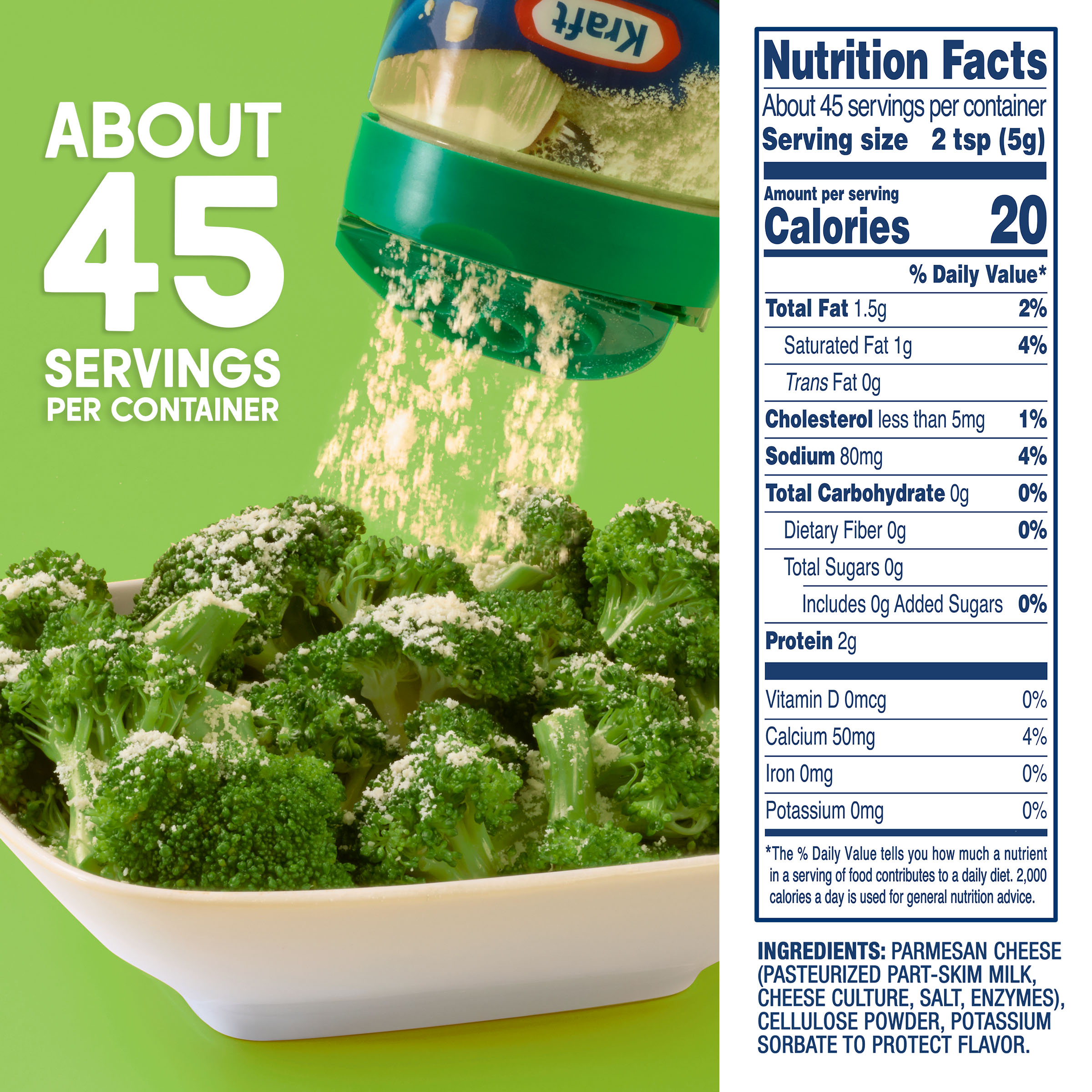 | Marketing Message | Kraft Grated Parmesan Cheese enhances your pastas, pizzas, seafood, salads and more with the bold taste of Kraft grated cheese. The sharp and tangy flavor complements your favorite recipes, and its pre-grated to save you valuable prep time in the kitchen. This cheese is sure to add great nutty and salty flavor to your favorite meals at any occasion. |