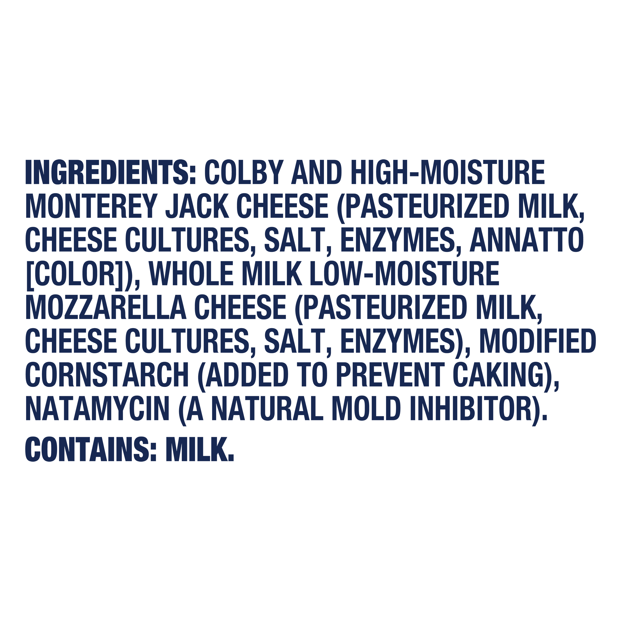 | Feature Bullet 3 | A delicious, mouthwatering blend of rich Cheddar cheese shreds and creamy, whole milk, low-moisture Mozzarella cheese shreds elevate even the simplest family recipe to restaurant-quality results. |
